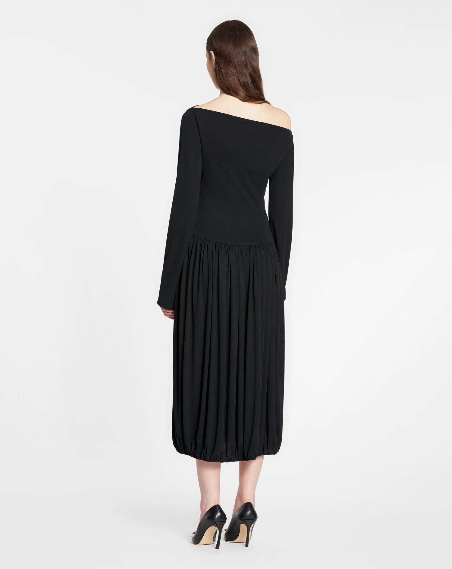 - Asymmetric top long sleeve draped midi dress in fluid crepe