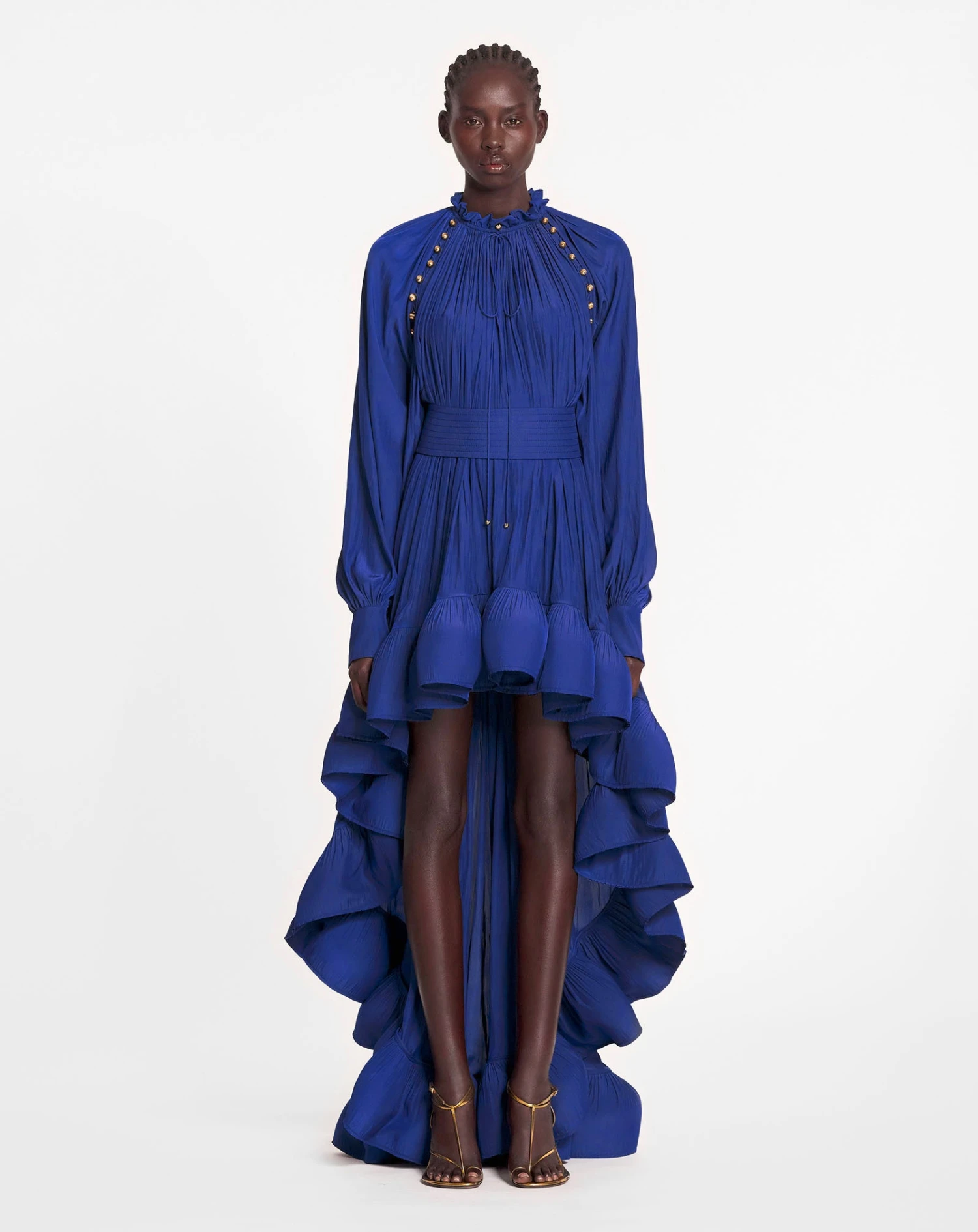 - Asymmetrical flowing Charmeuse fabric dress with long sleeves. The neck tie and fitted waist with a wide belt helps to enhance the silhouette. The horsehair adds volume to the dress.