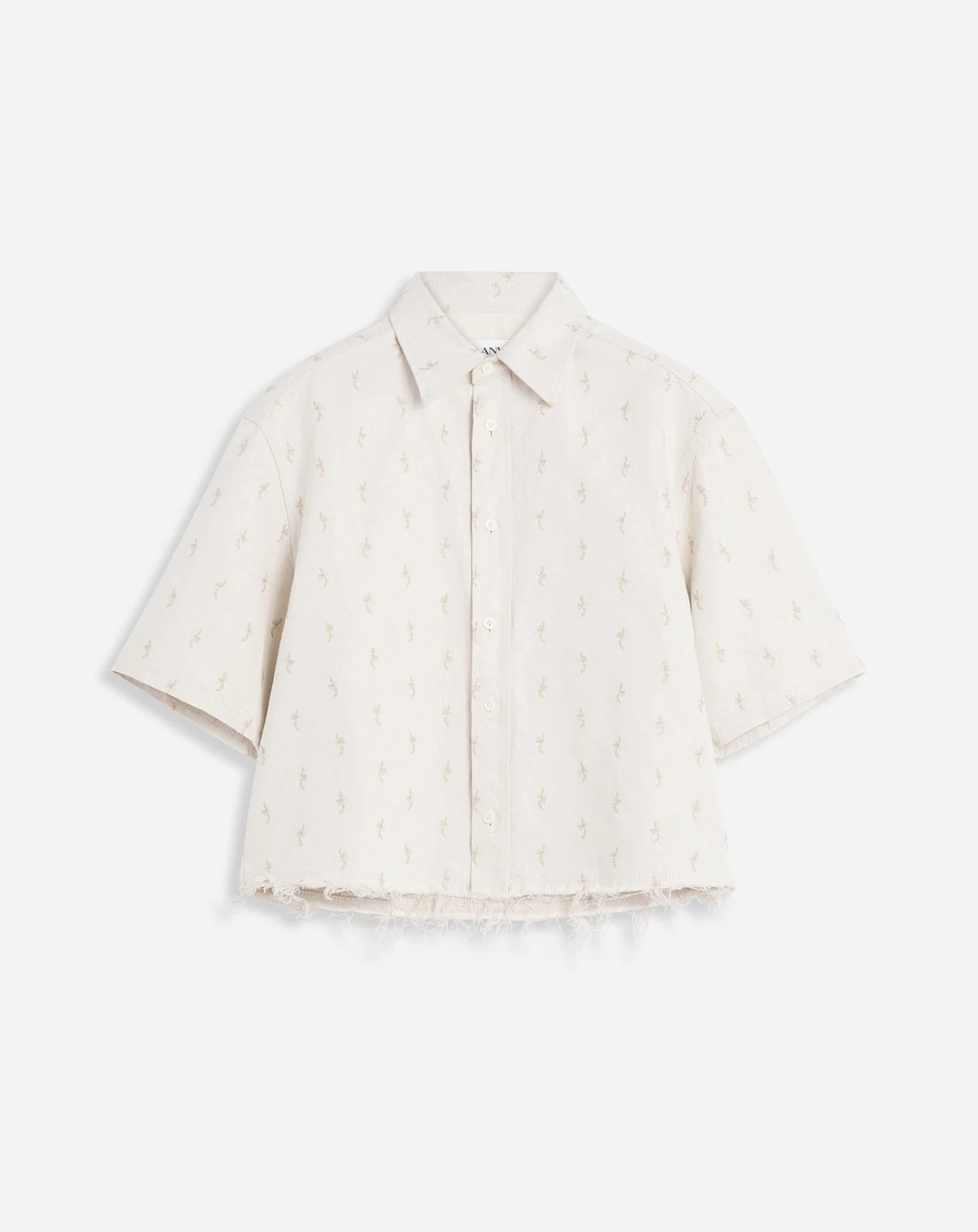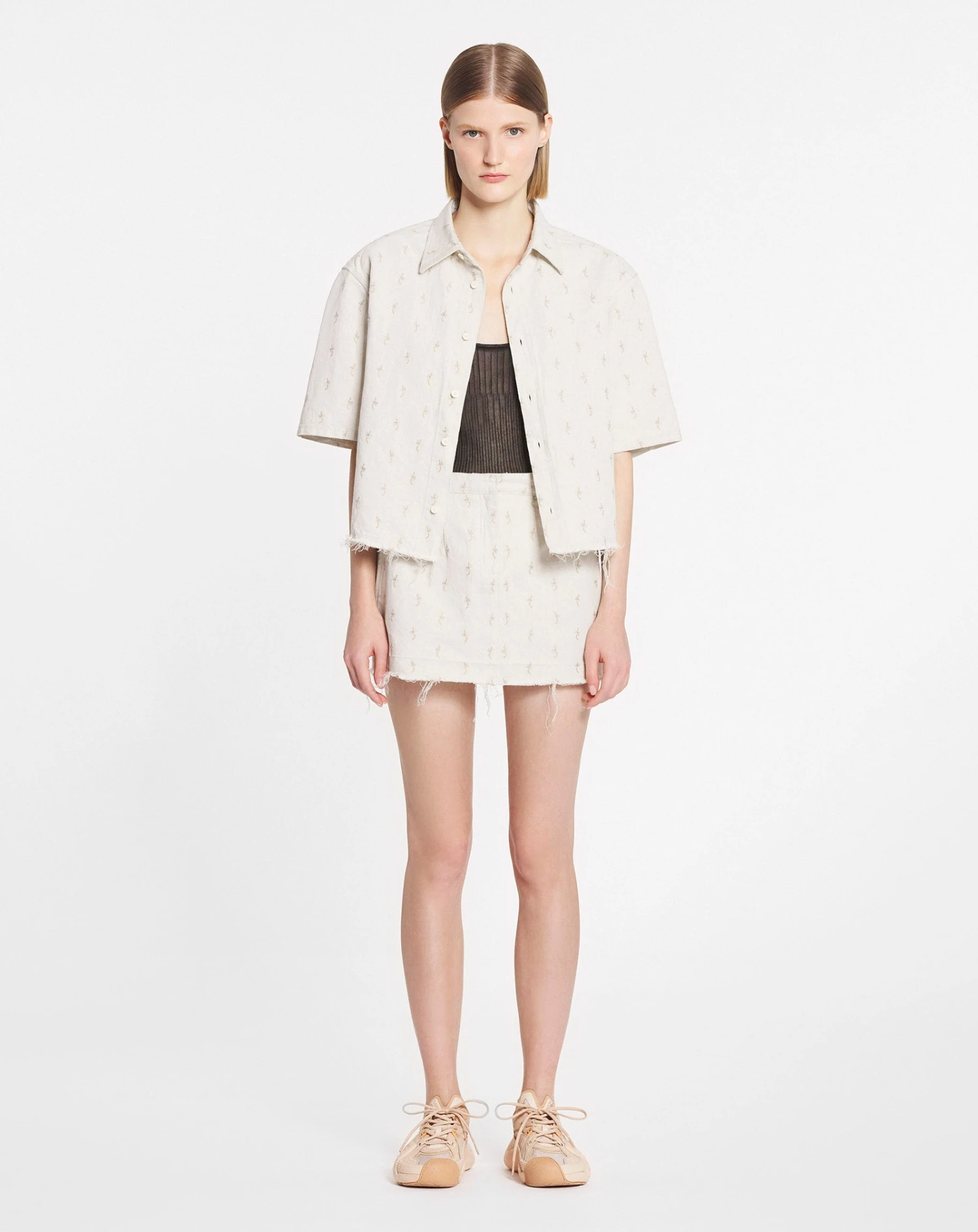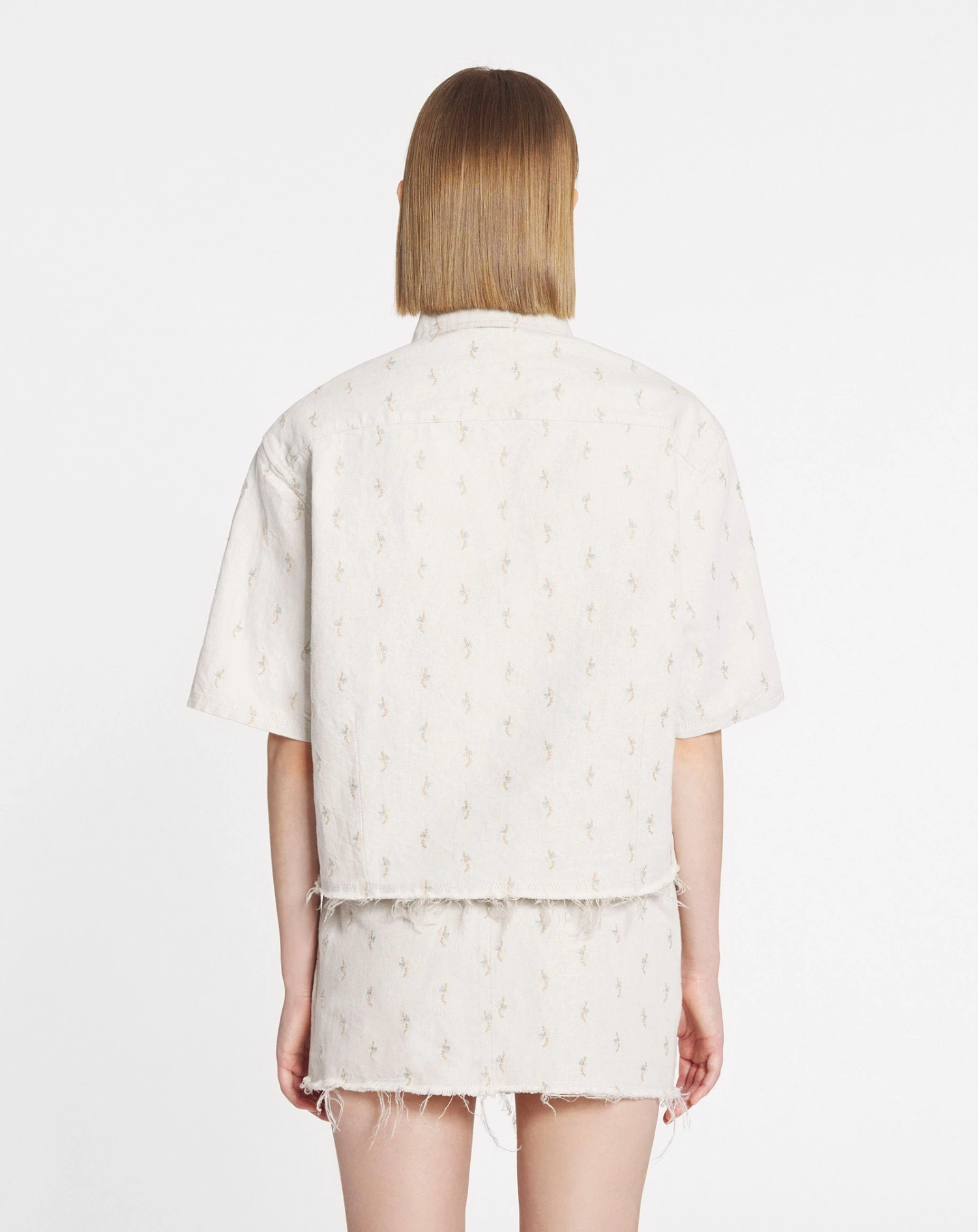 - Cropped denim shirt with short sleeves, a boxy shape, and floral embroidery