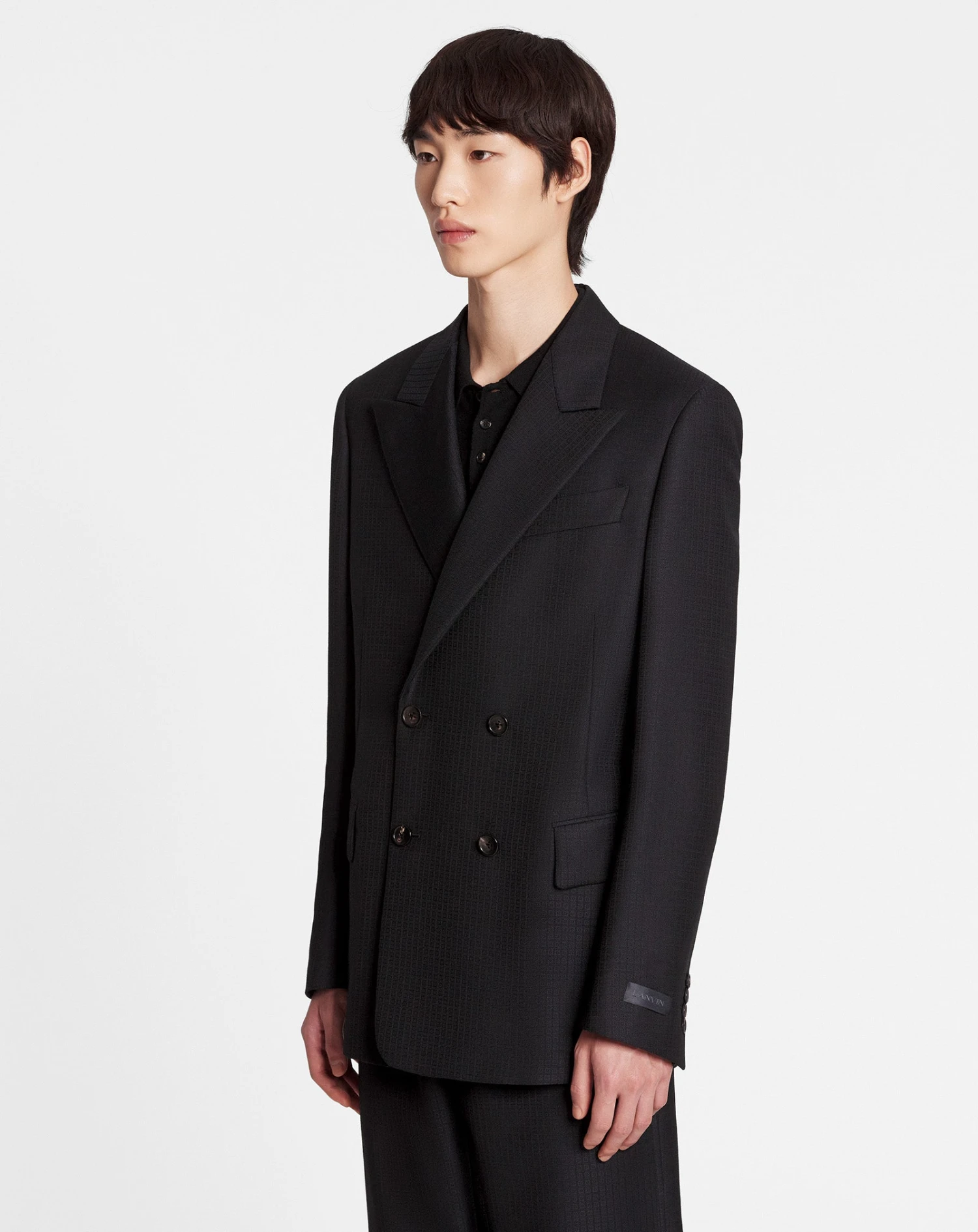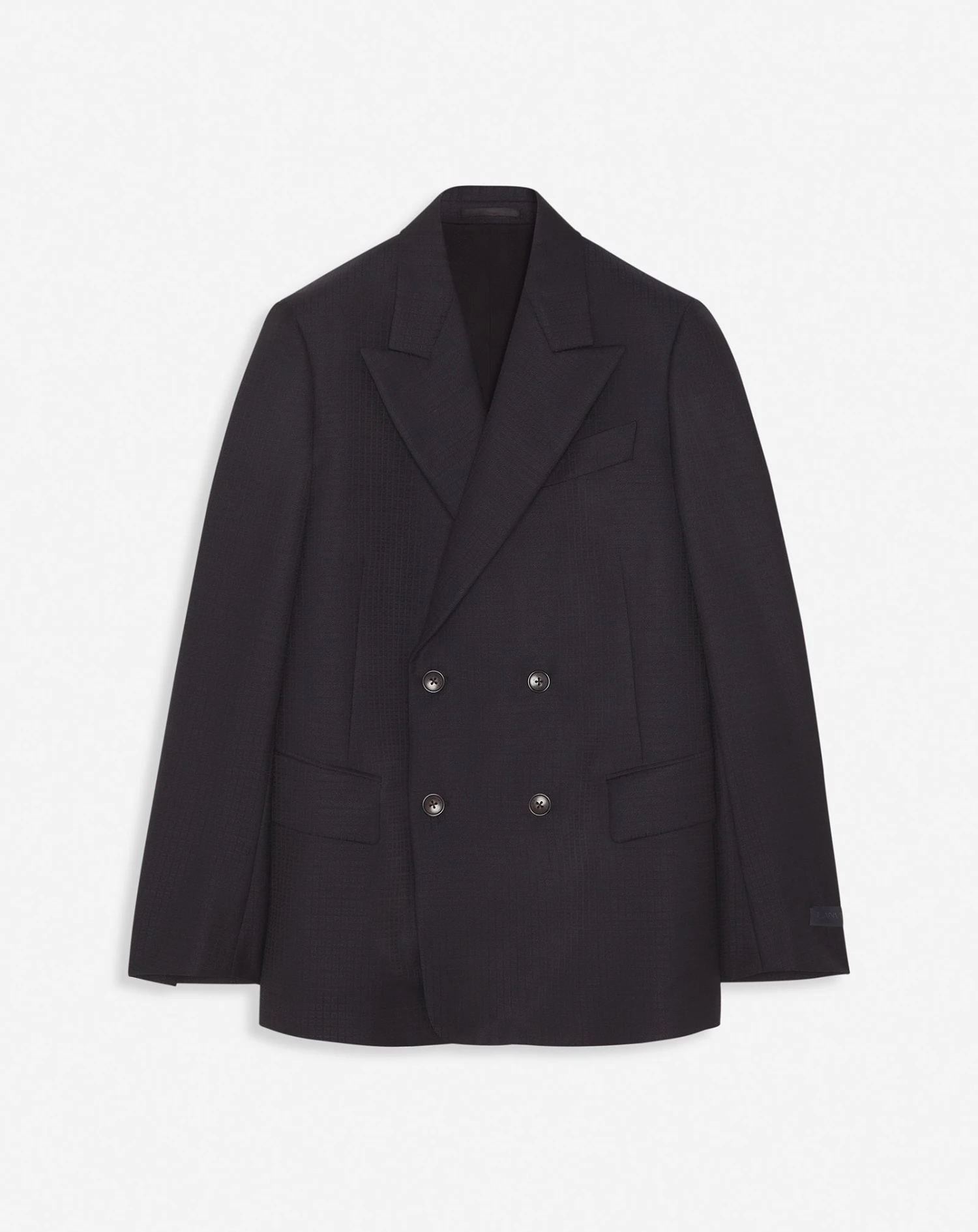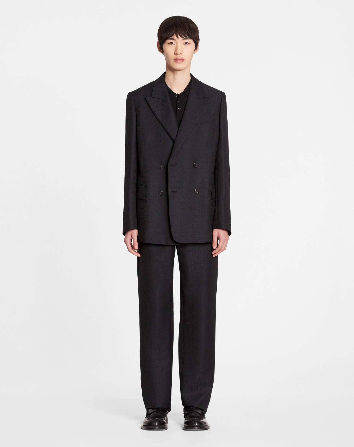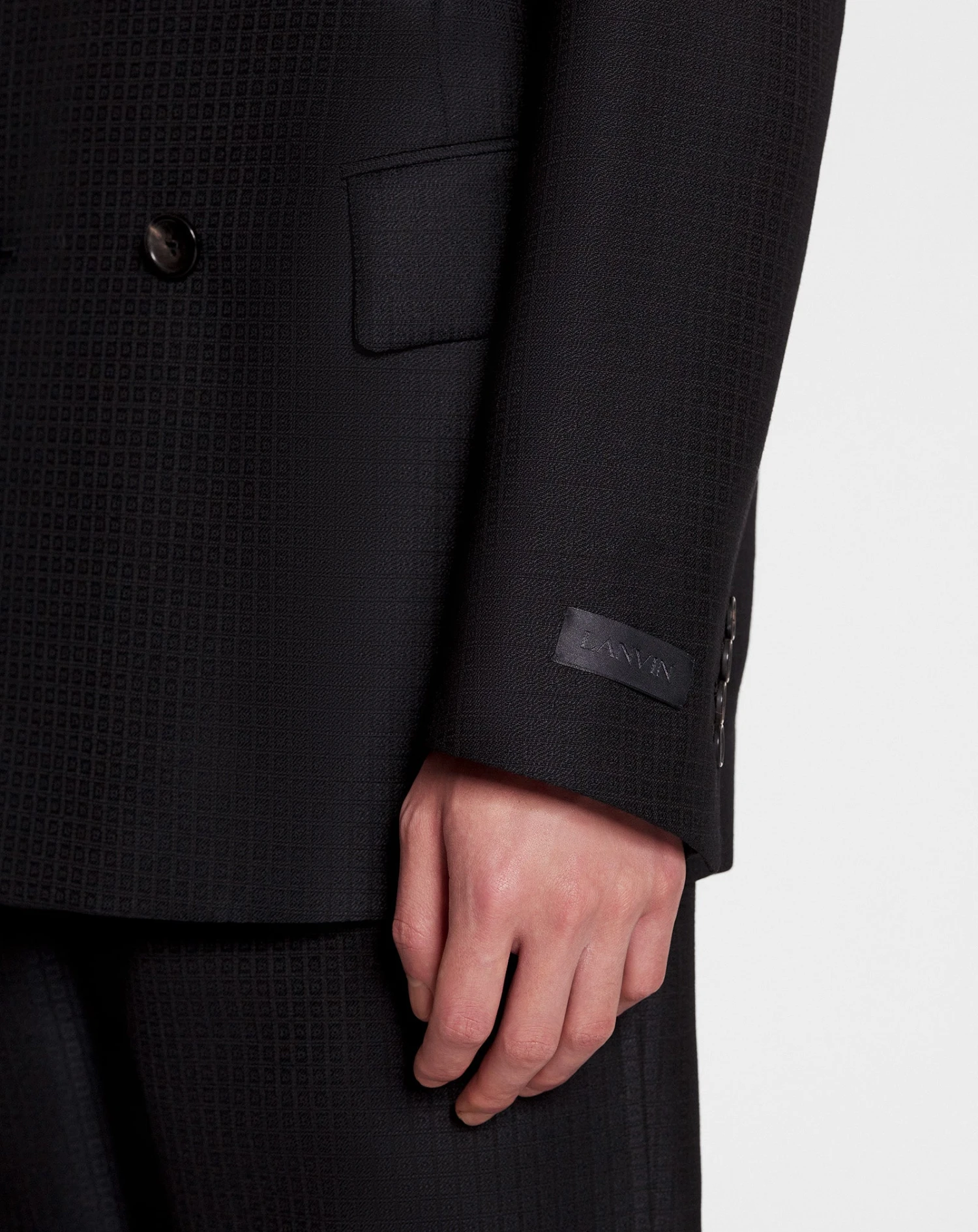 This micro-check jacquard fabric was developed in England exclusively for Lanvin. The jacket’s wool and mohair blend lends a flawless drape and incredible crease-resistance. Its heat-regulating fibers make it the perfect garment for all seasons and occasions.