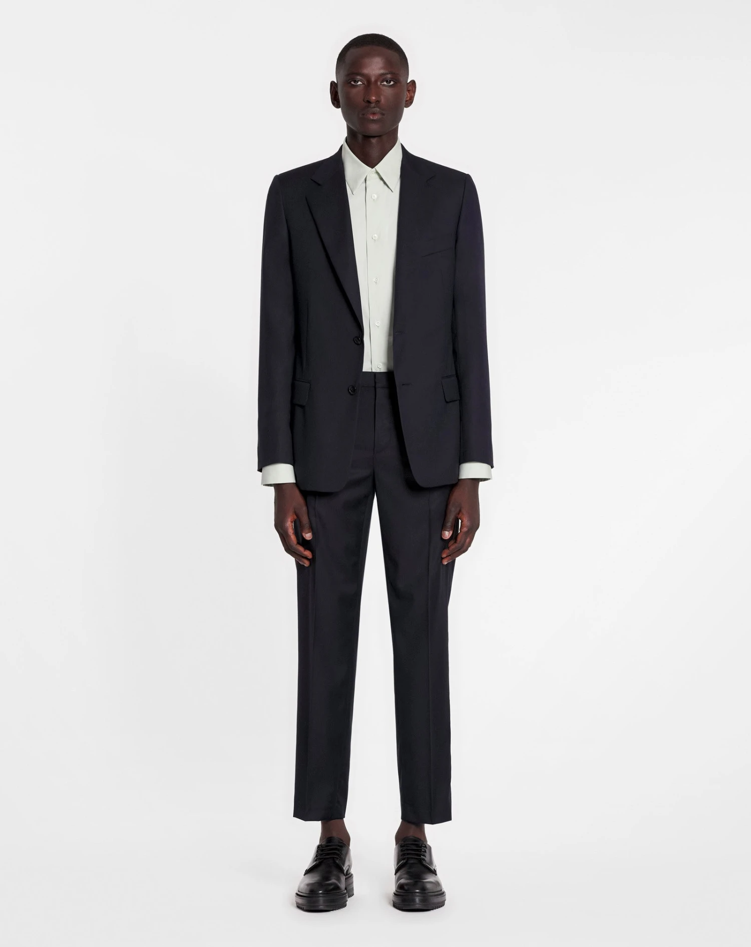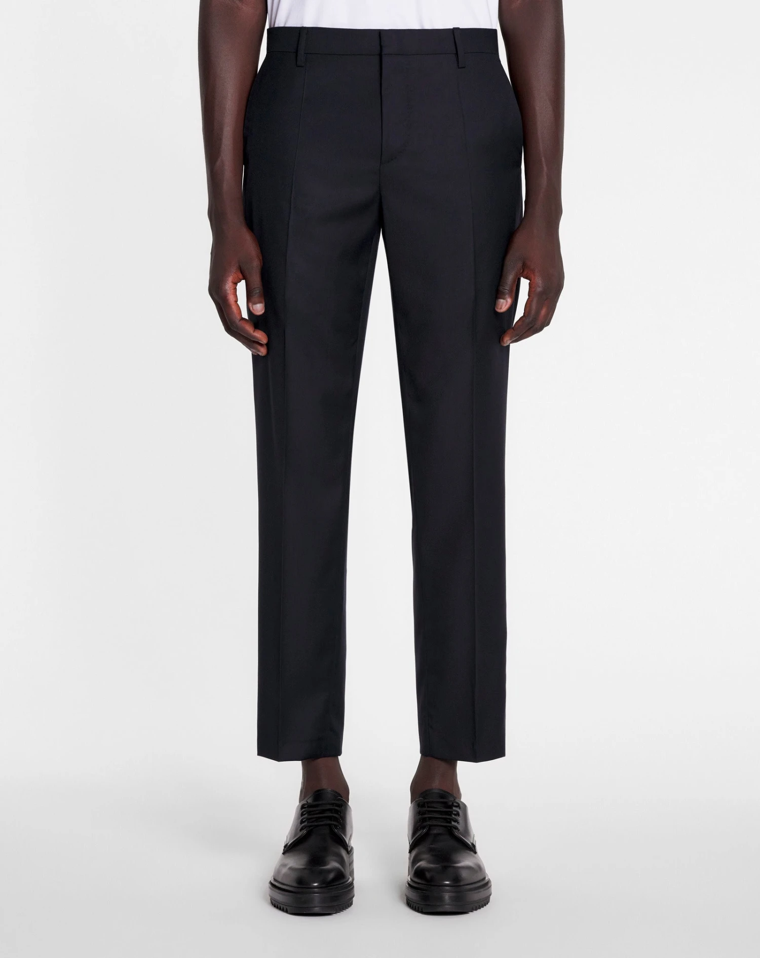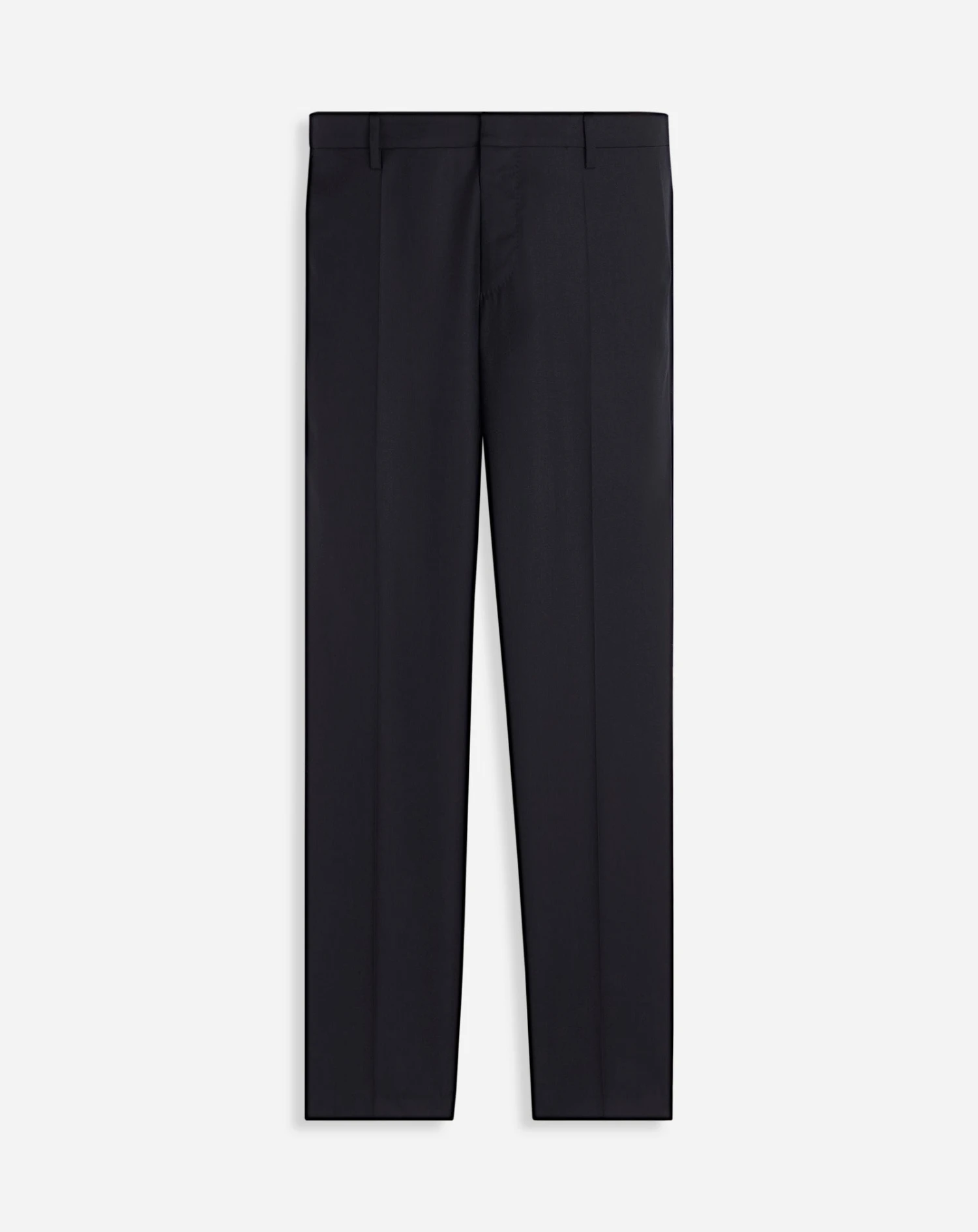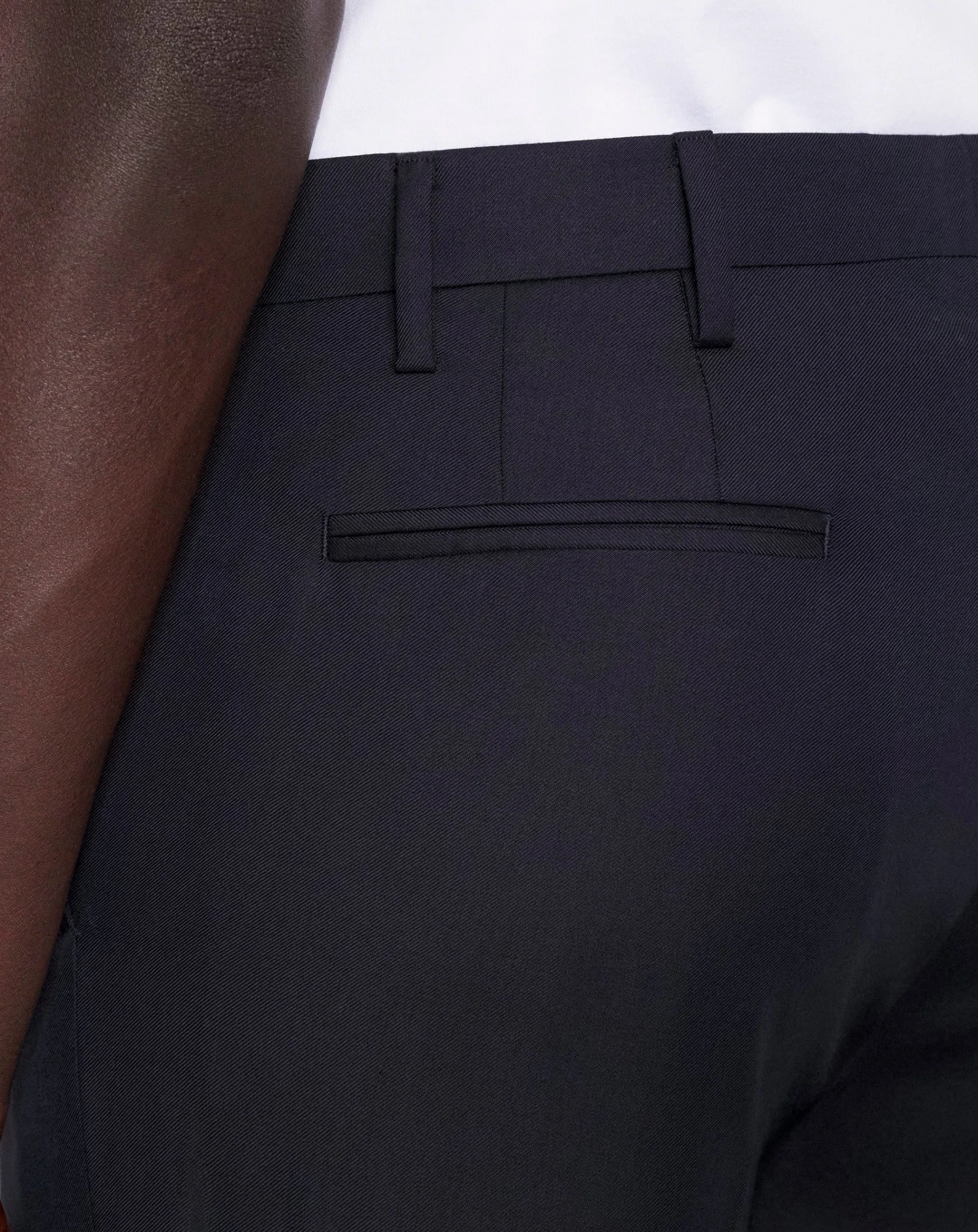 - Cigarette trousers in super150 wool twill with flat front, inseam side pockets, “trompe l’oeil” italian pockets and double jet pockets on the back.
