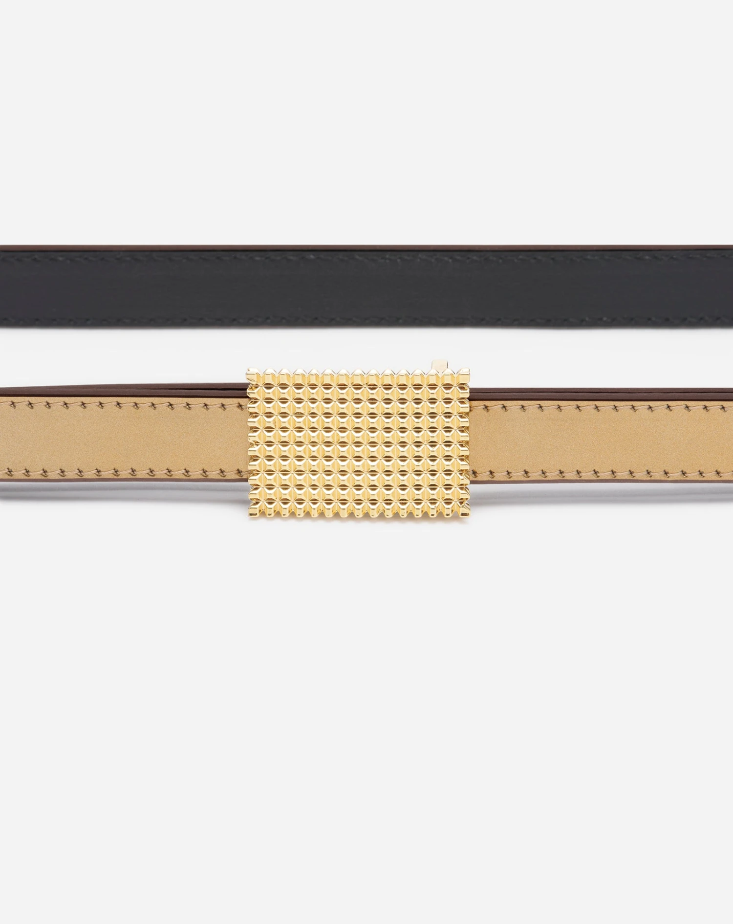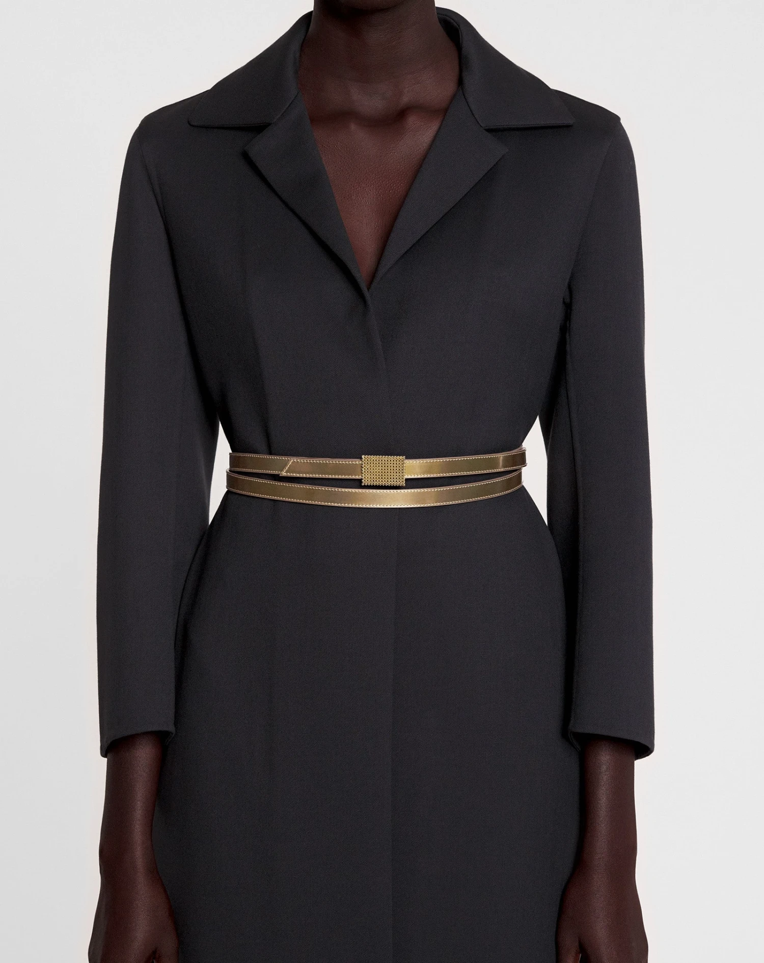 Borrowing the “diamond point” clasp of the Concerto bag, this double-wrap belt accentuates all waists with elegance.