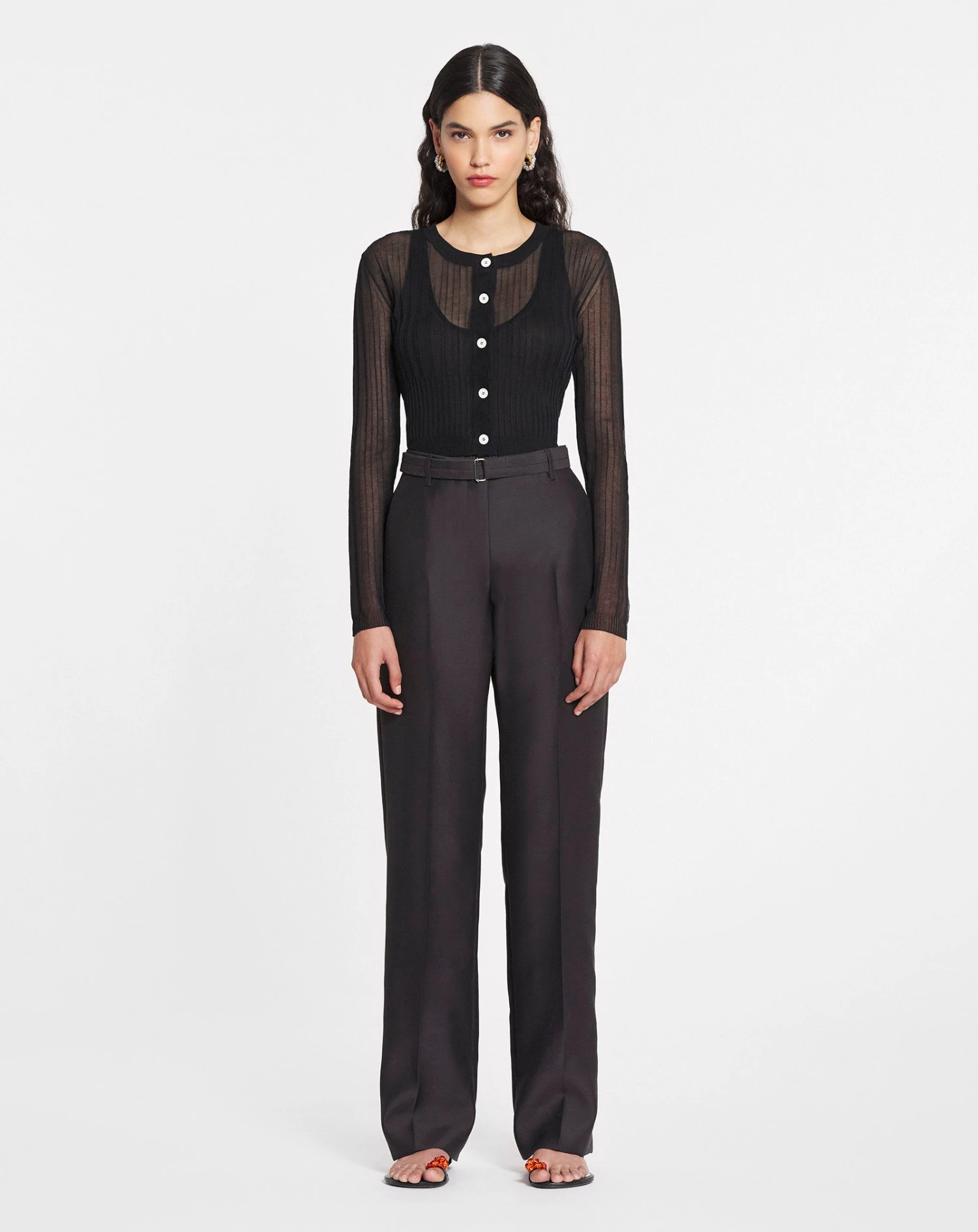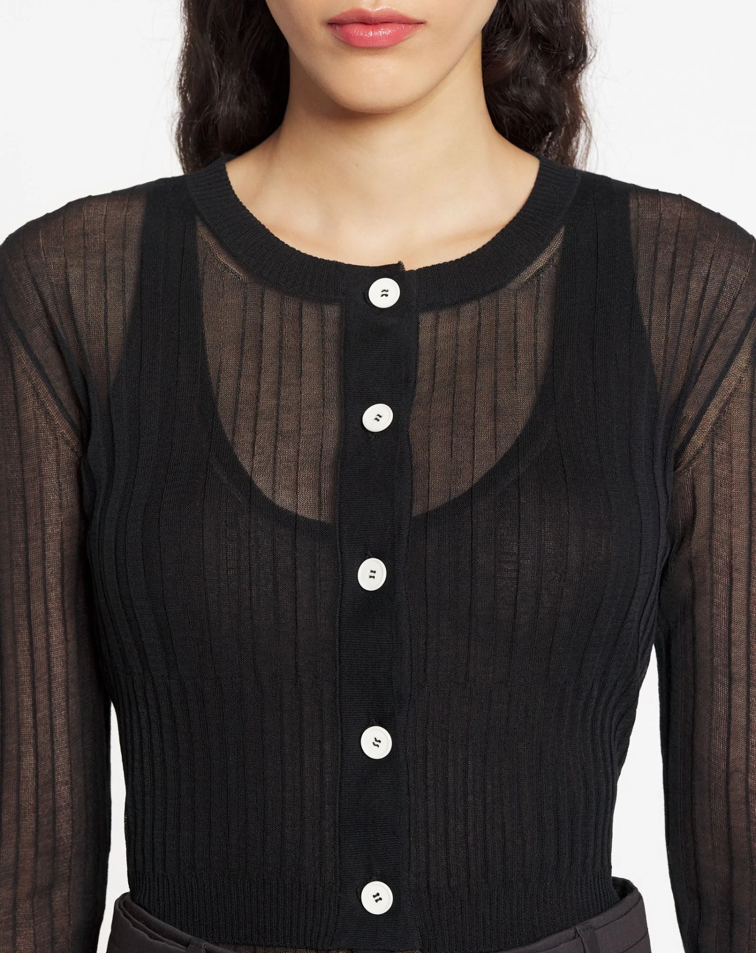- Sheer, fitted, round-neck cardigan in silk and cotton