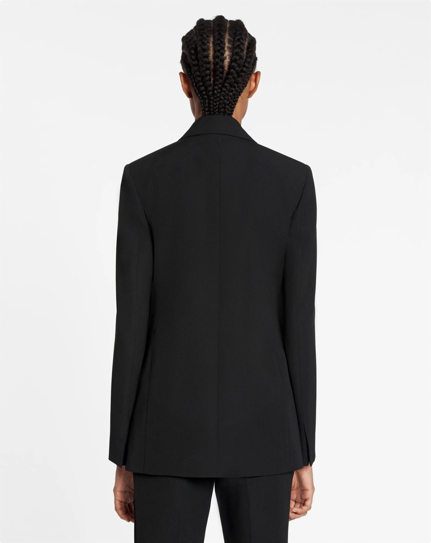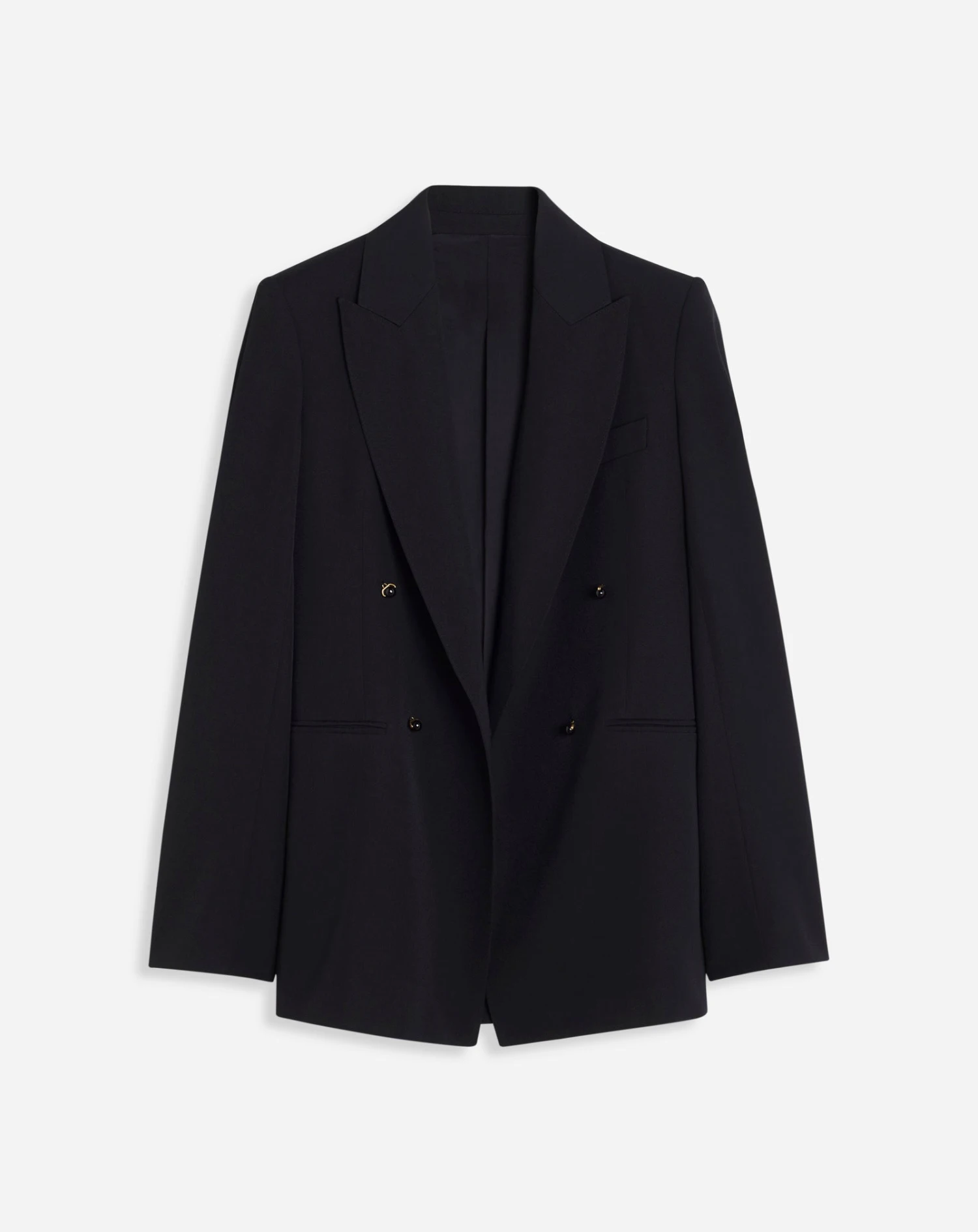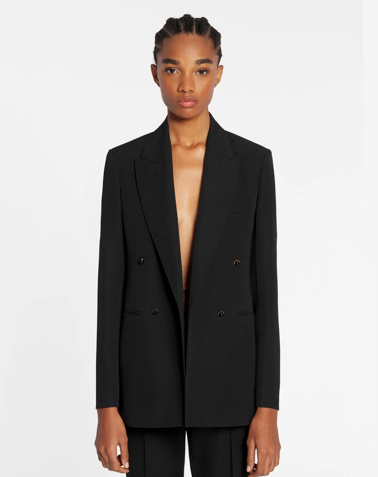 - Double-breasted tailored blazer to be worn unbuttoned featuring peak lapels and jewelled buttons.