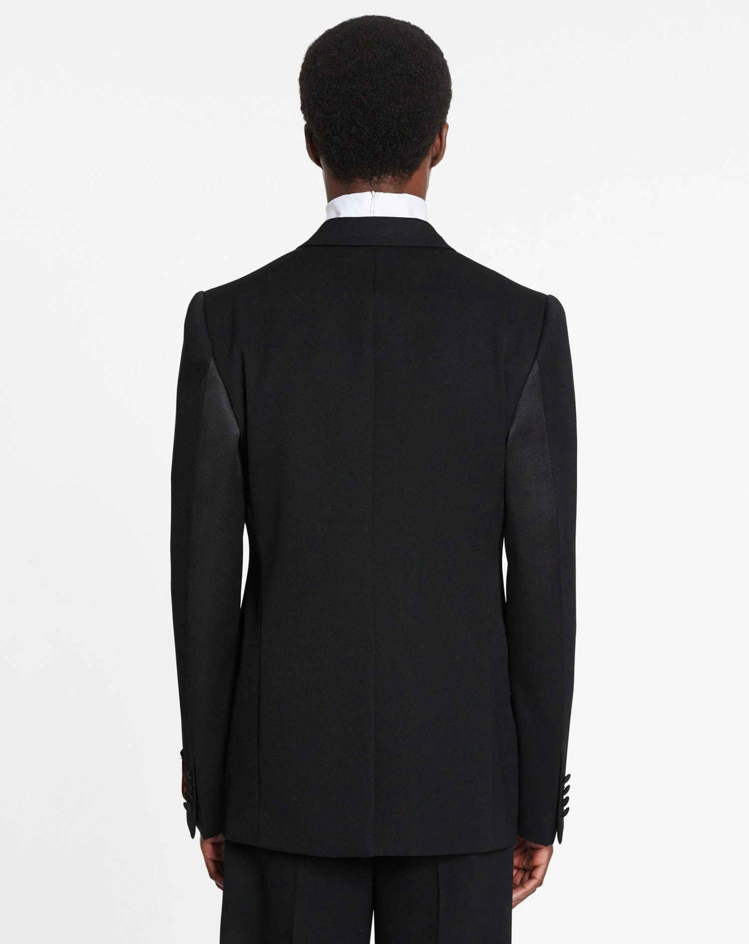 - Black double-breasted tuxedo jacket in wool with square shoulders, fitted waist and tone-on-tone satin insets inside the sleeves.