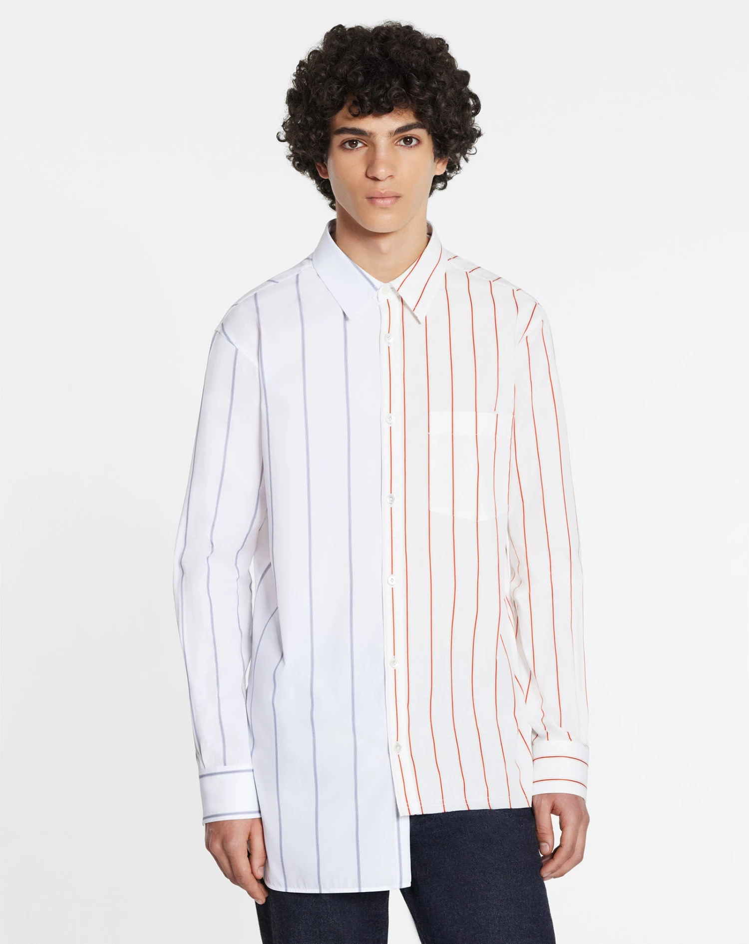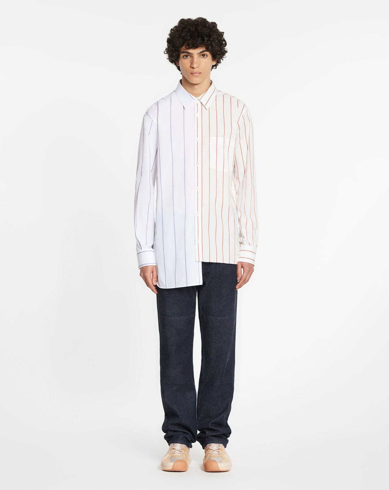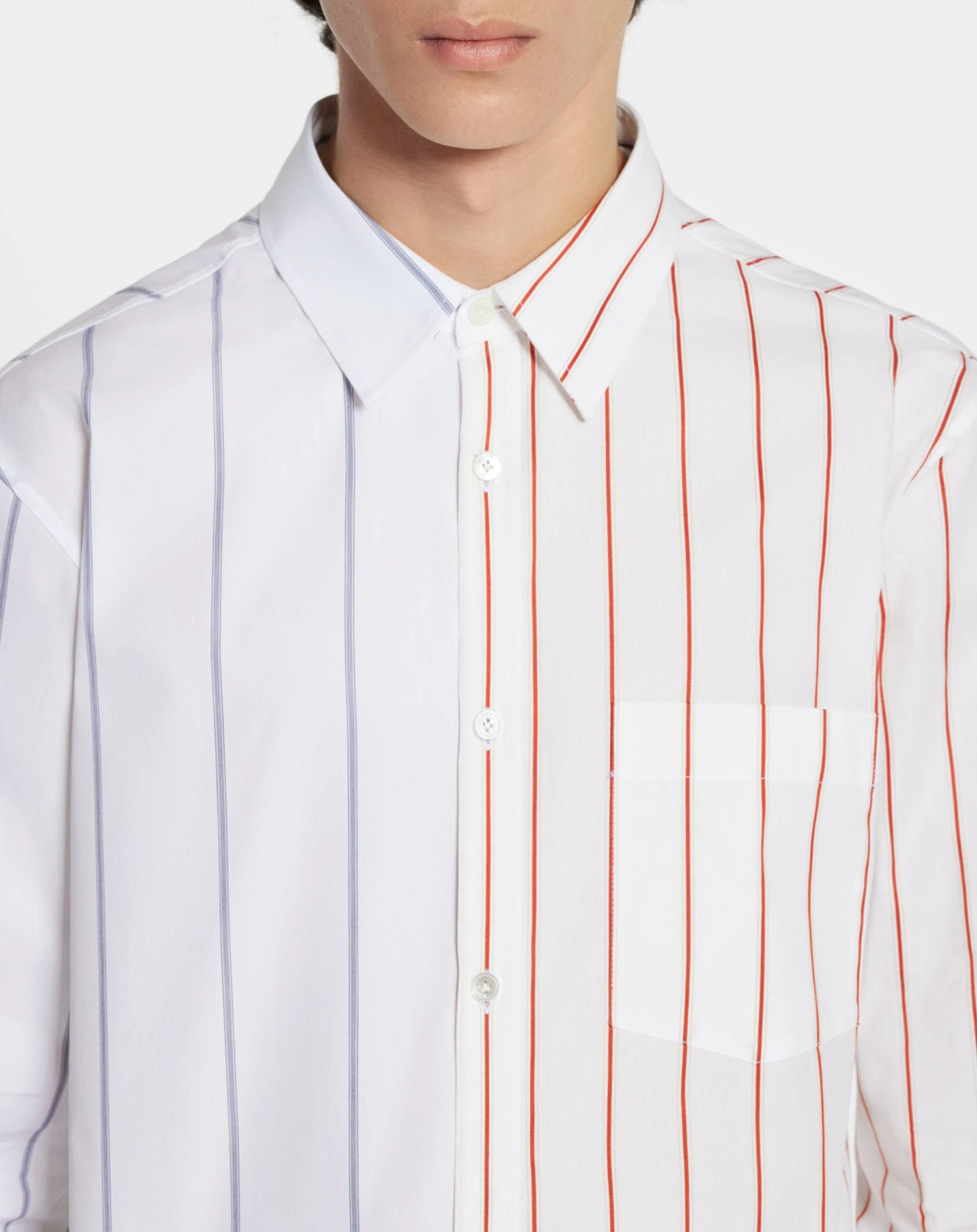- Multicolored cotton poplin dual-print/asymmetrical shirt with a white/blue wide striped poplin panel and a white/red satin contrasting striped poplin panel with patch pocket.