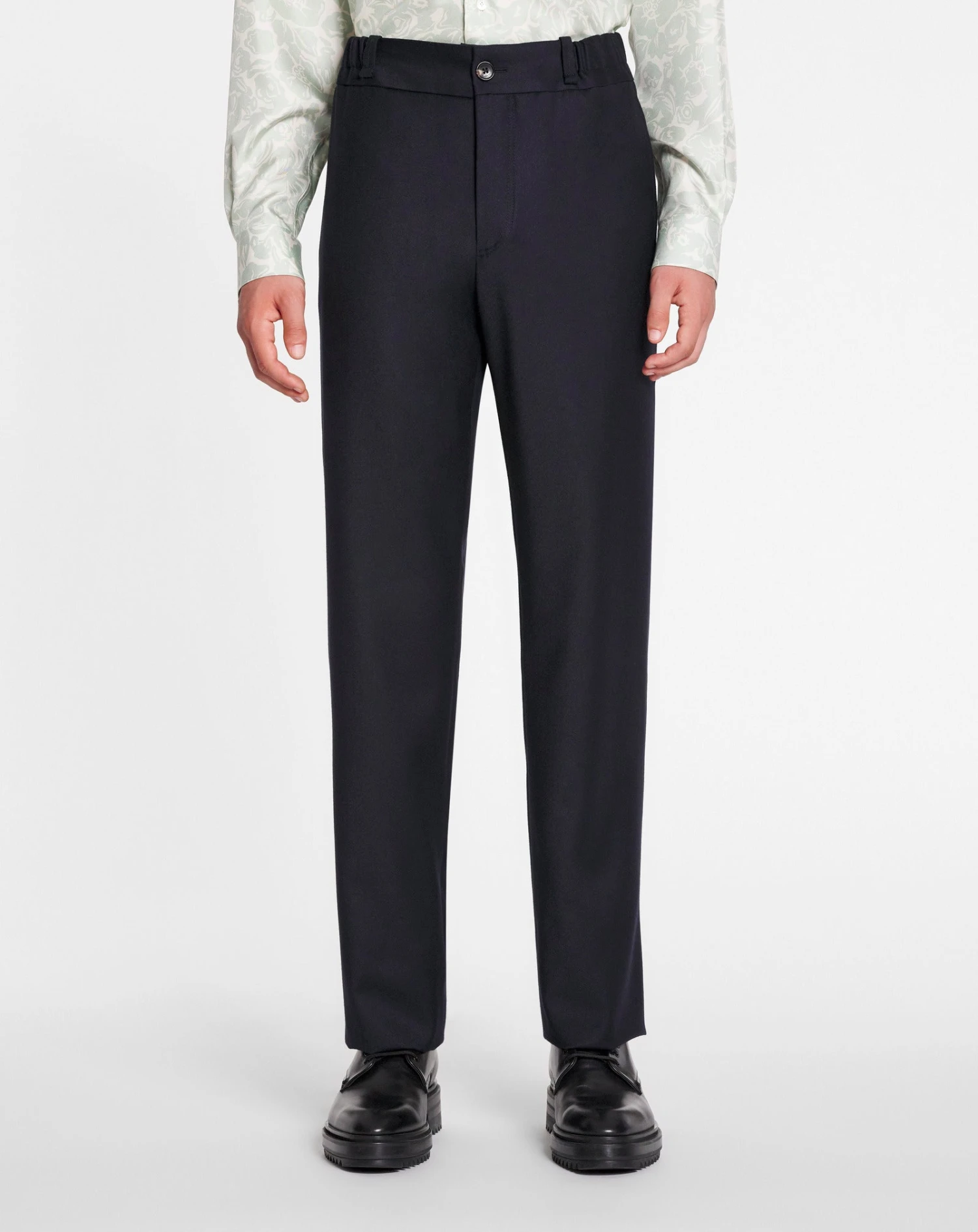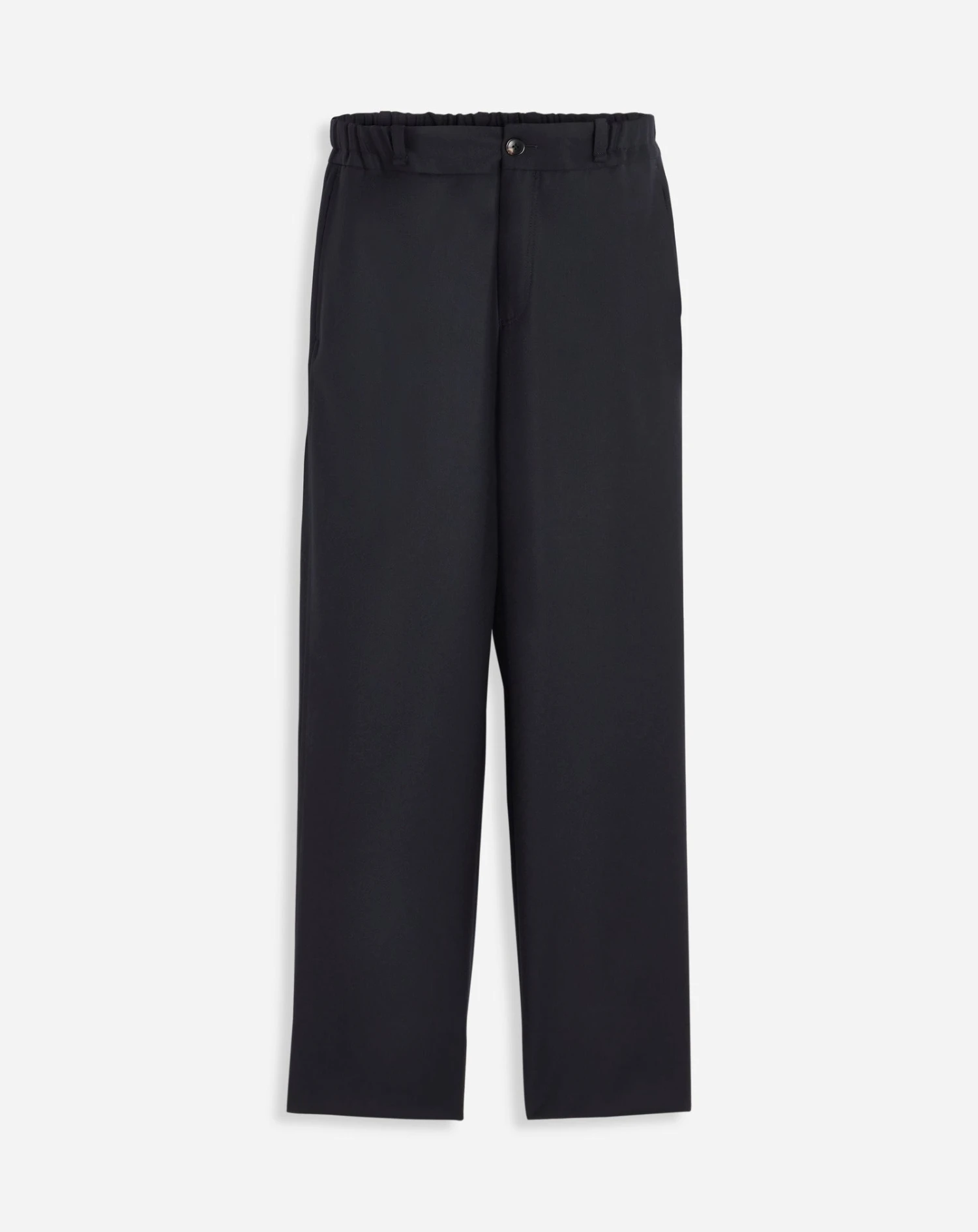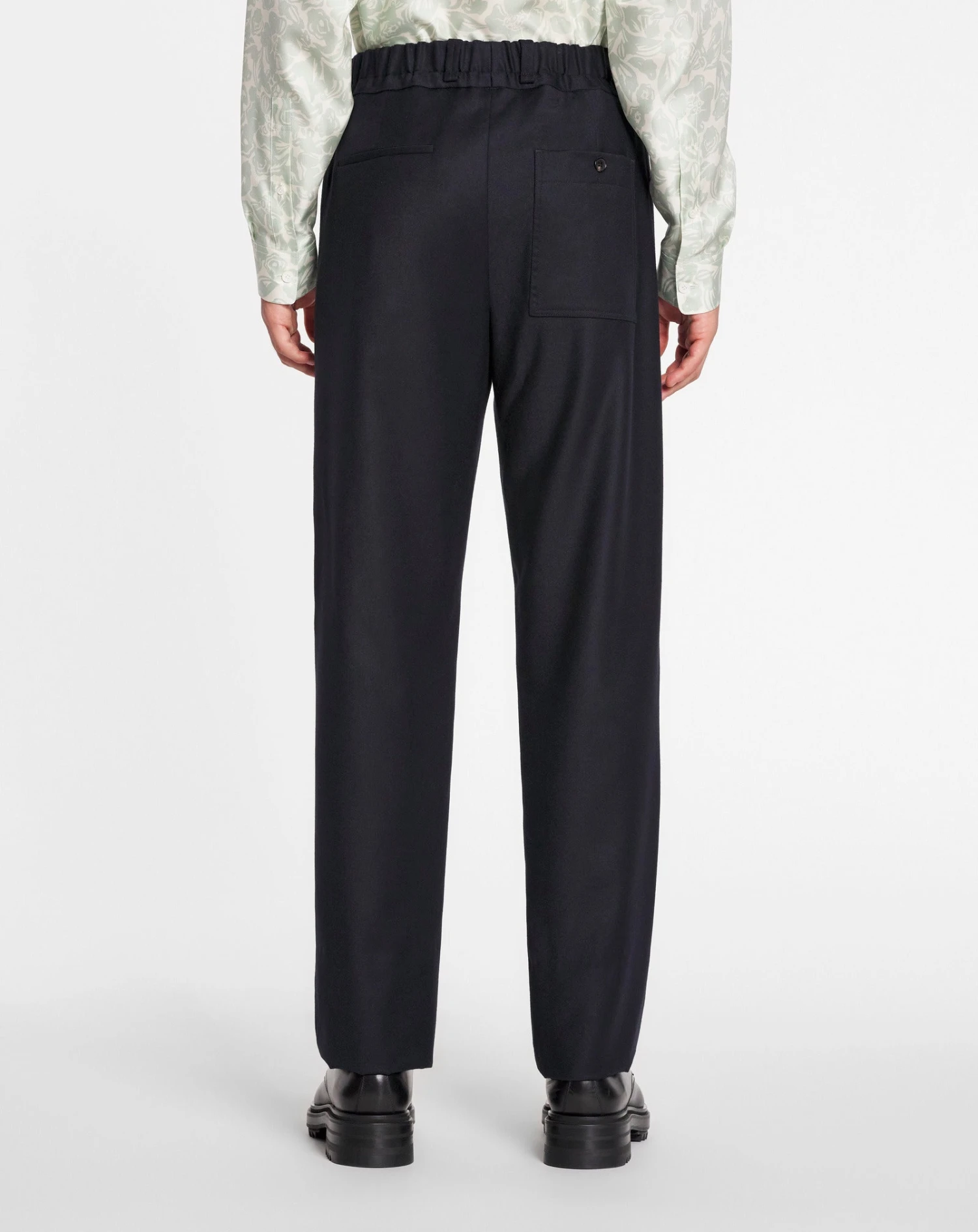 - Tailored elasticated trousers in washed flannel with adjustable hidden drawstrings belt.