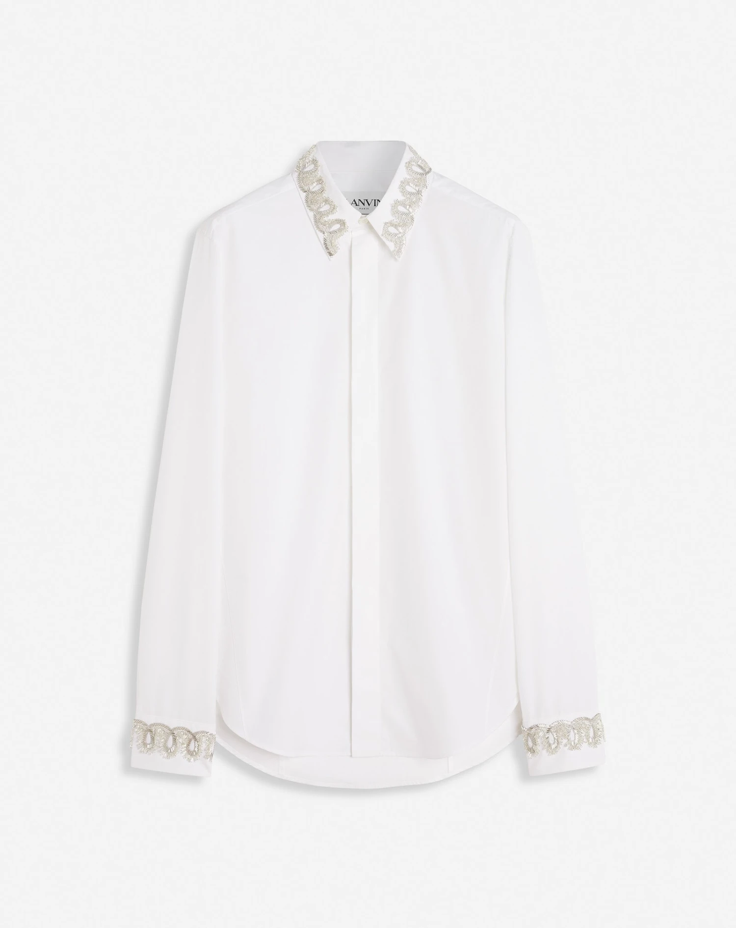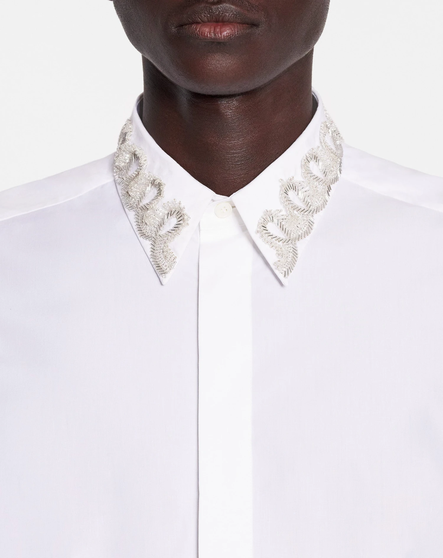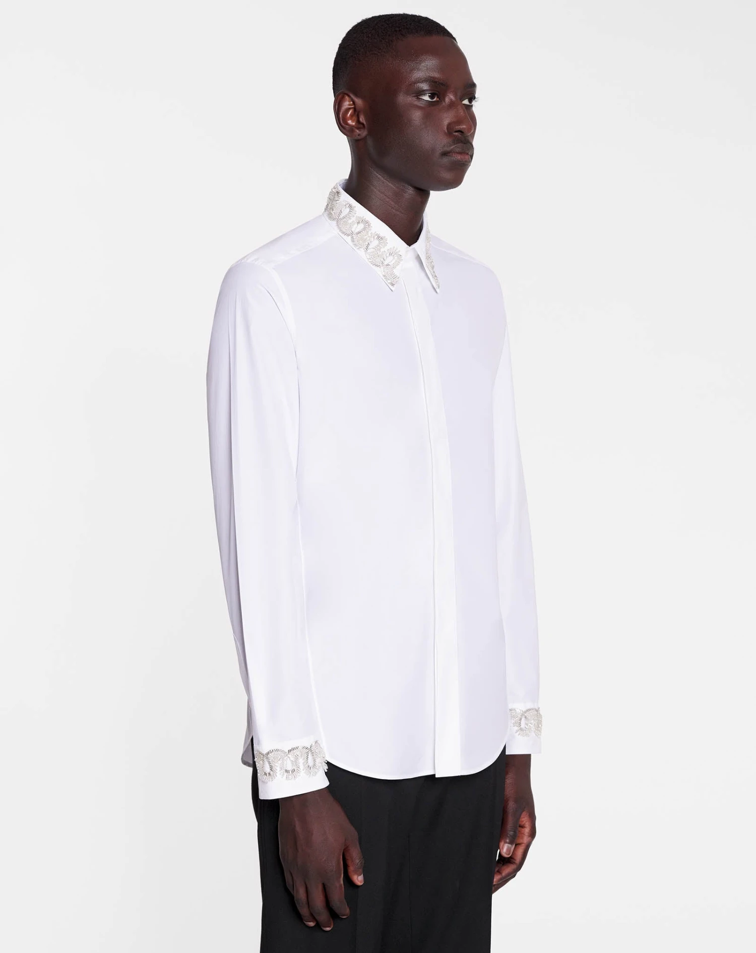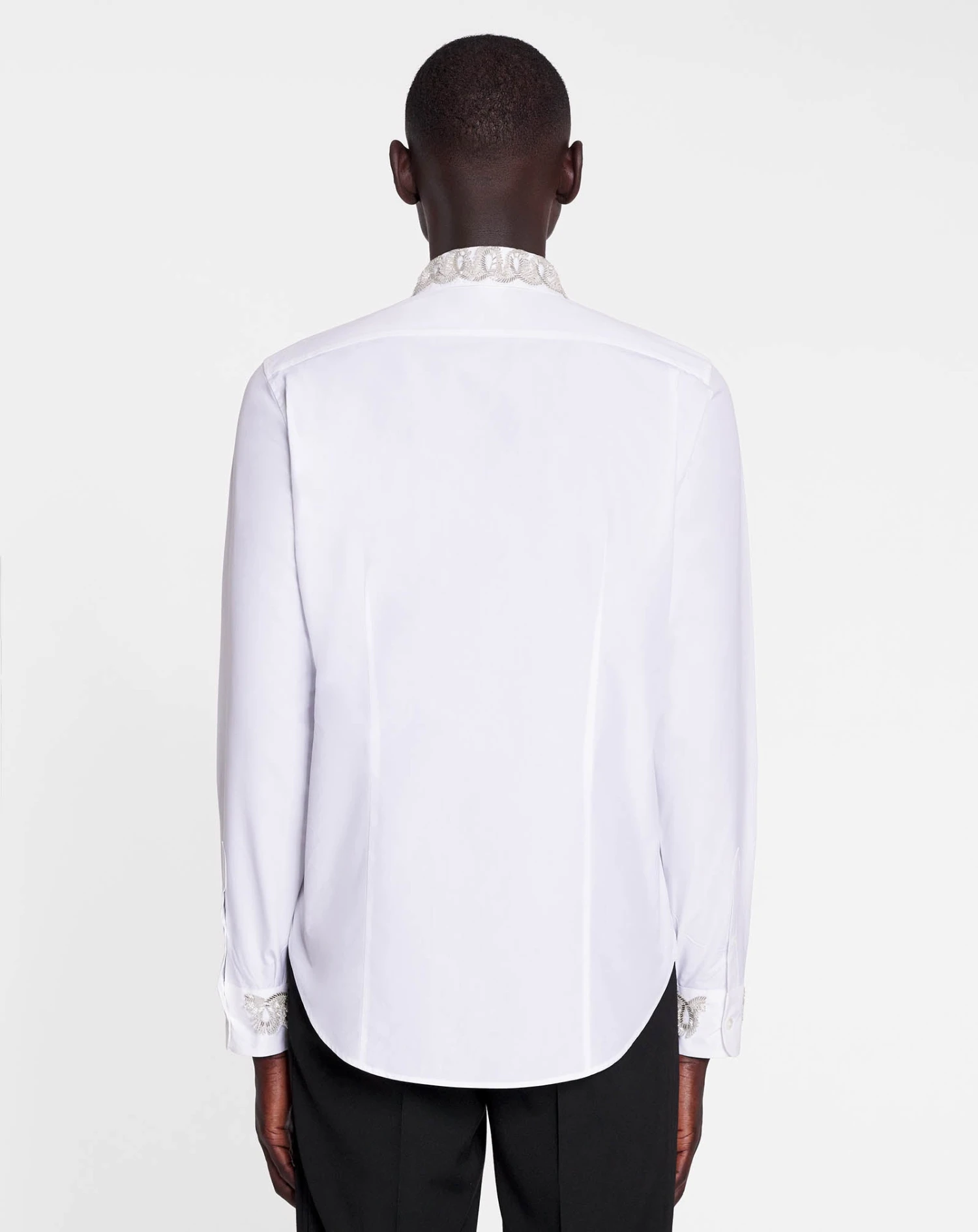 - Long sleeve, slim fit, shirt in cotton poplin with elegant embroideries on cuffs and collar for a ceremonial look.