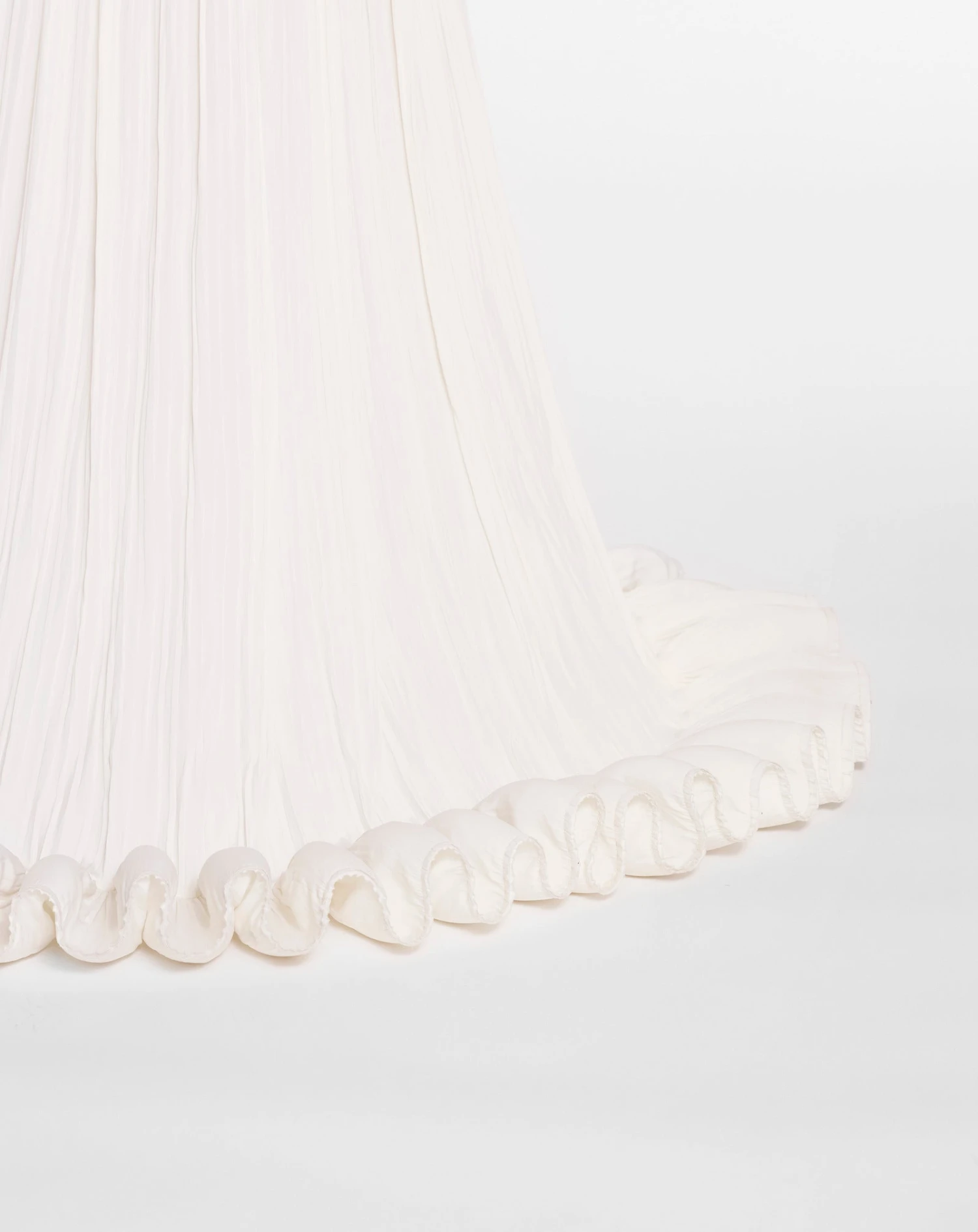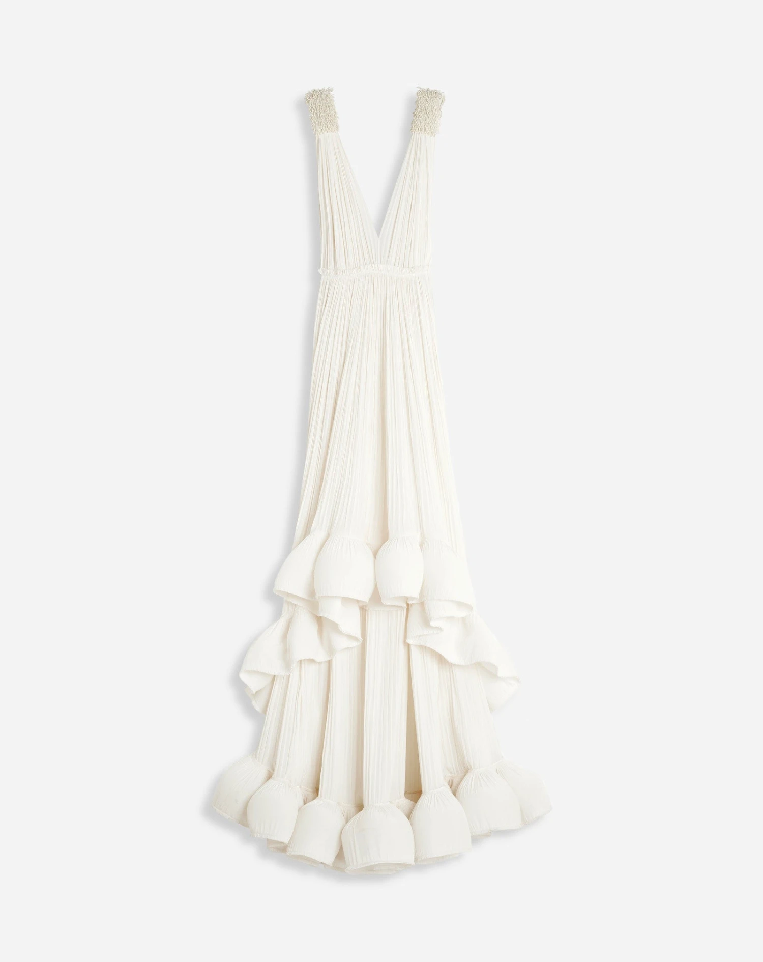 - The V neck is embellished with large straps hand embroidered with micro pearls.