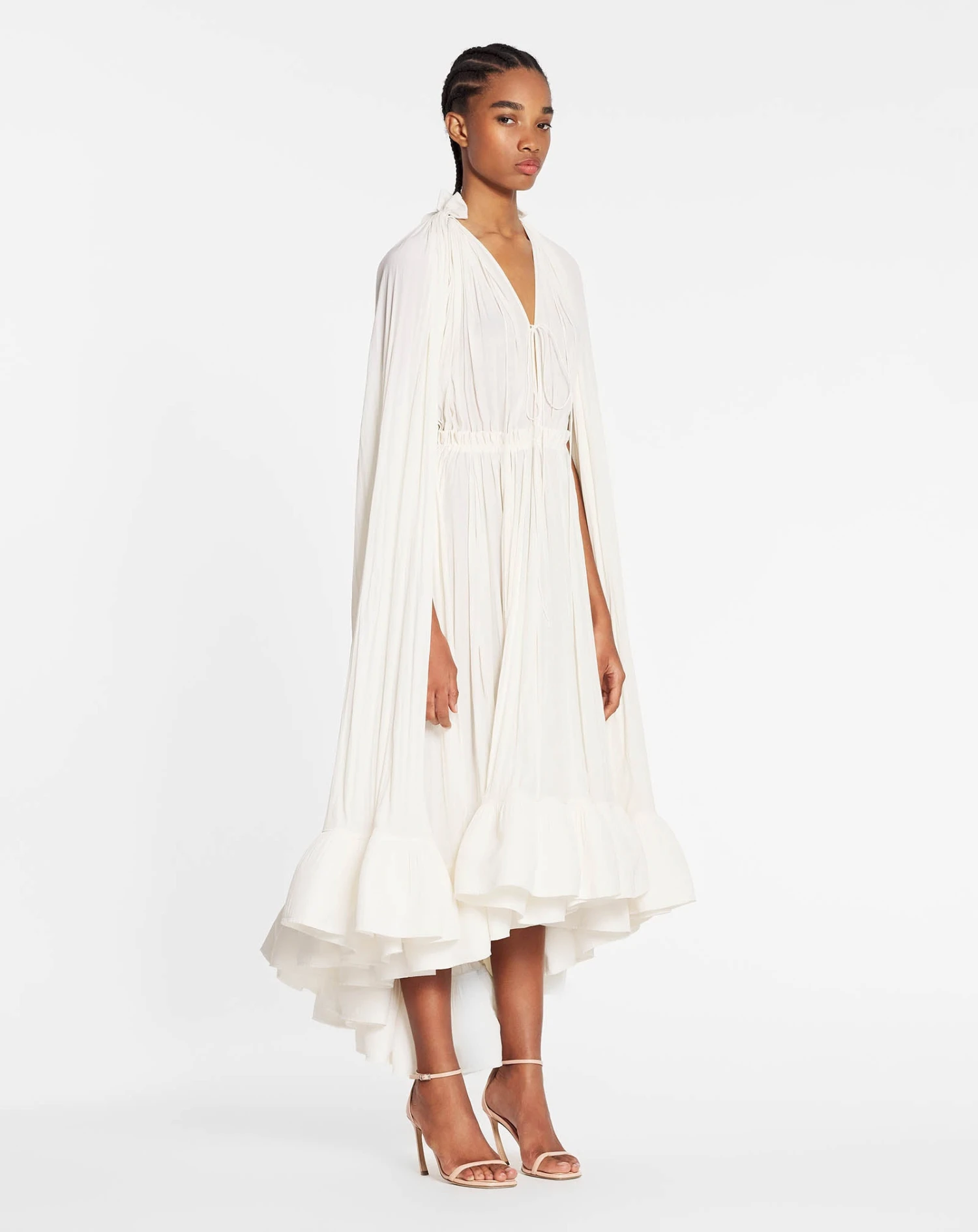 - The dress is flared and floaty with a generous volume on the bottom and has a cape-like back.