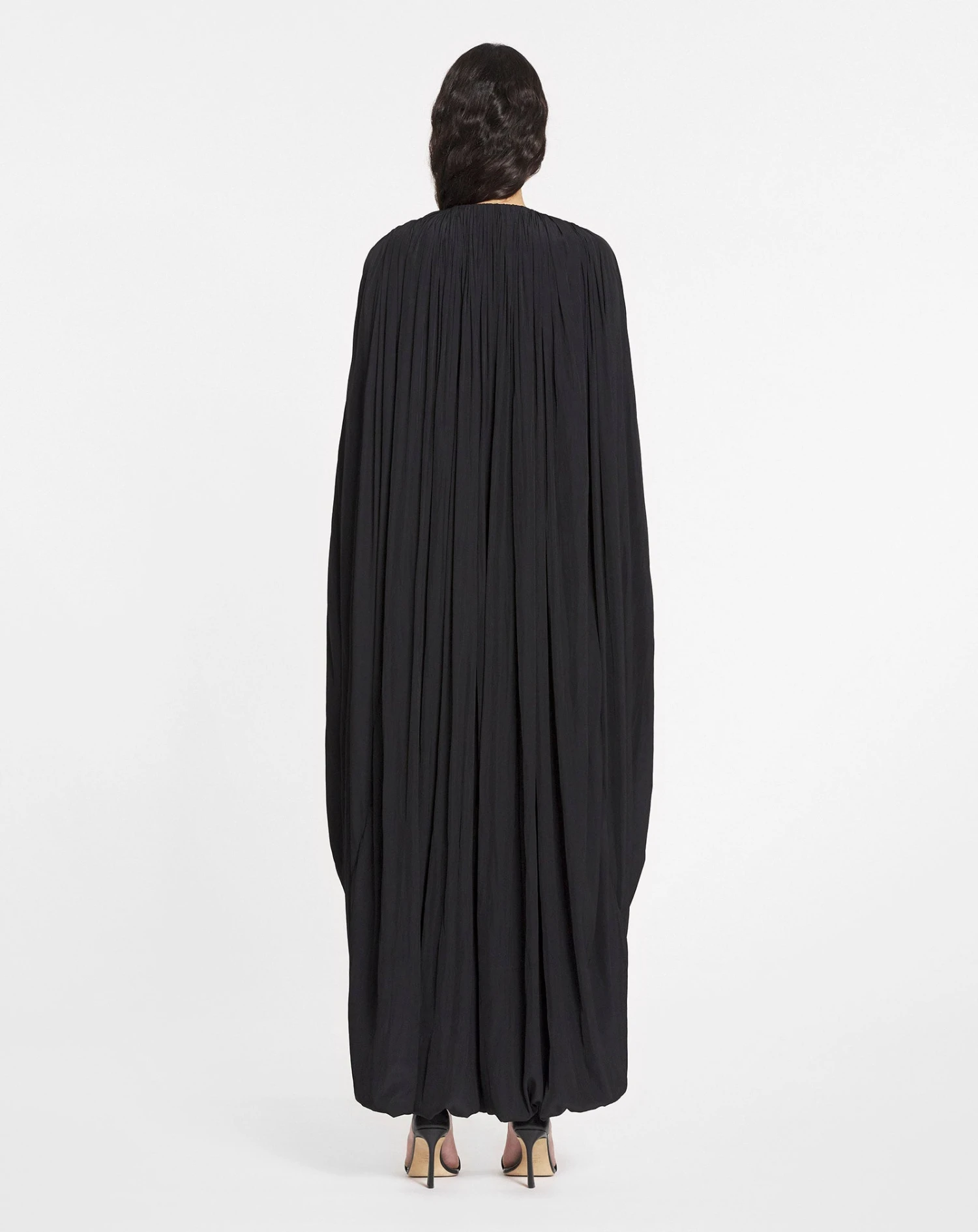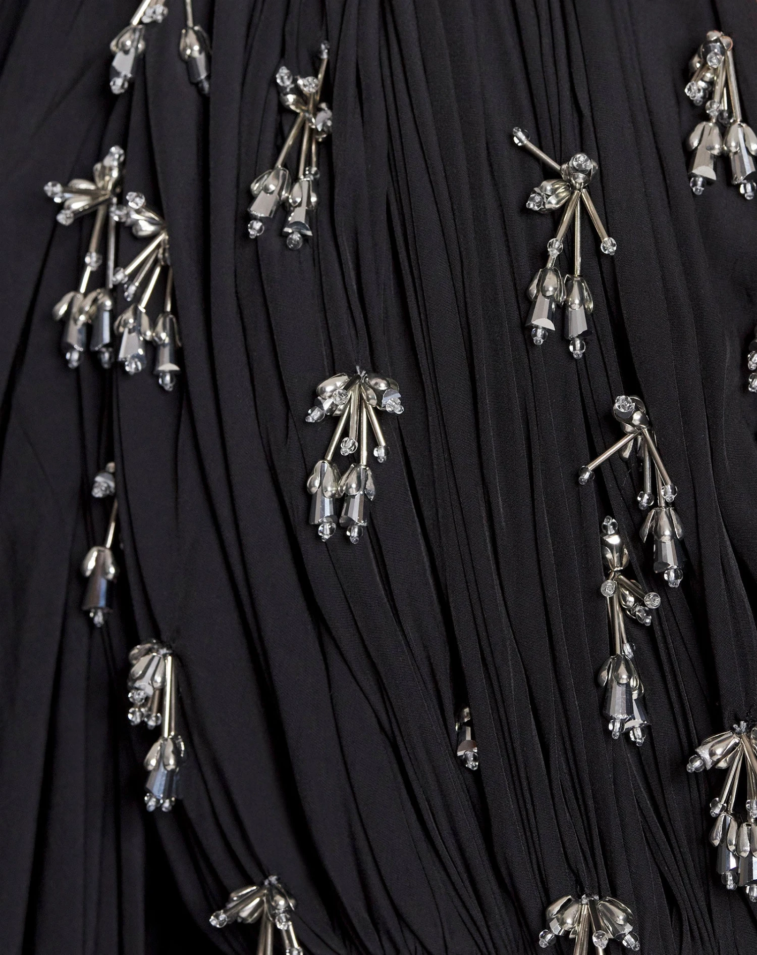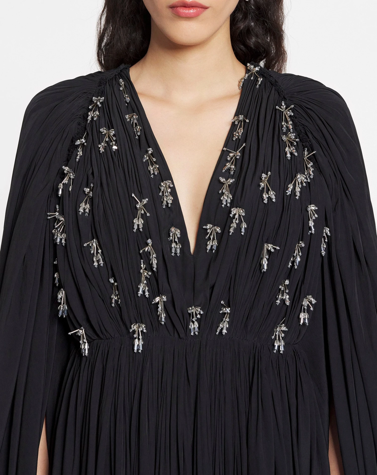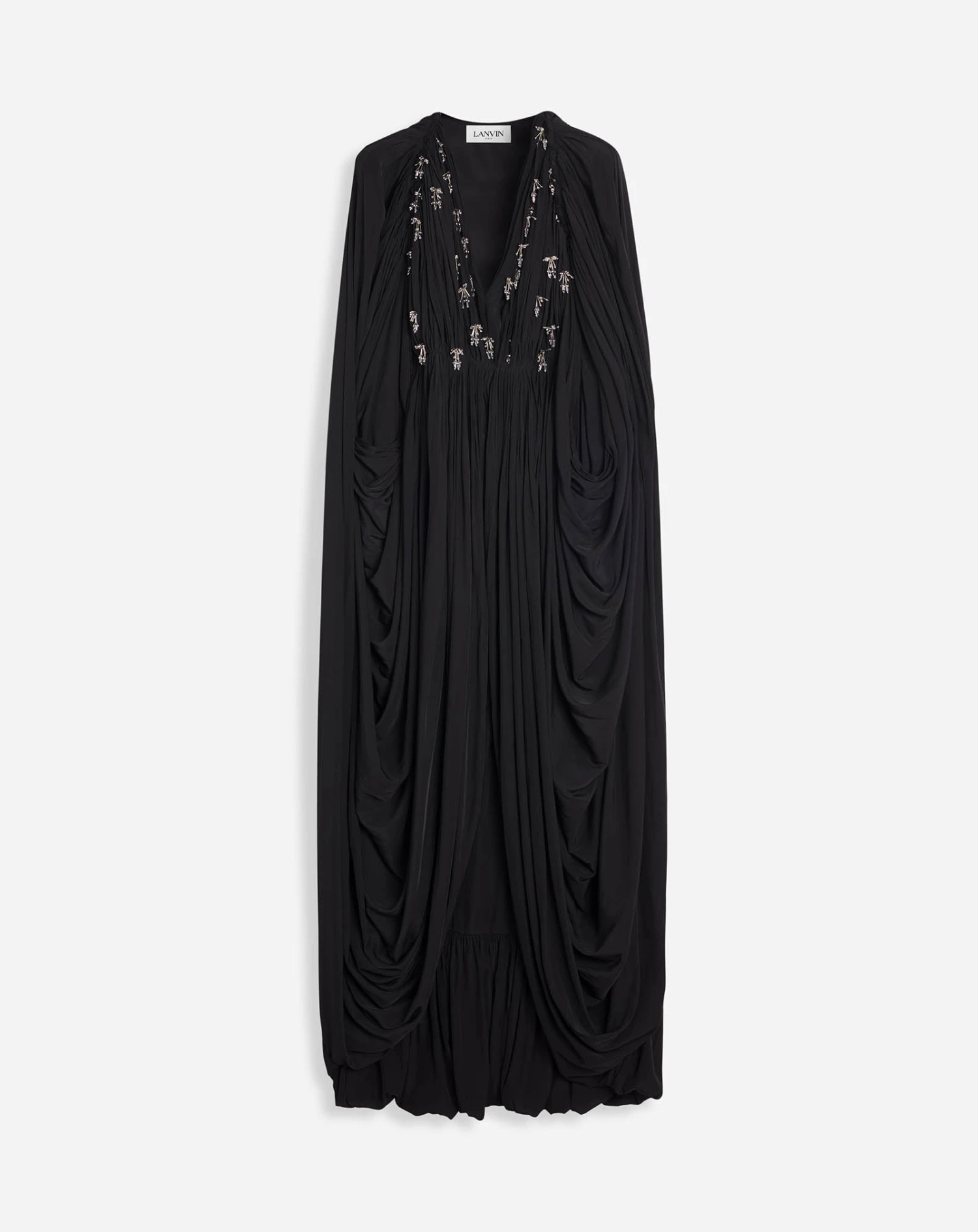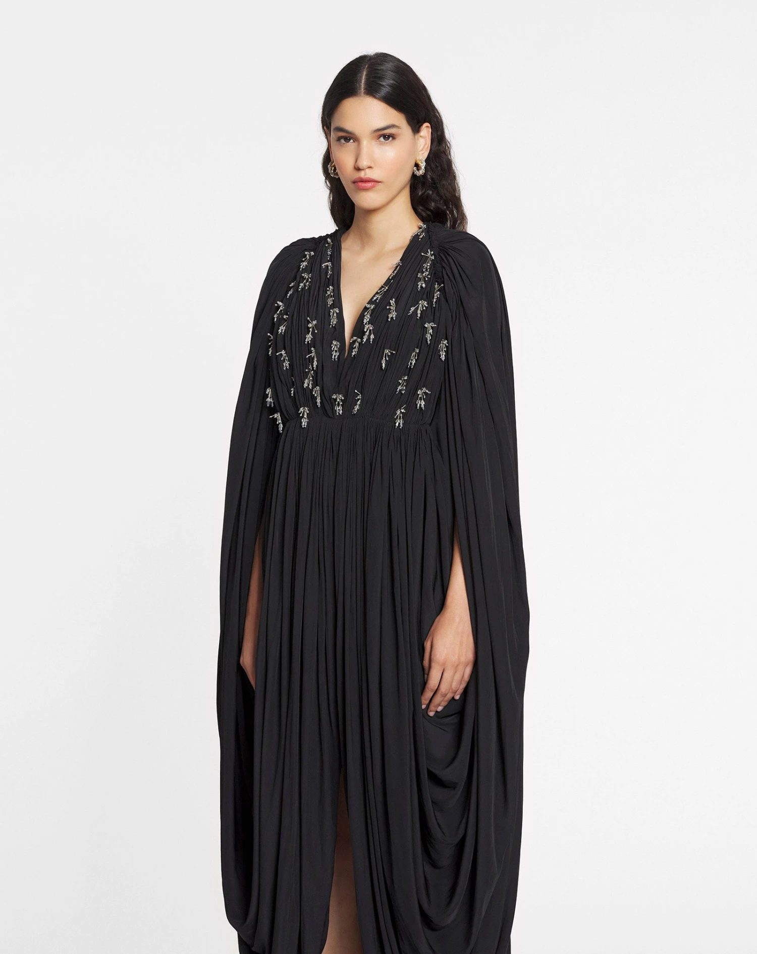 - Long draped dress in Charmeuse, a signature Lanvin fabric, embellished with embroidery on the front