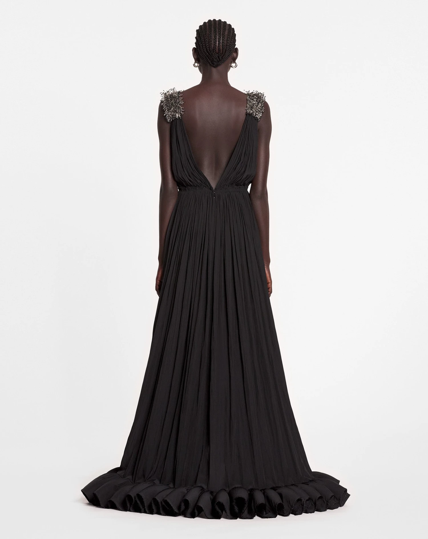 To achieve a flowing shape that falls naturally, the charmeuse dresses were draped by hand using artisanal techniques found in the Lanvin archives.