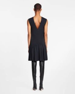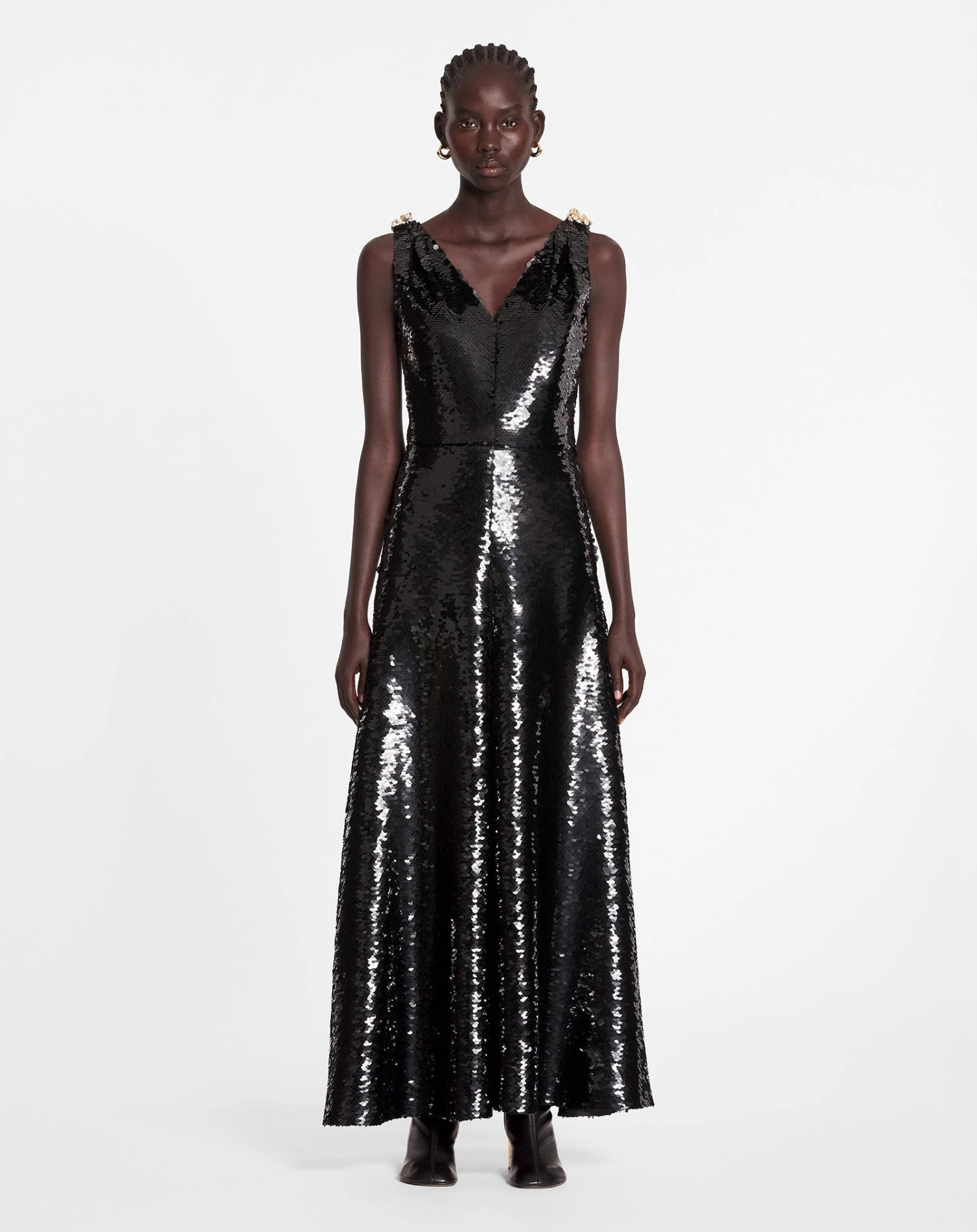 - Fitted and flared midi dress embroidered with black sequins, featuring wide straps forming a V-shaped neckline