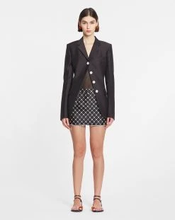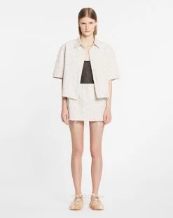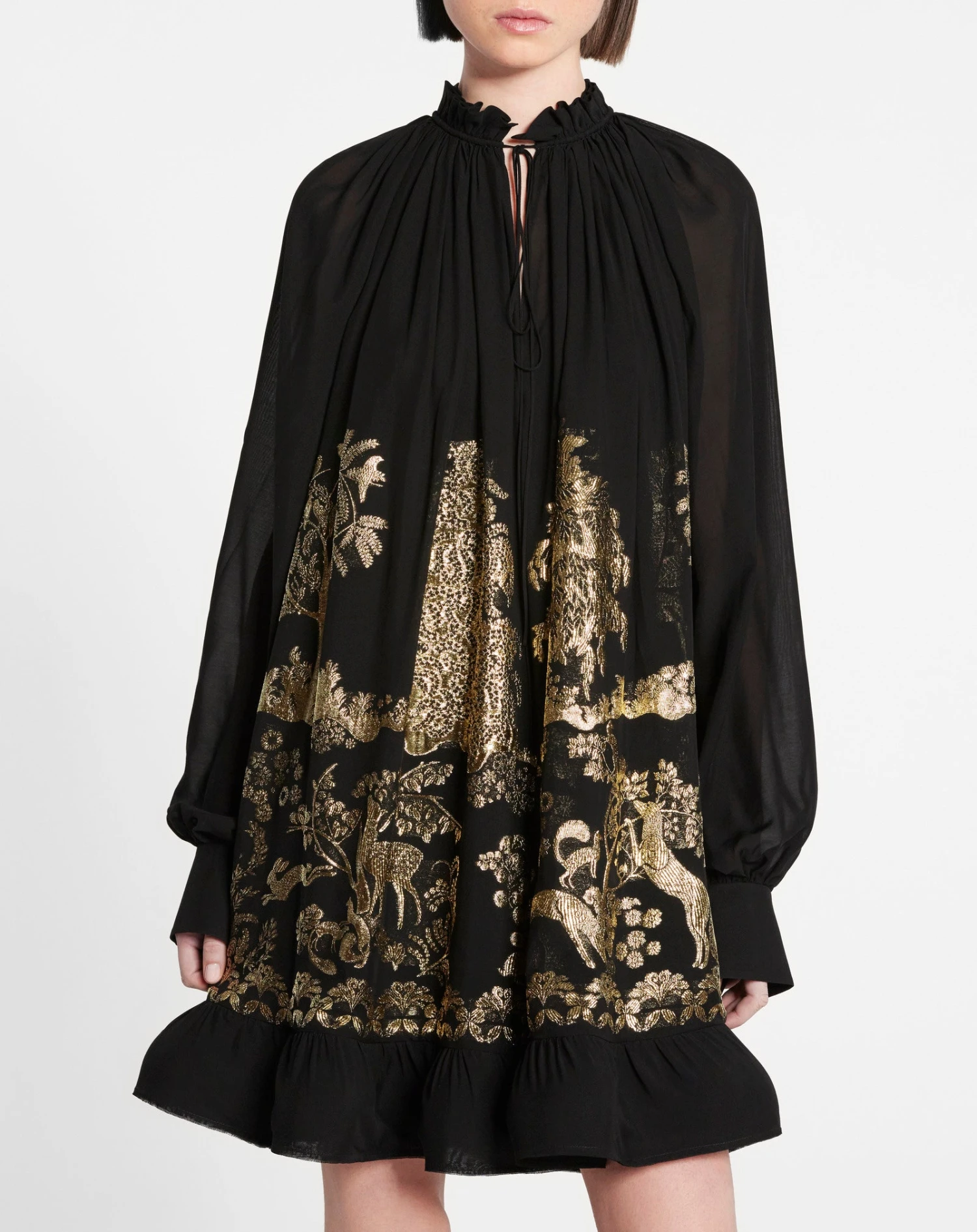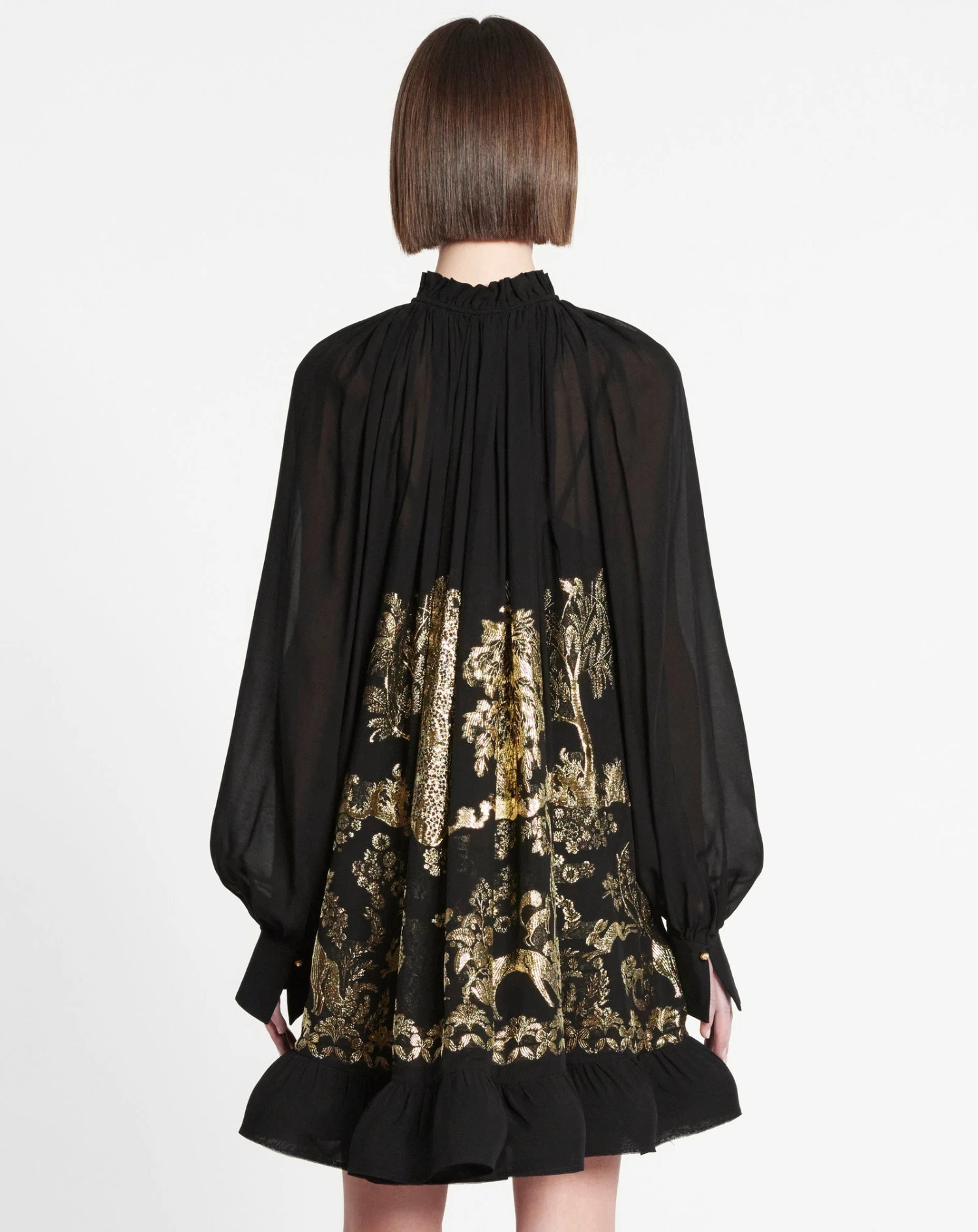 - Loose-fitting long-sleeve mini dress embellished with a gold jacquard pattern inspired by the work of artist Armand-Albert Rateau