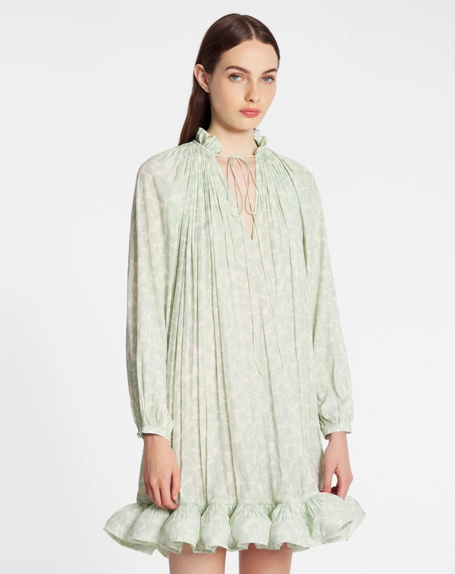 - Long sleeve mini dress with ruffles in flower print charmeuse