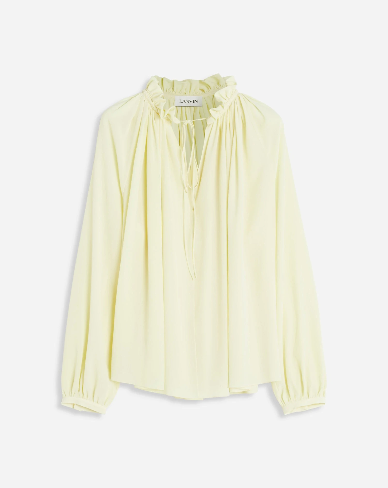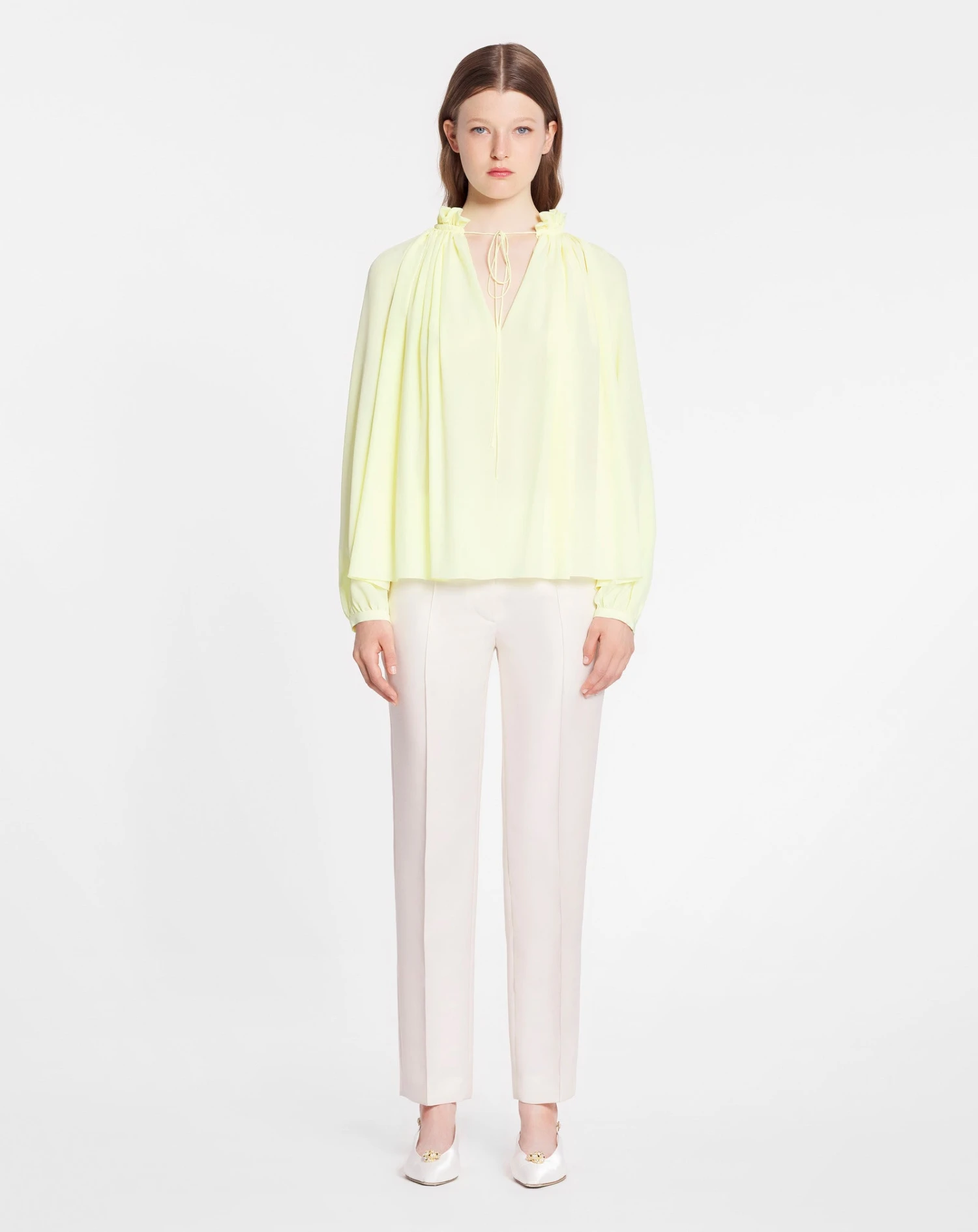 - Elegant long sleeve, relaxed fit, blouse with open neck that fastens with fine strings.