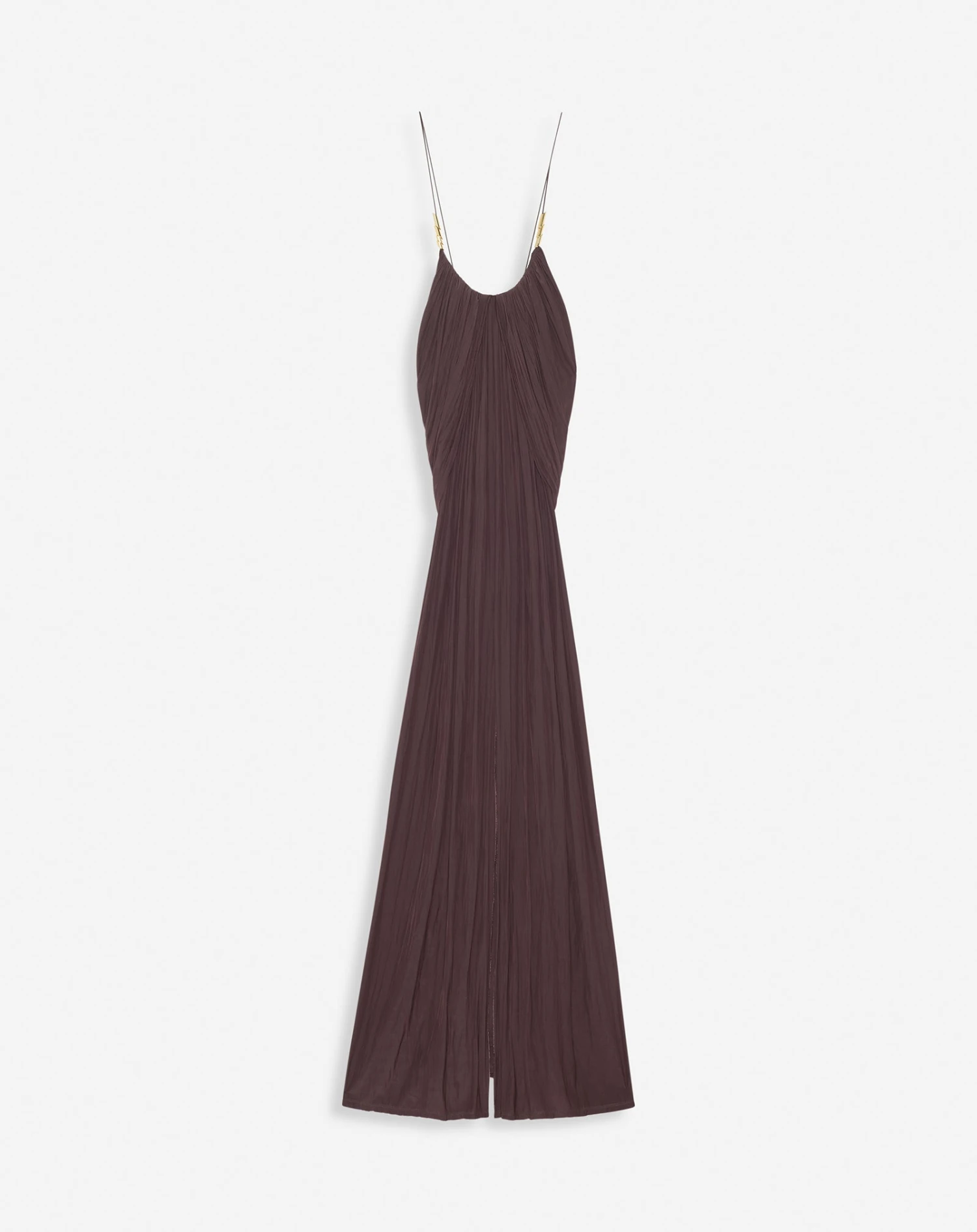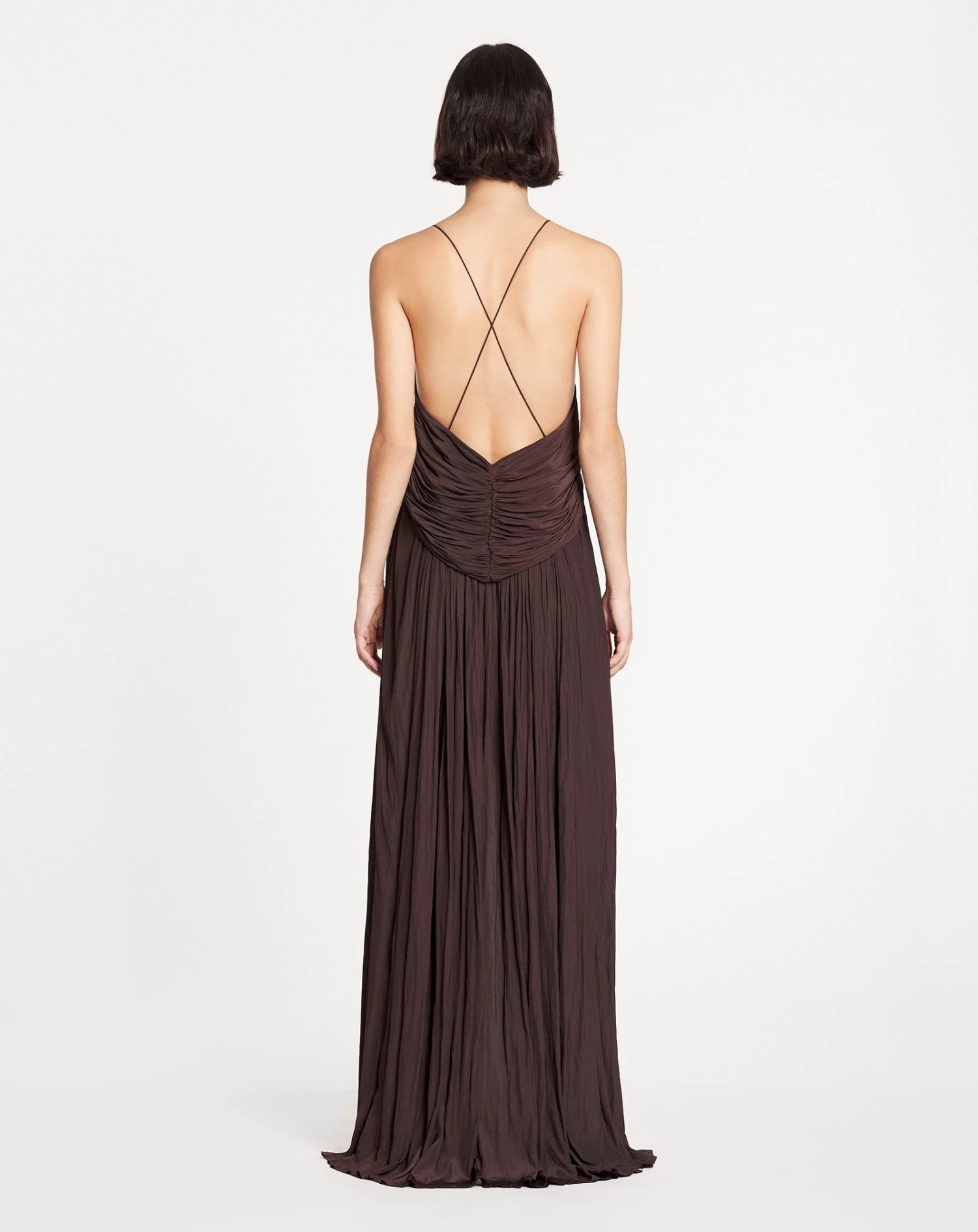 - Long flowing plain charmeuse dress with crossed straps at the back