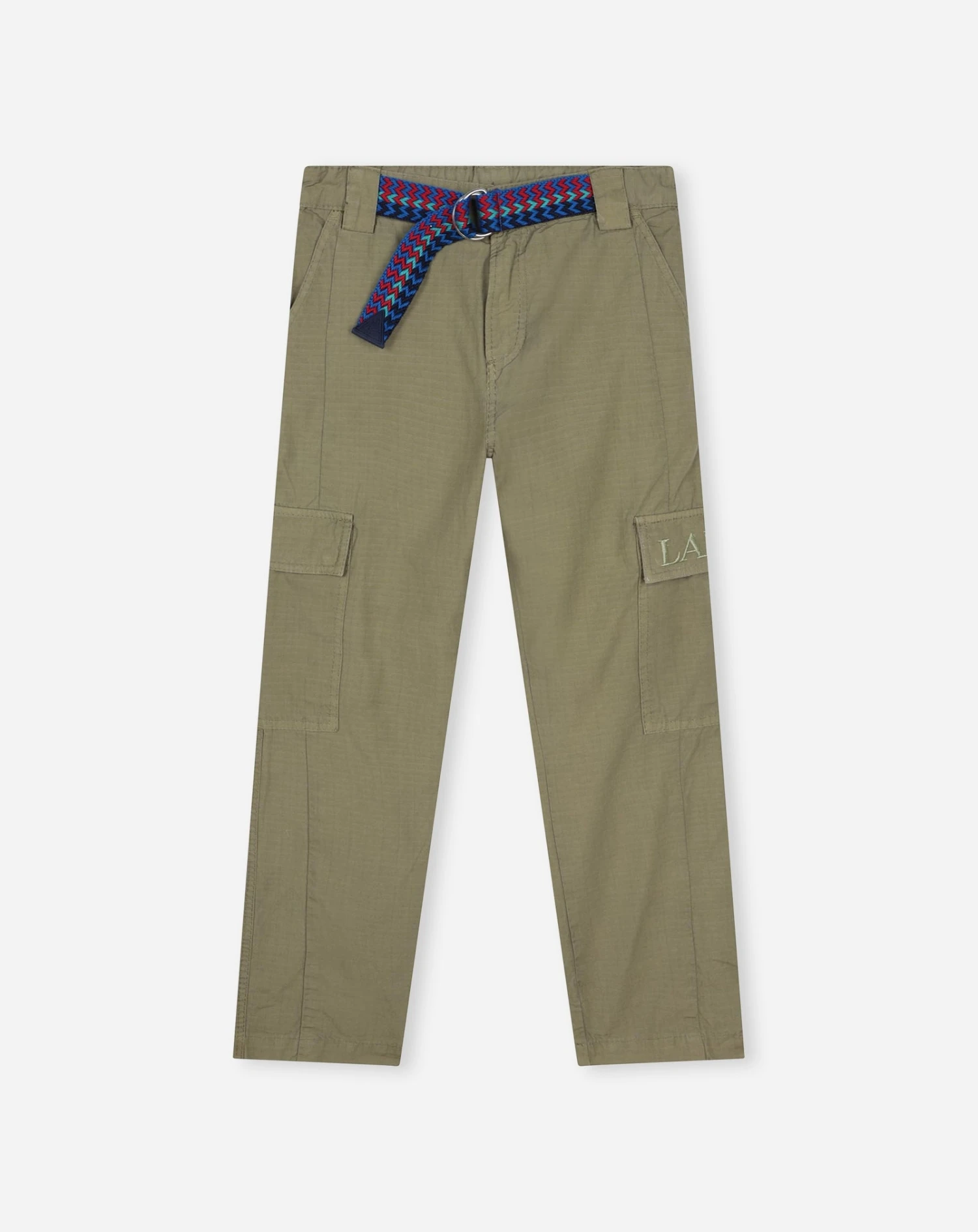 These Lanvin plain-coloured canvas trousers are made of 100% cotton. The waist features a belt woven with multicoloured zigzags. The Lanvin logo is embroidered on the flap of one of the side pockets, and a piped pocket and flap pocket appear on the back of the trousers.