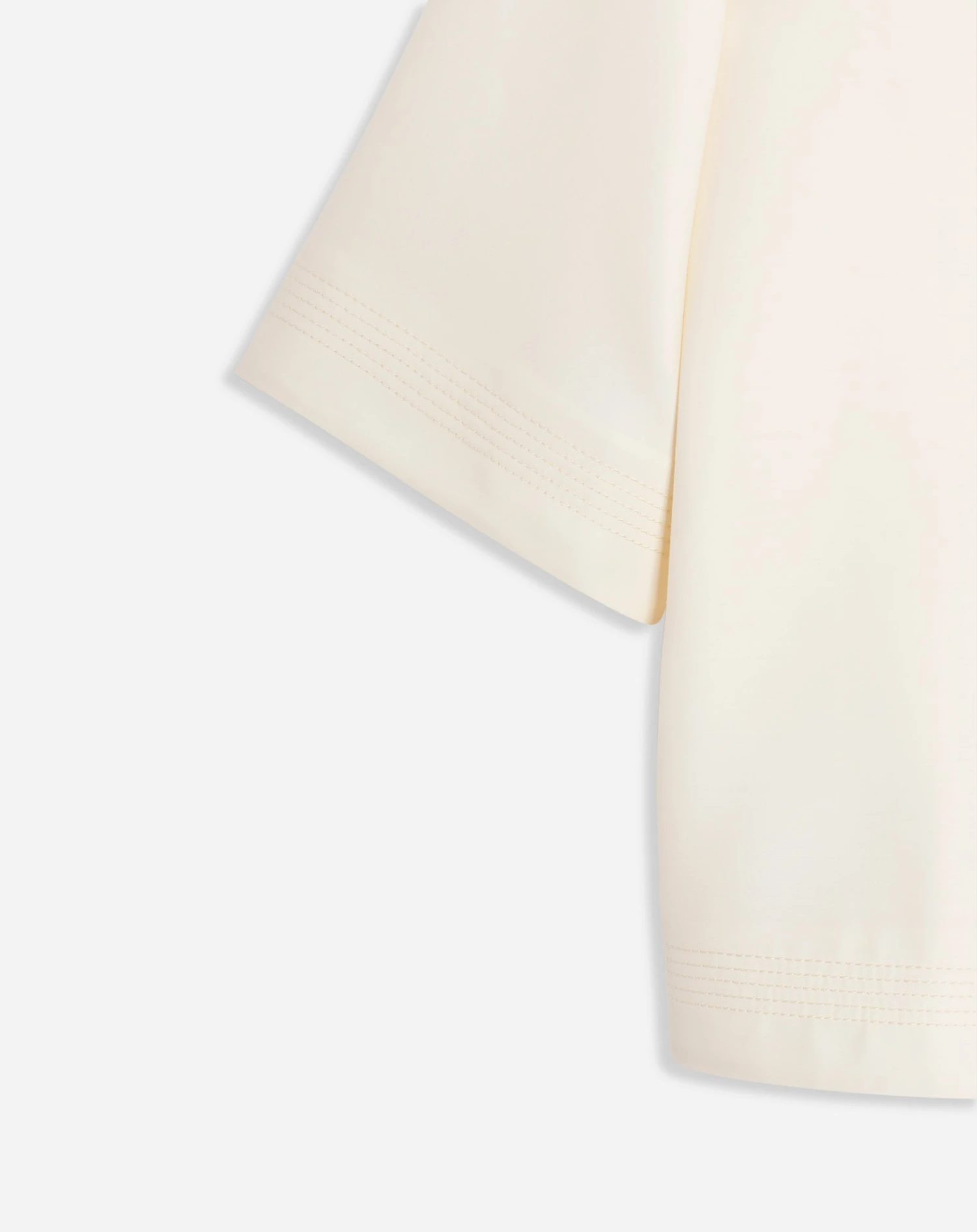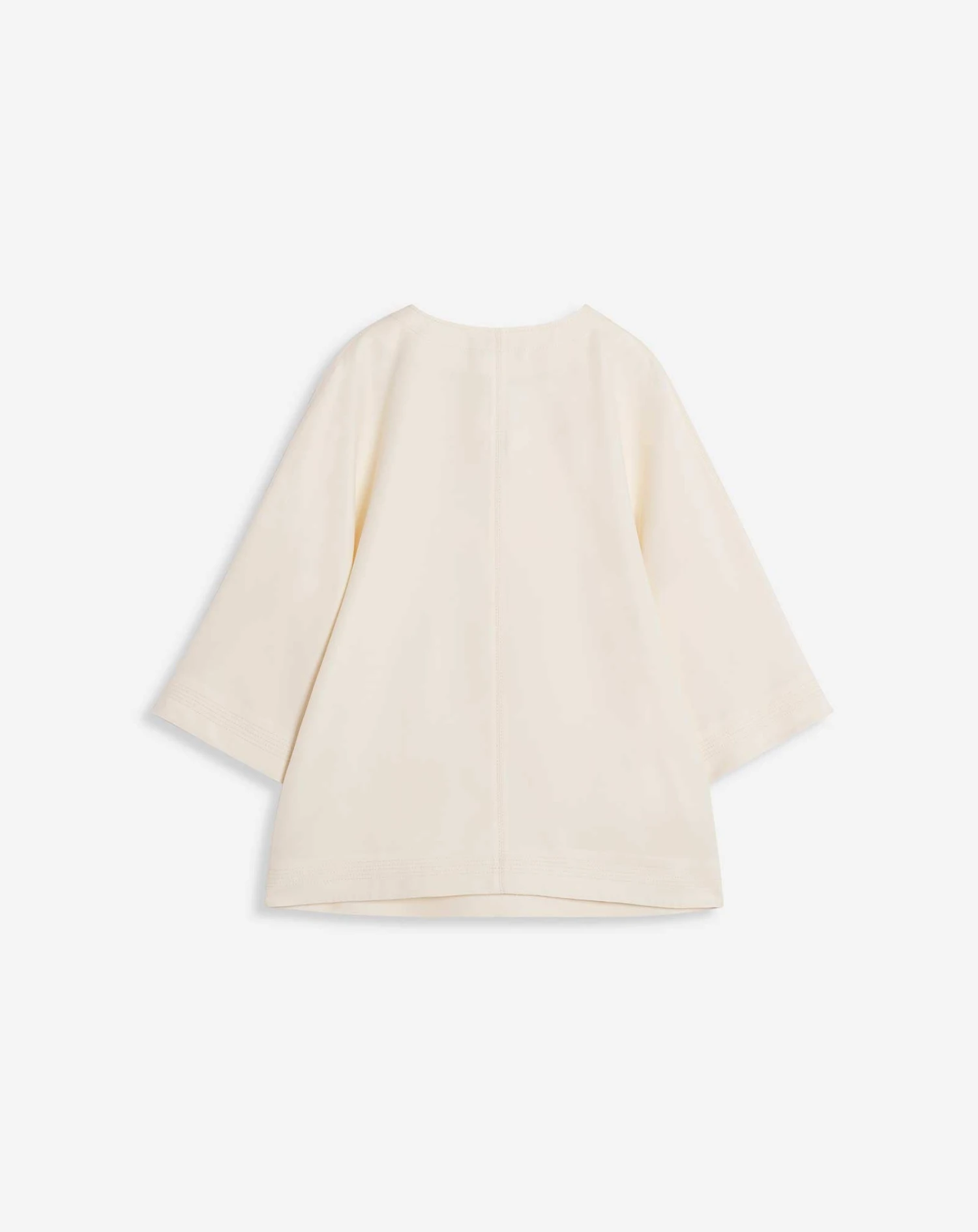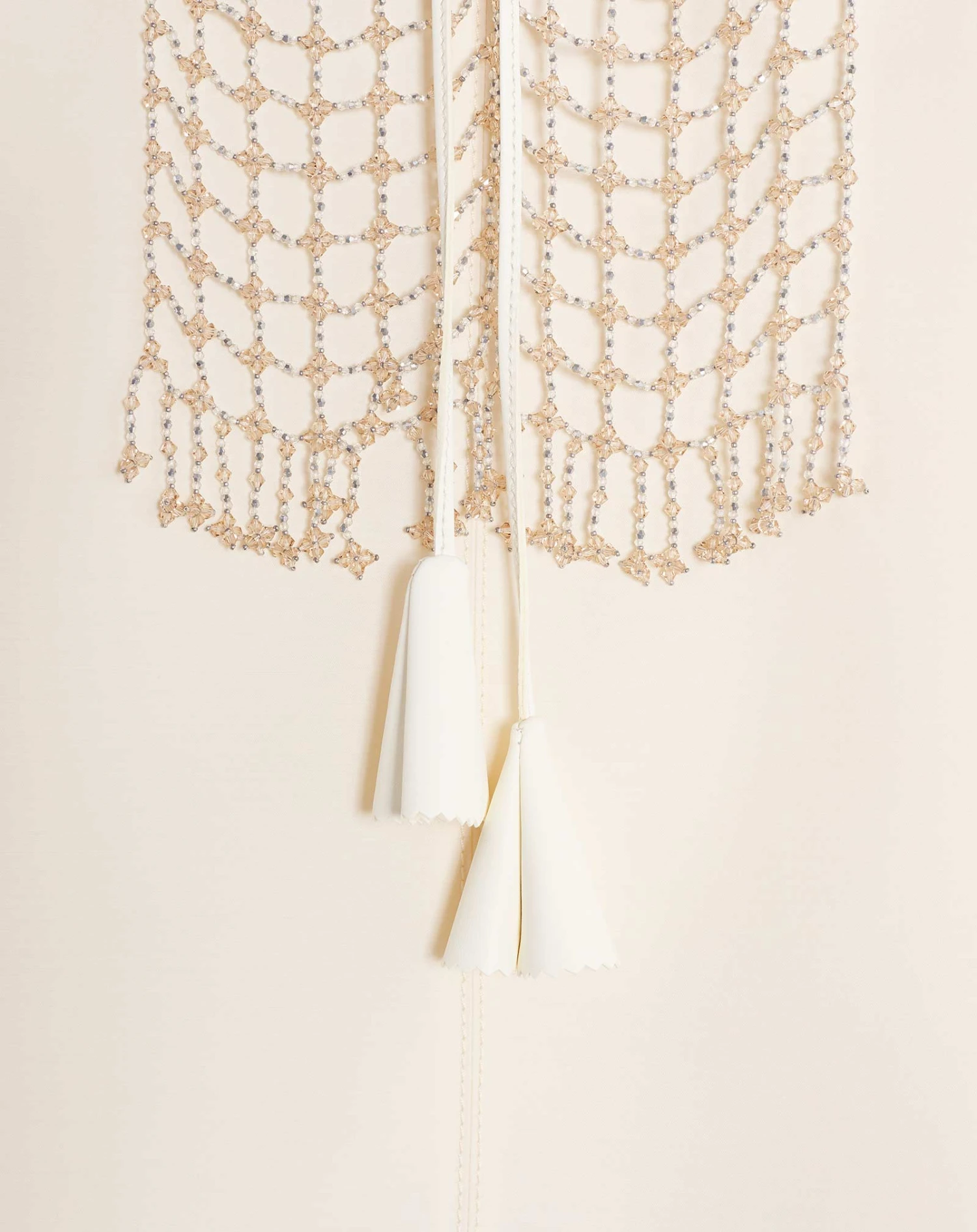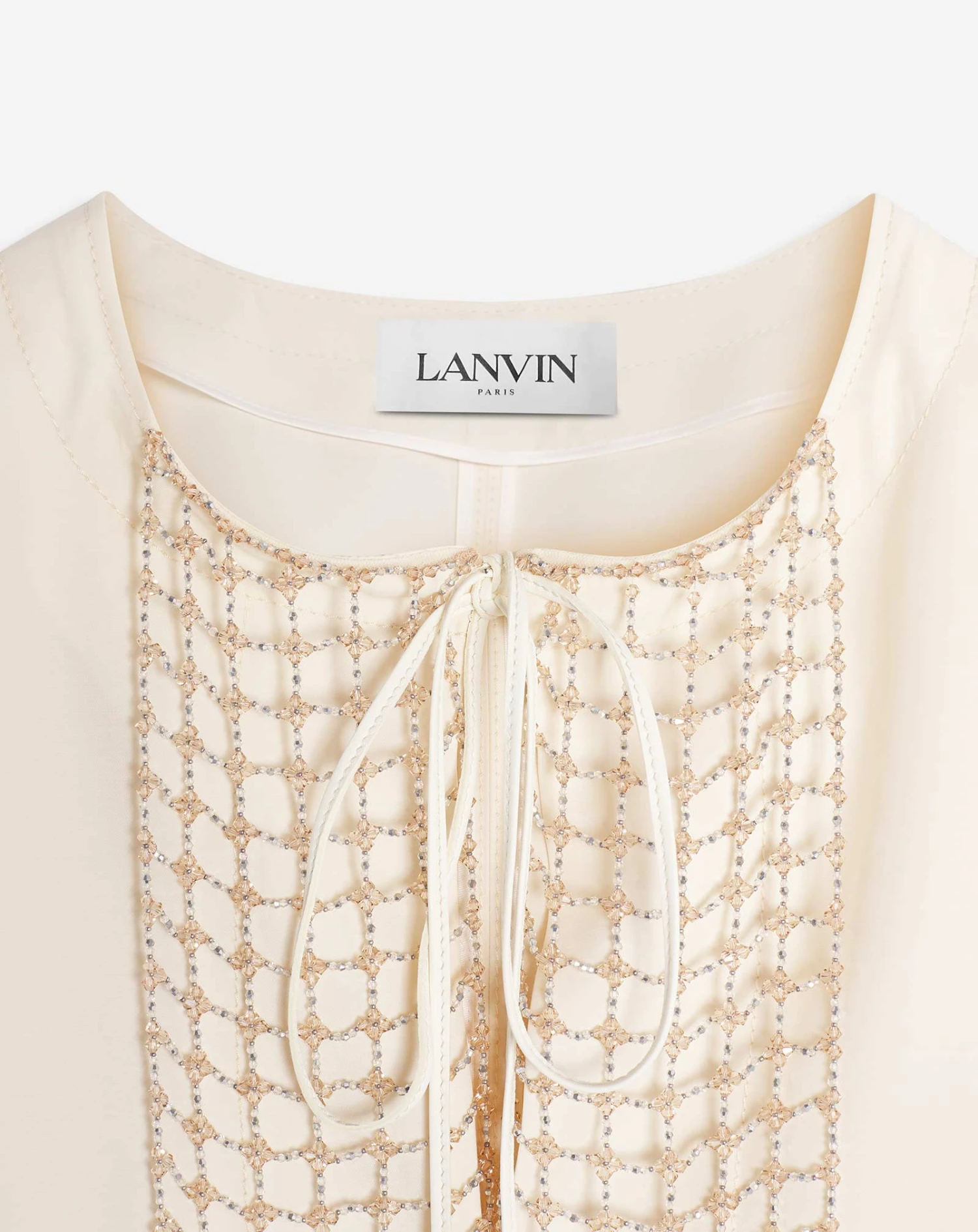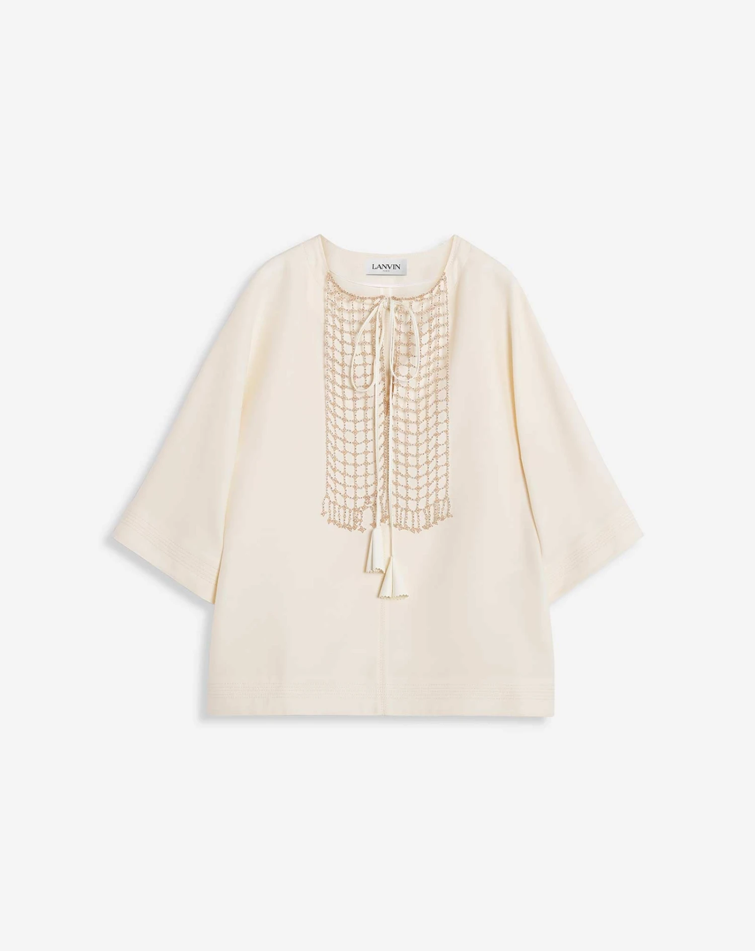 - Elbow sleeve elegant top with leather draw string fastening and extingushed embroidery on the front.