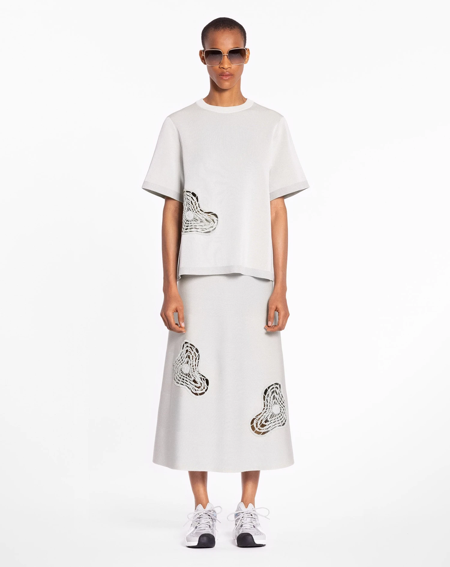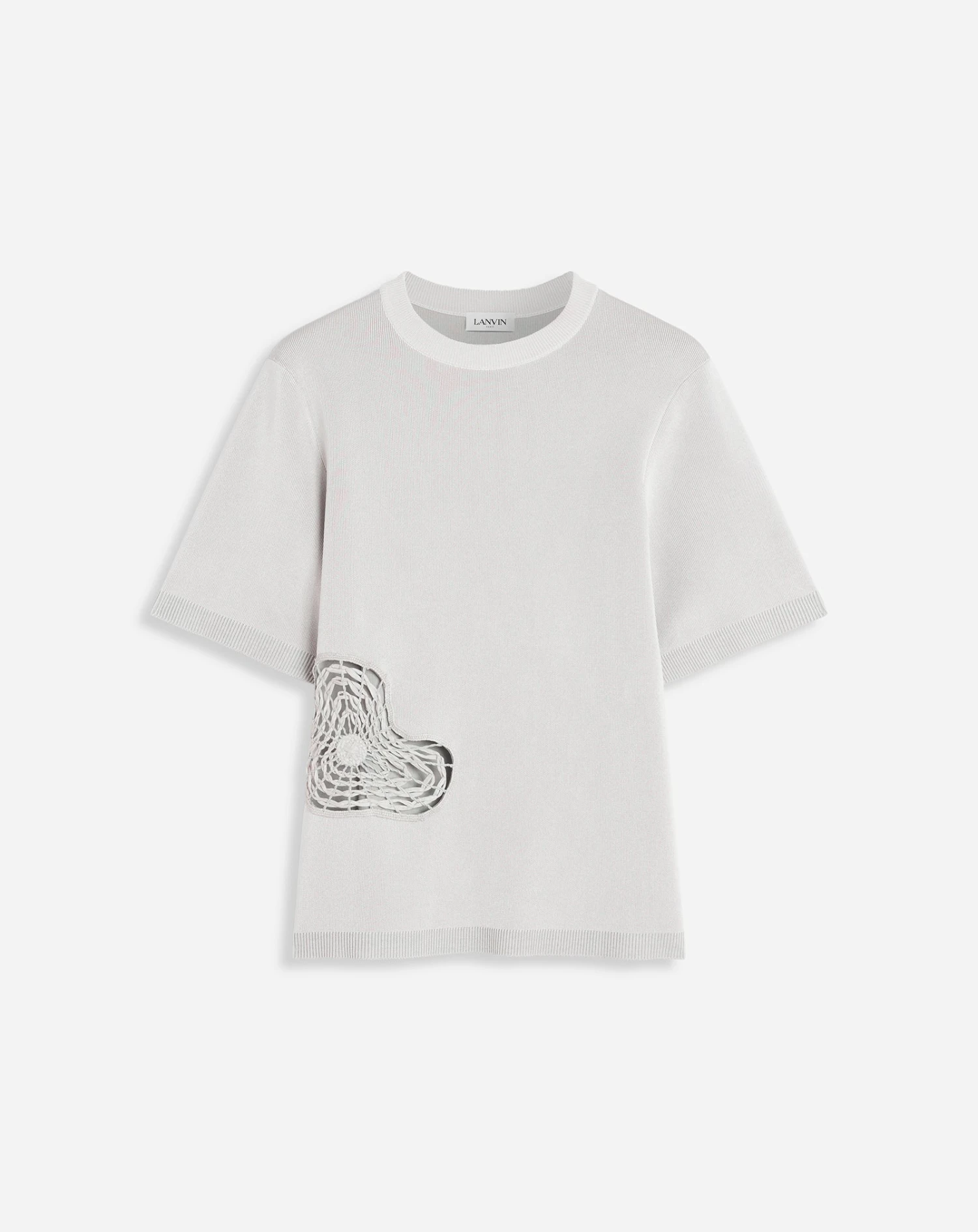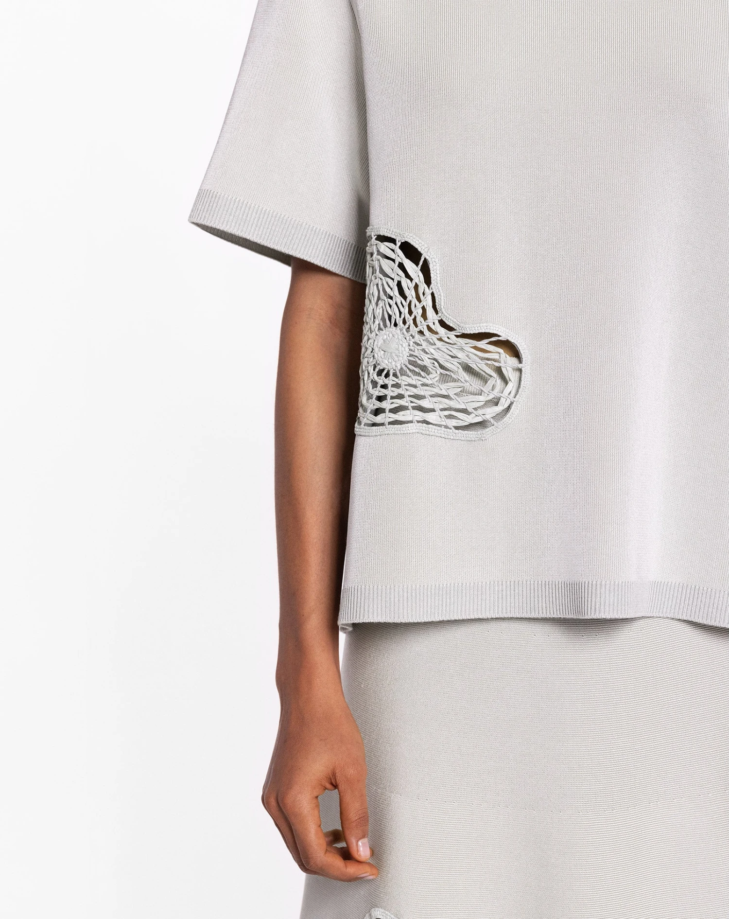 - Short sleeve, relaxed fit, top in wool and viscose yarn, embellished with large raffia patches.