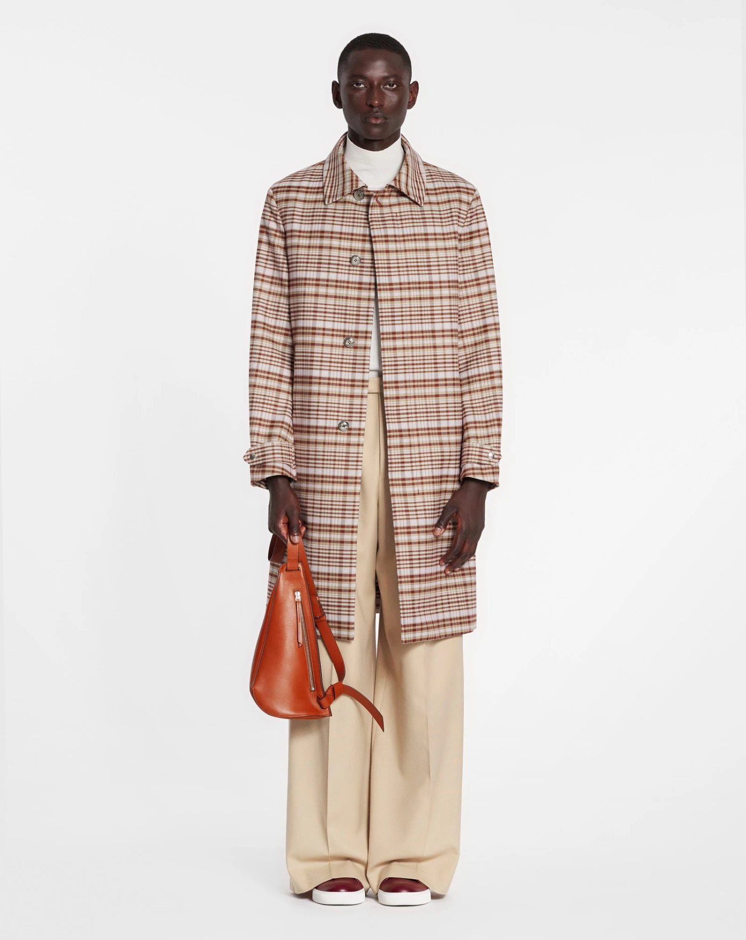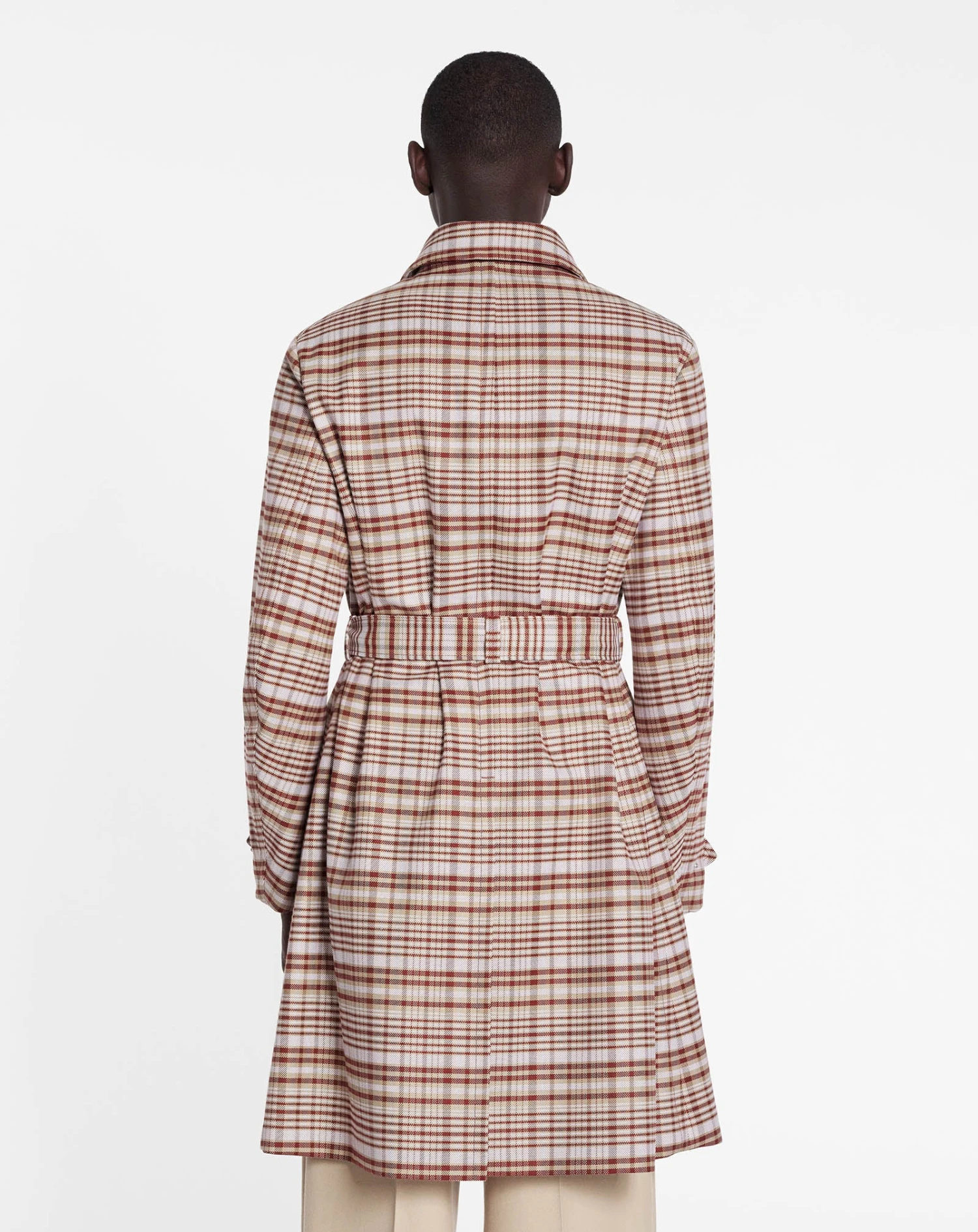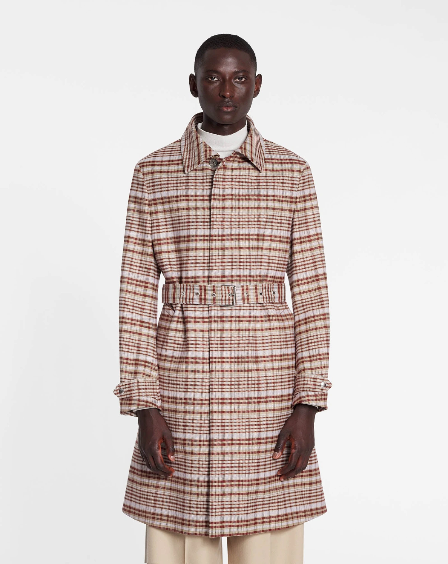 - Rain coat in checked wool and cotton blend, with removable belt and hidden front button opening.