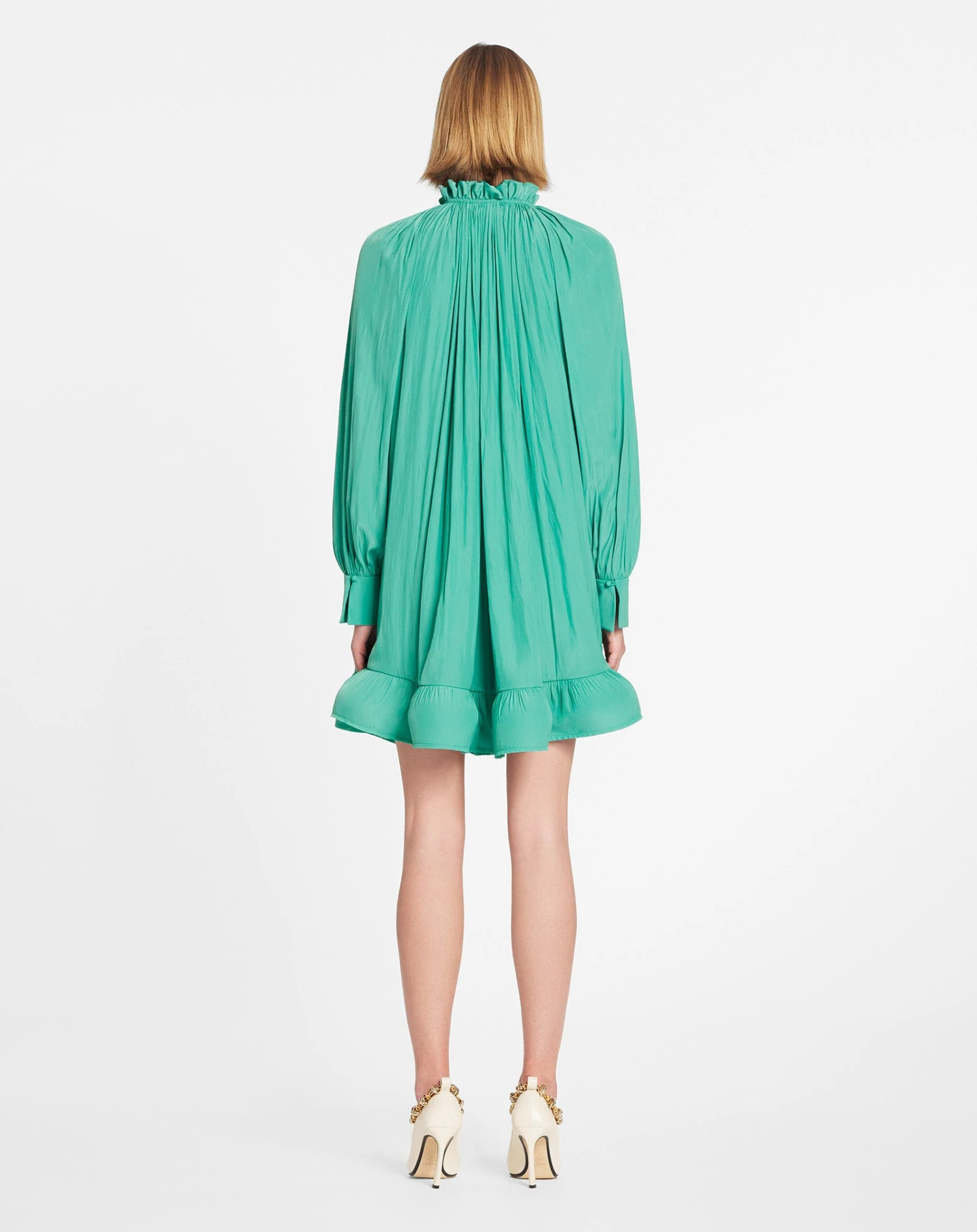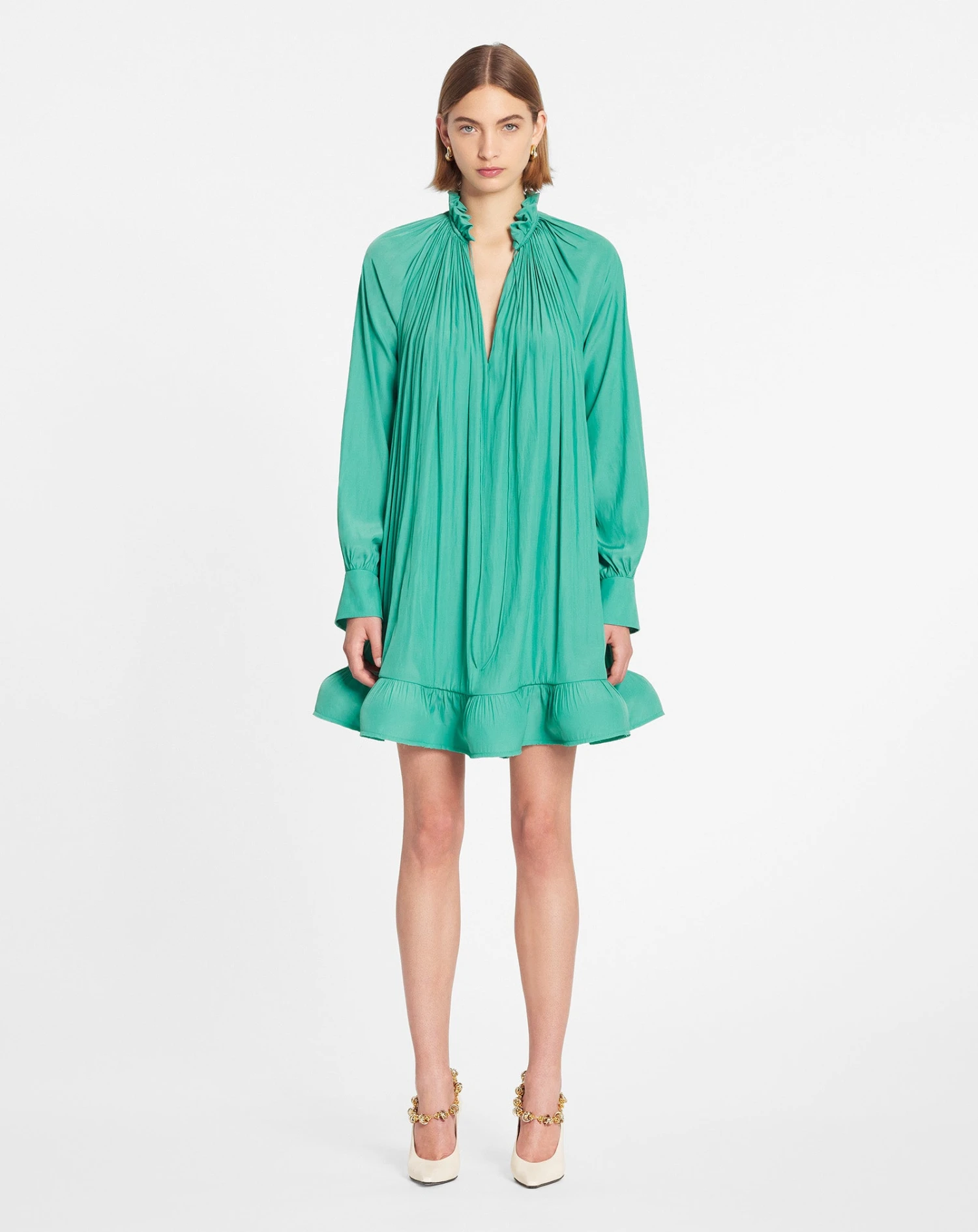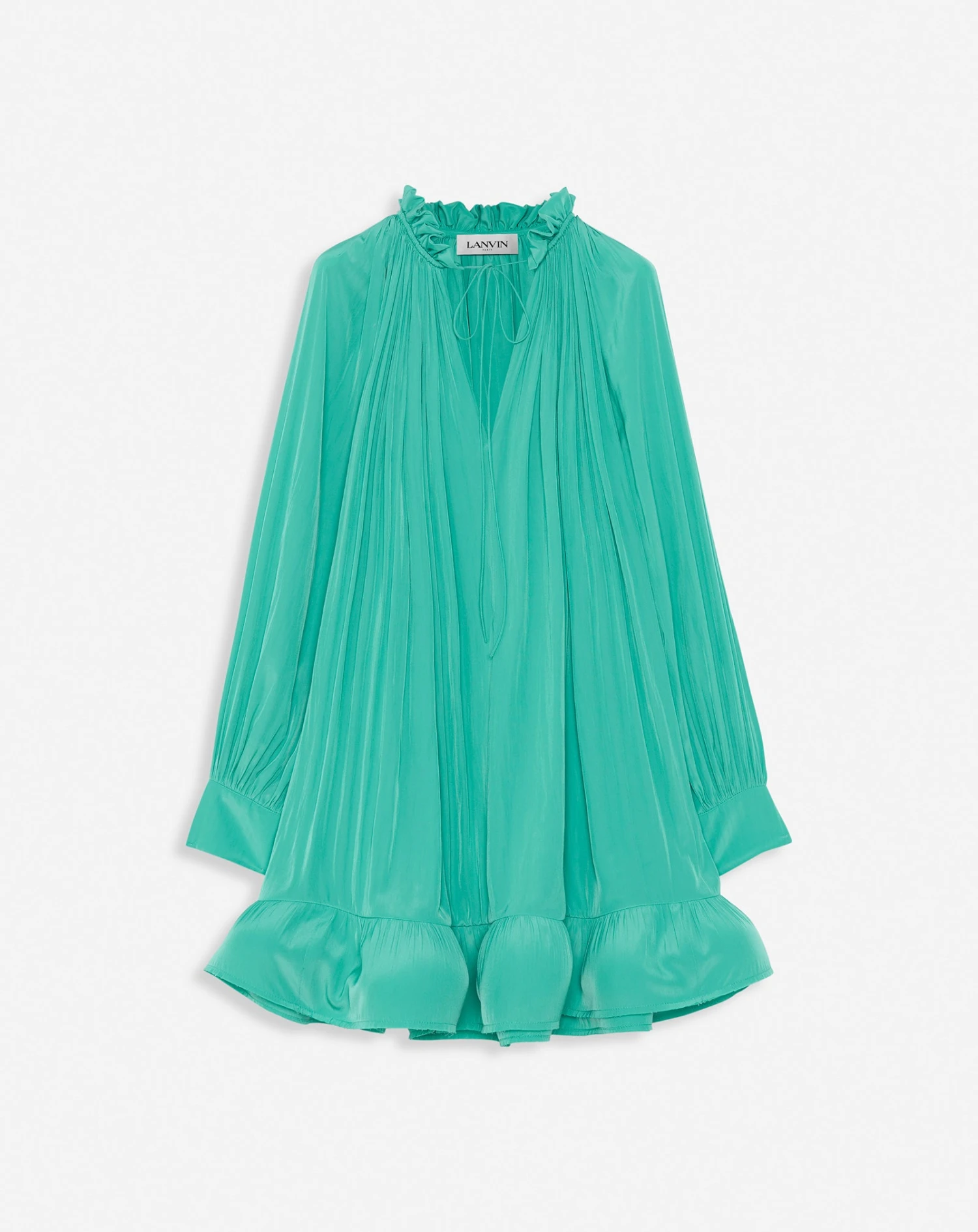 - Short dress with long sleeves and ruffles in flowing plain charmeuse