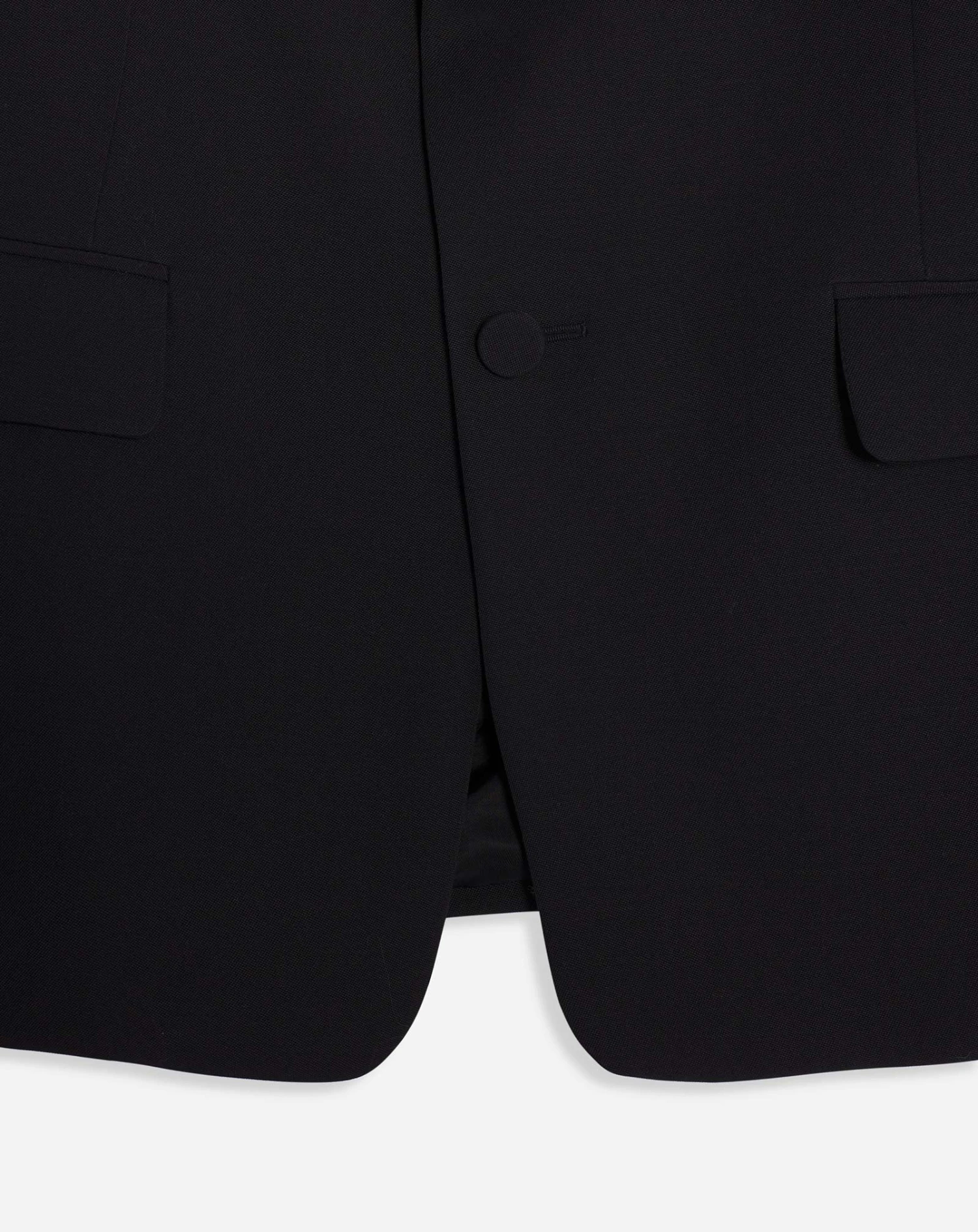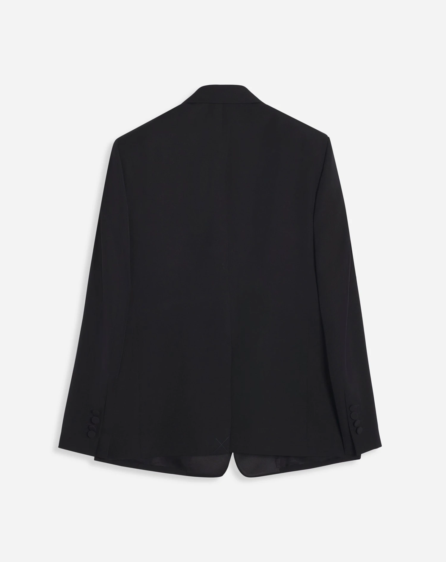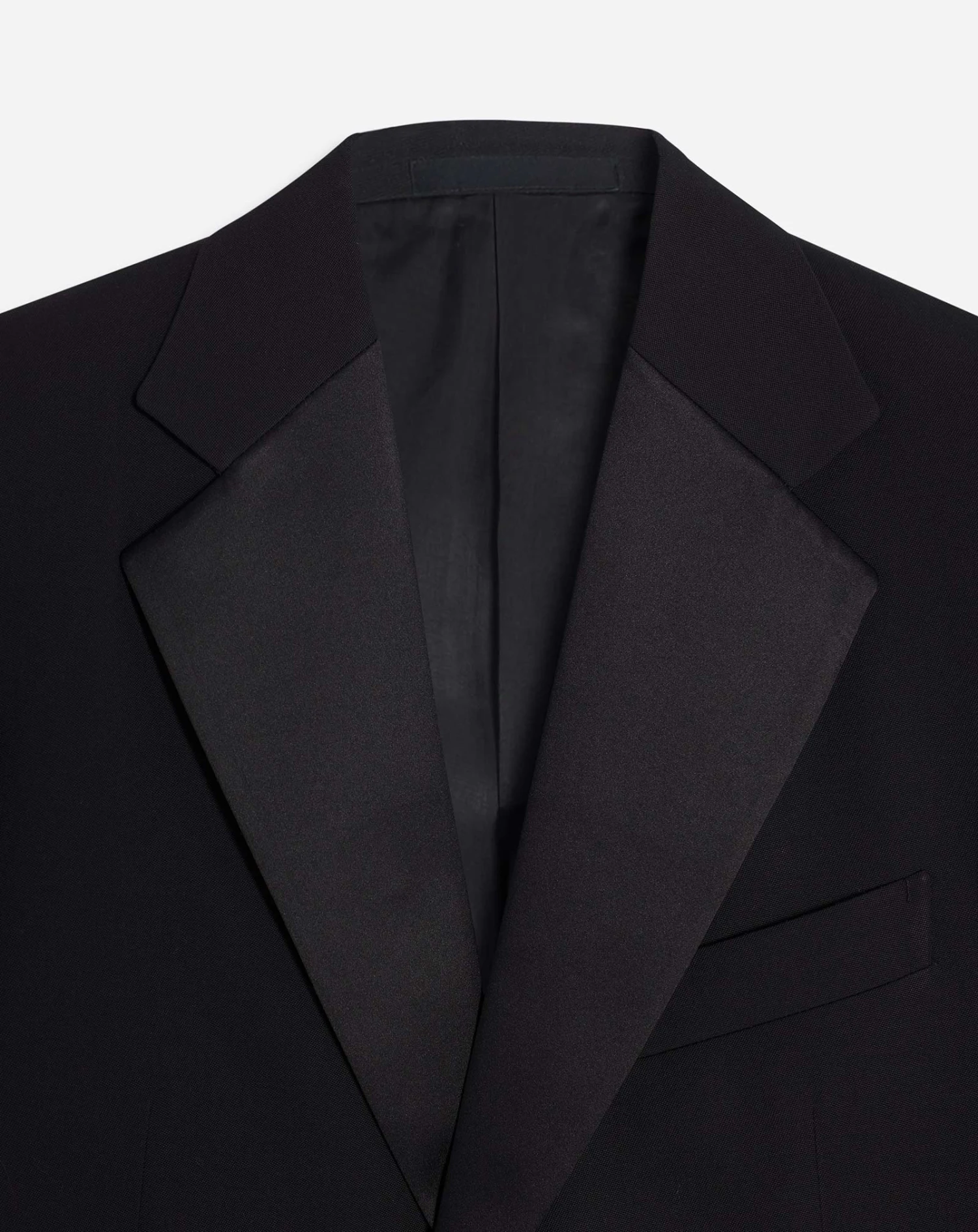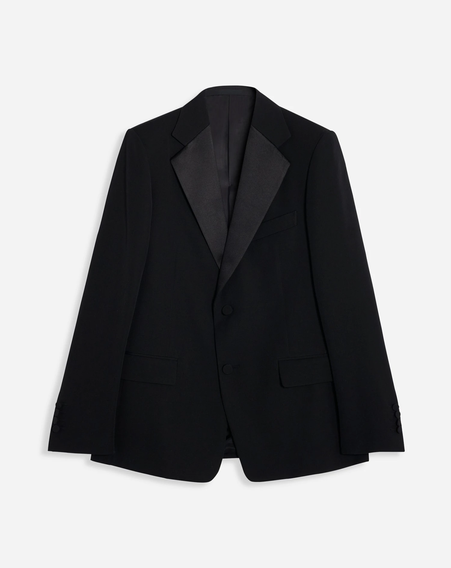 - Single-breasted one-button jacket with flap pockets and satin lapels in classic tuxedo wool grain de poudre.
