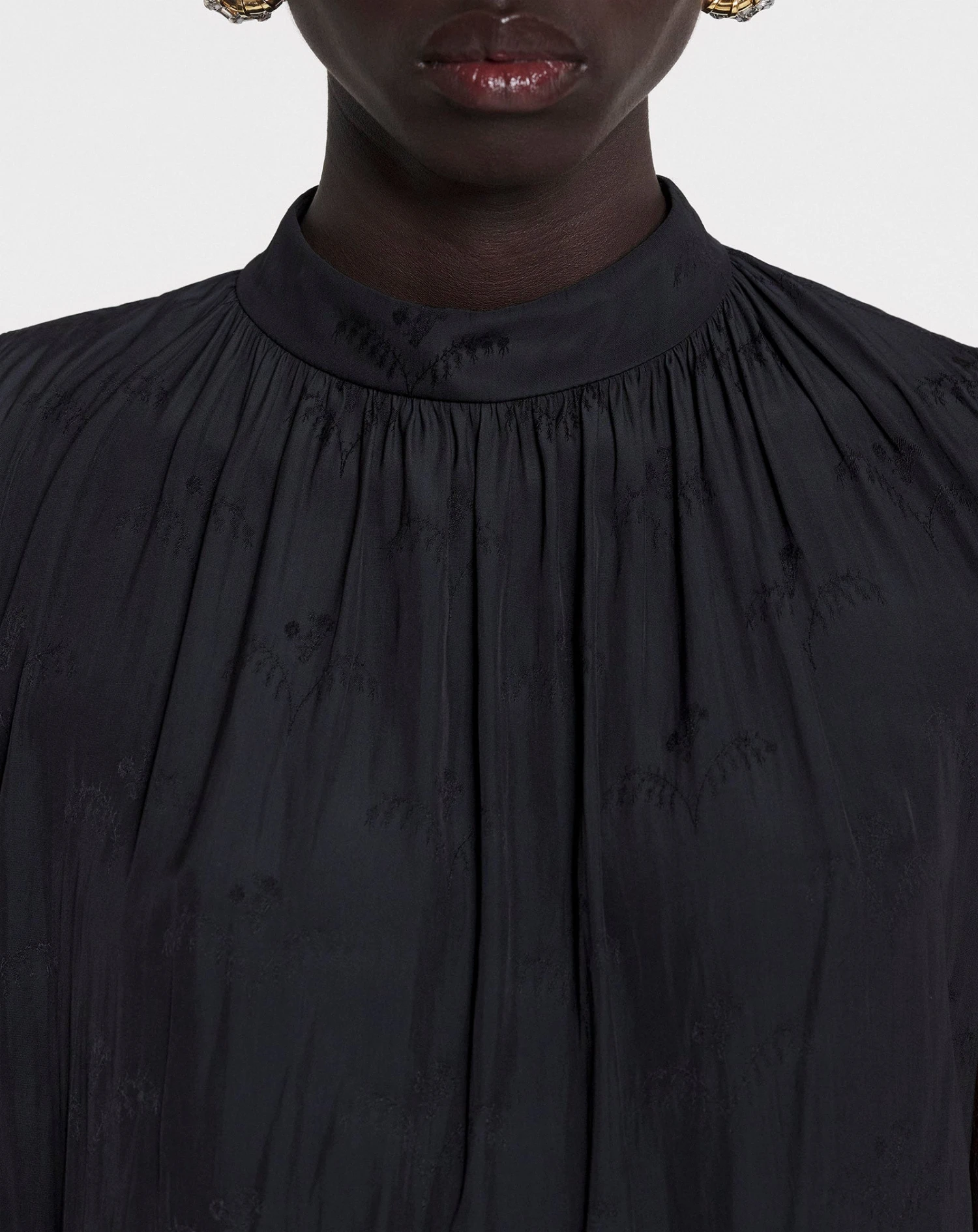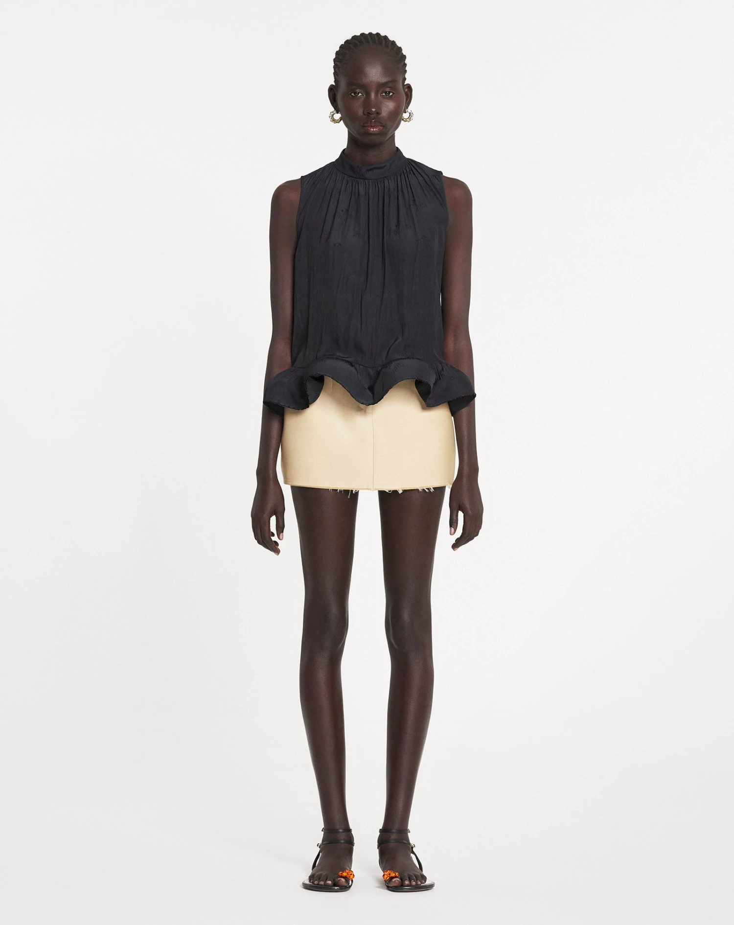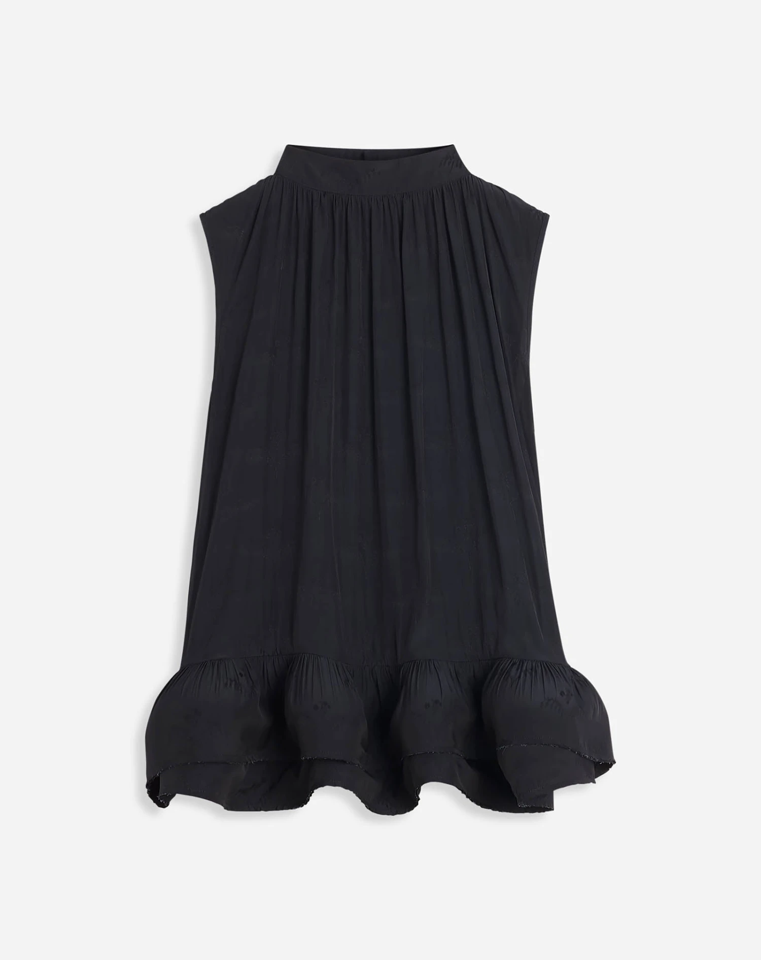 - Sleeveless ruffle top in a floral jacquard Charmeuse