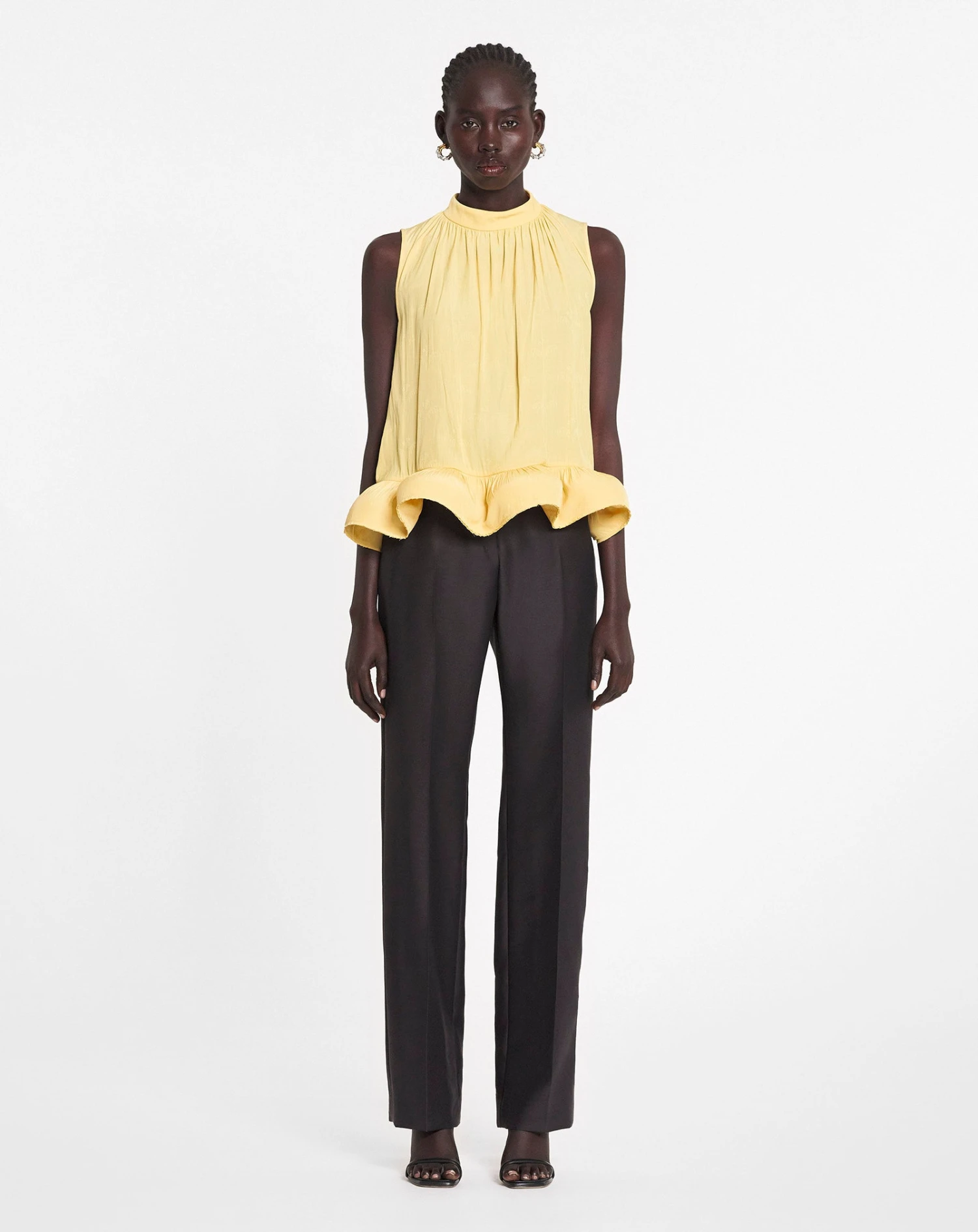 - Sleeveless ruffle top in a floral jacquard Charmeuse