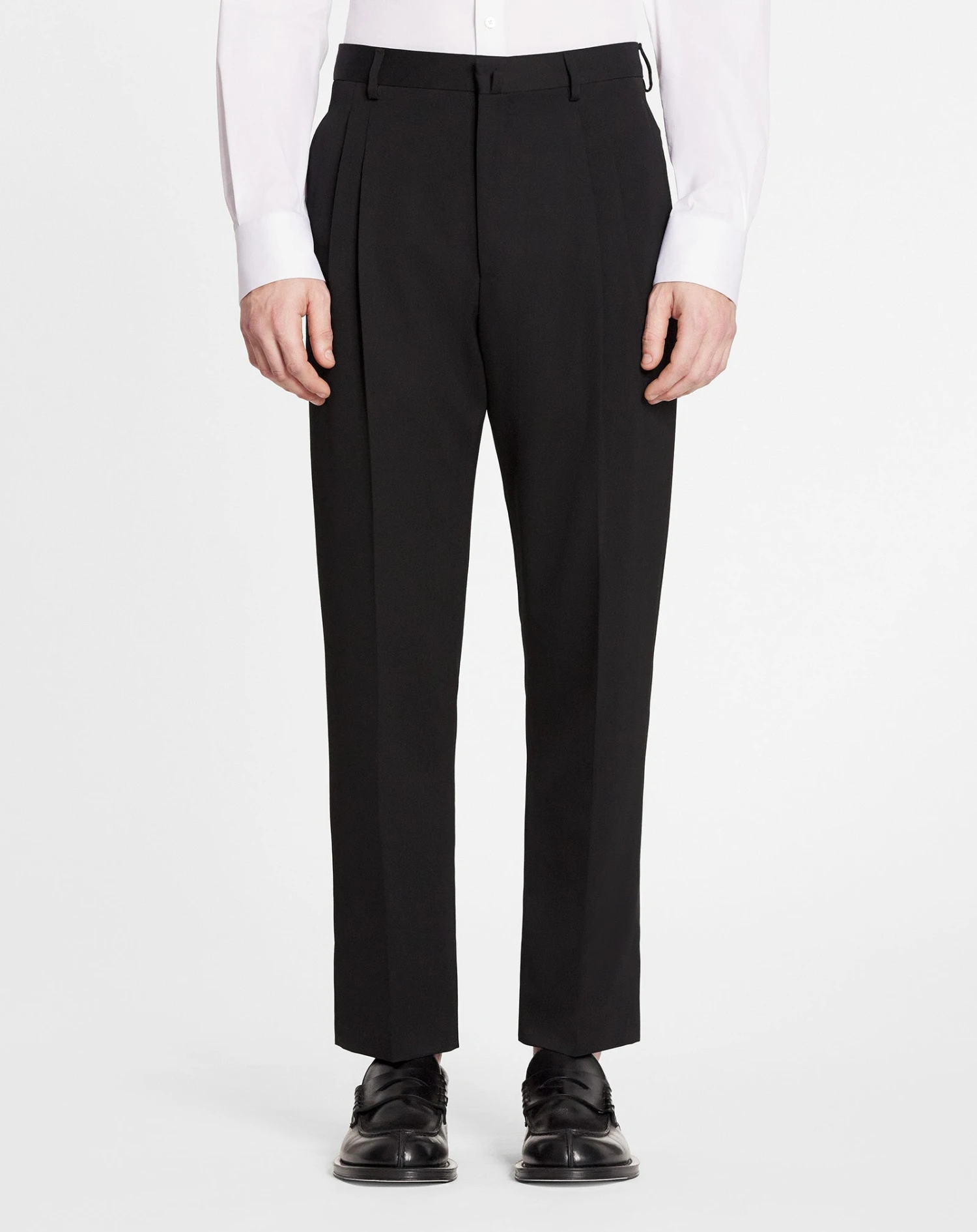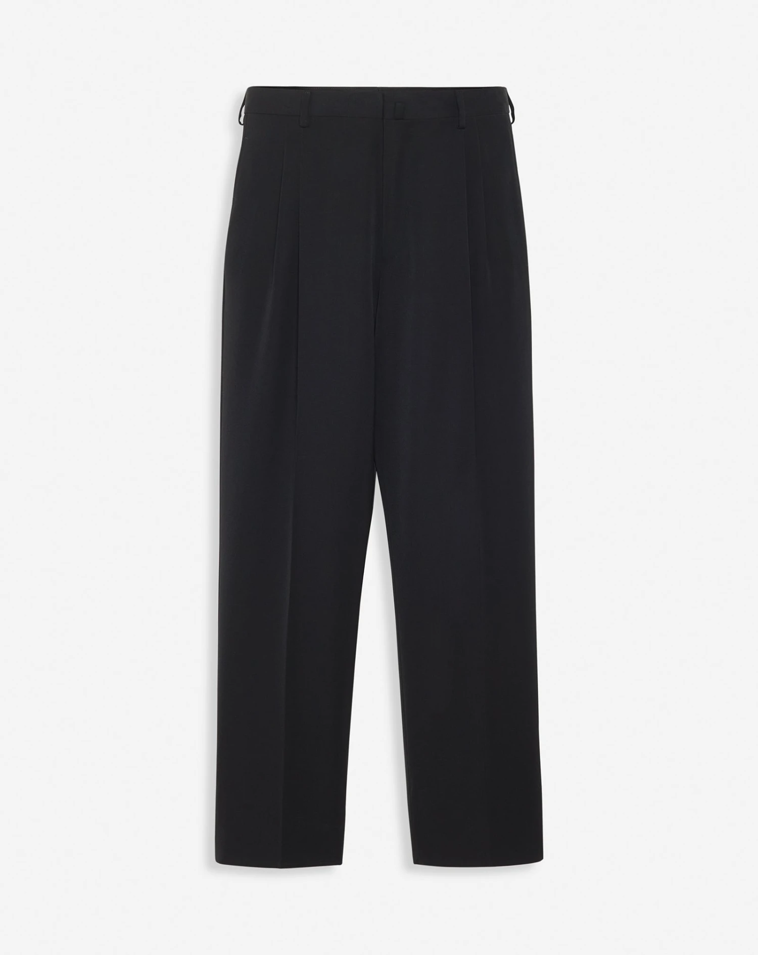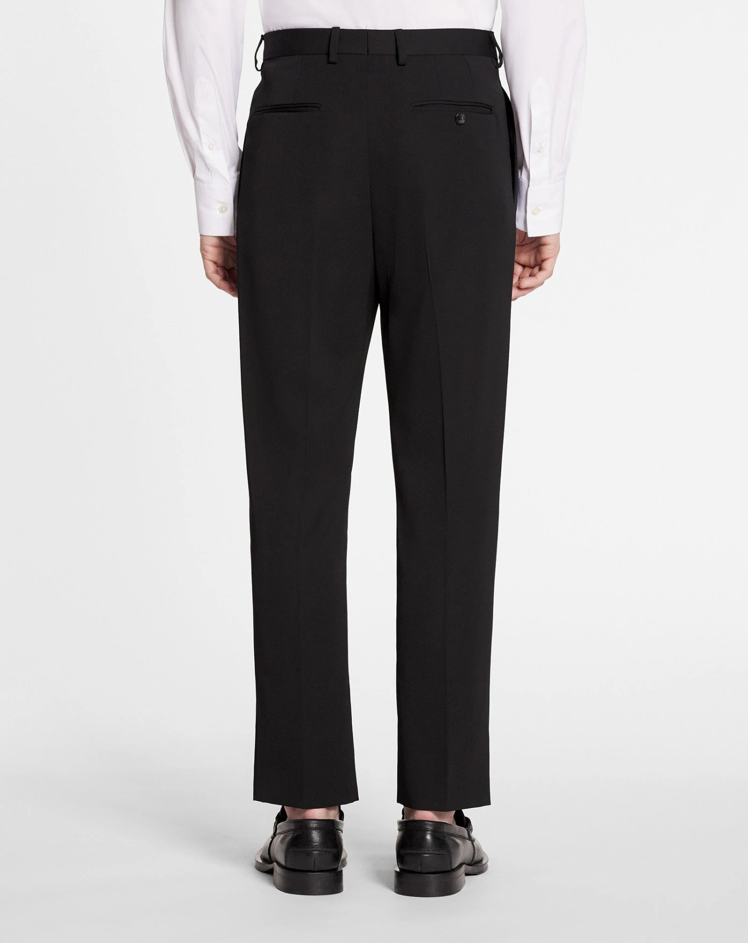 - Straight-leg pants with single darts, pressed creases, slanted pockets on the front and welt pockets on the back
