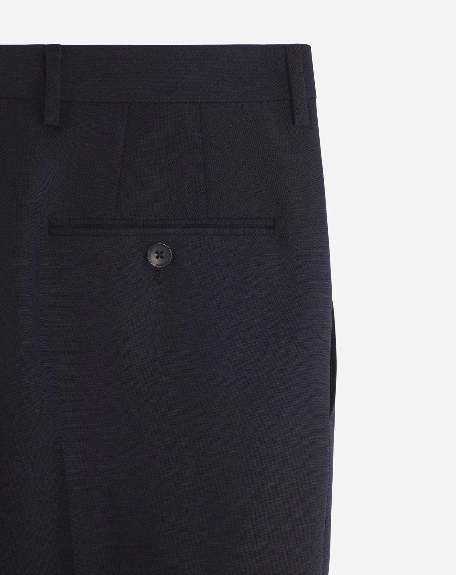 - Straight leg trousers in wool and mohair, featuring a single pleat, italian pockets and double jet pockets on the back.