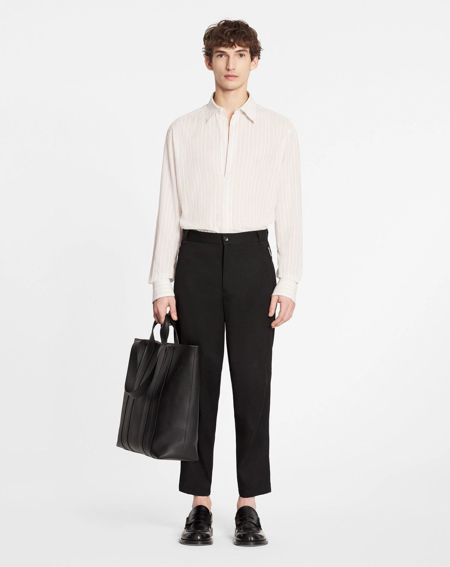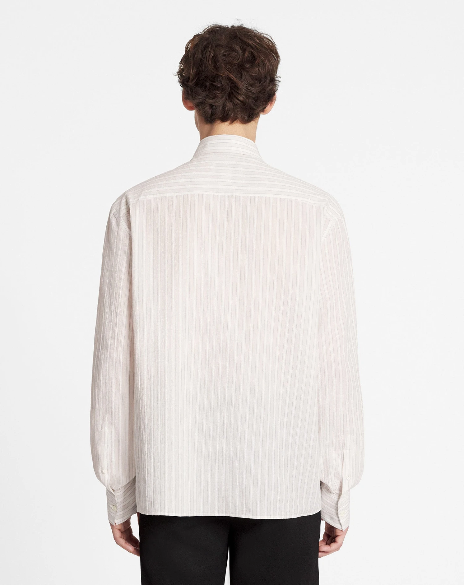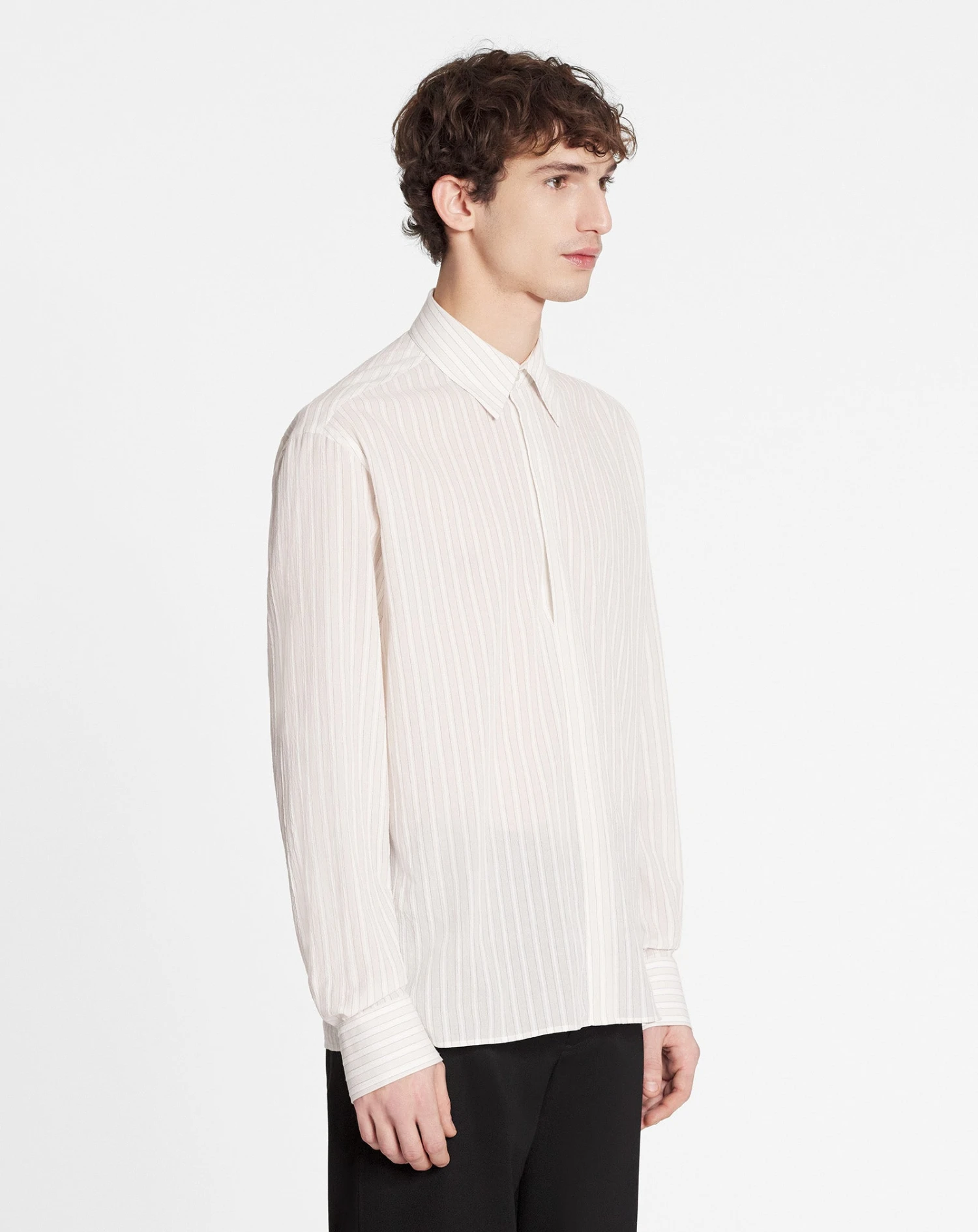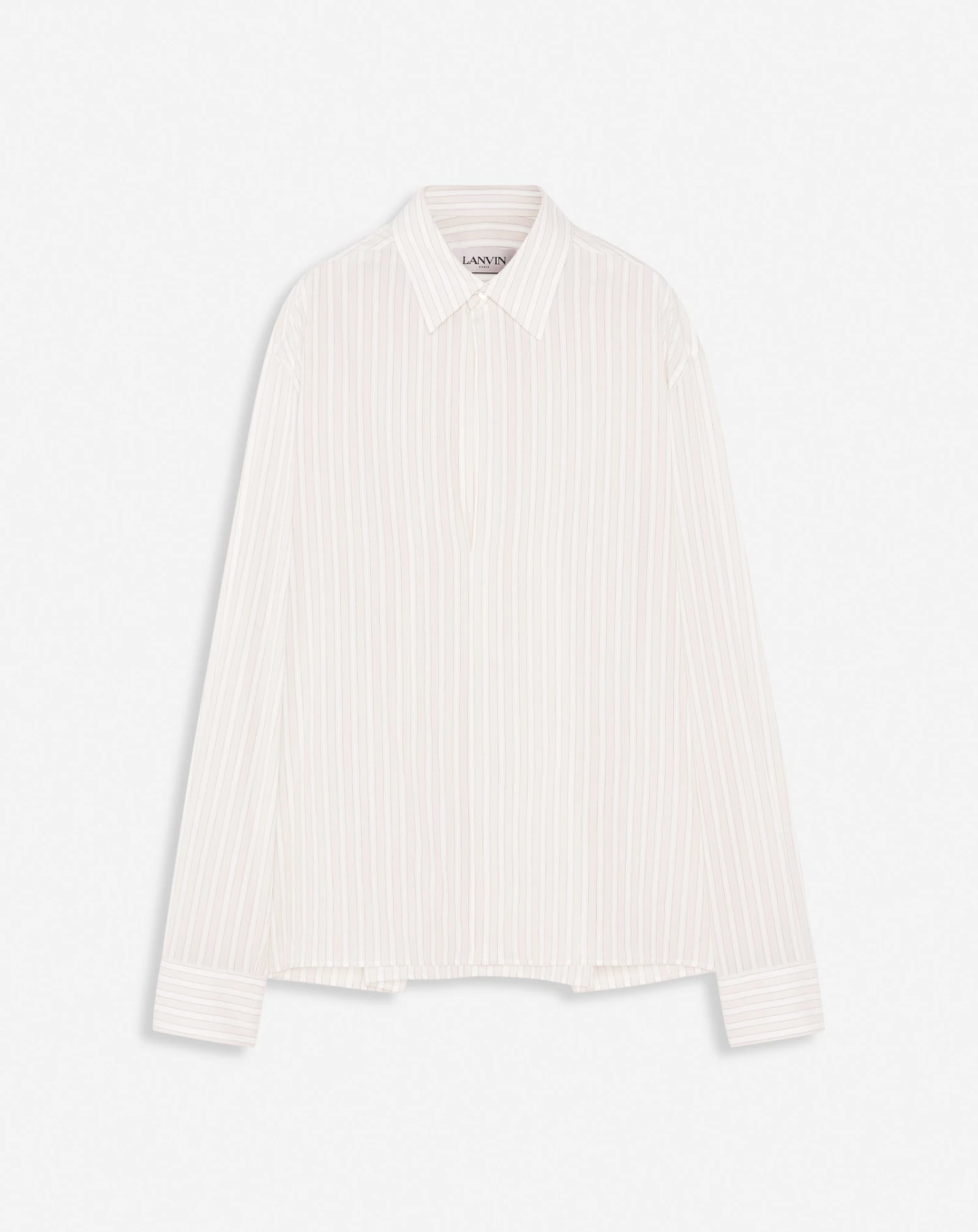 - Cotton poplin semi-open tunic shirt with irregular stripes