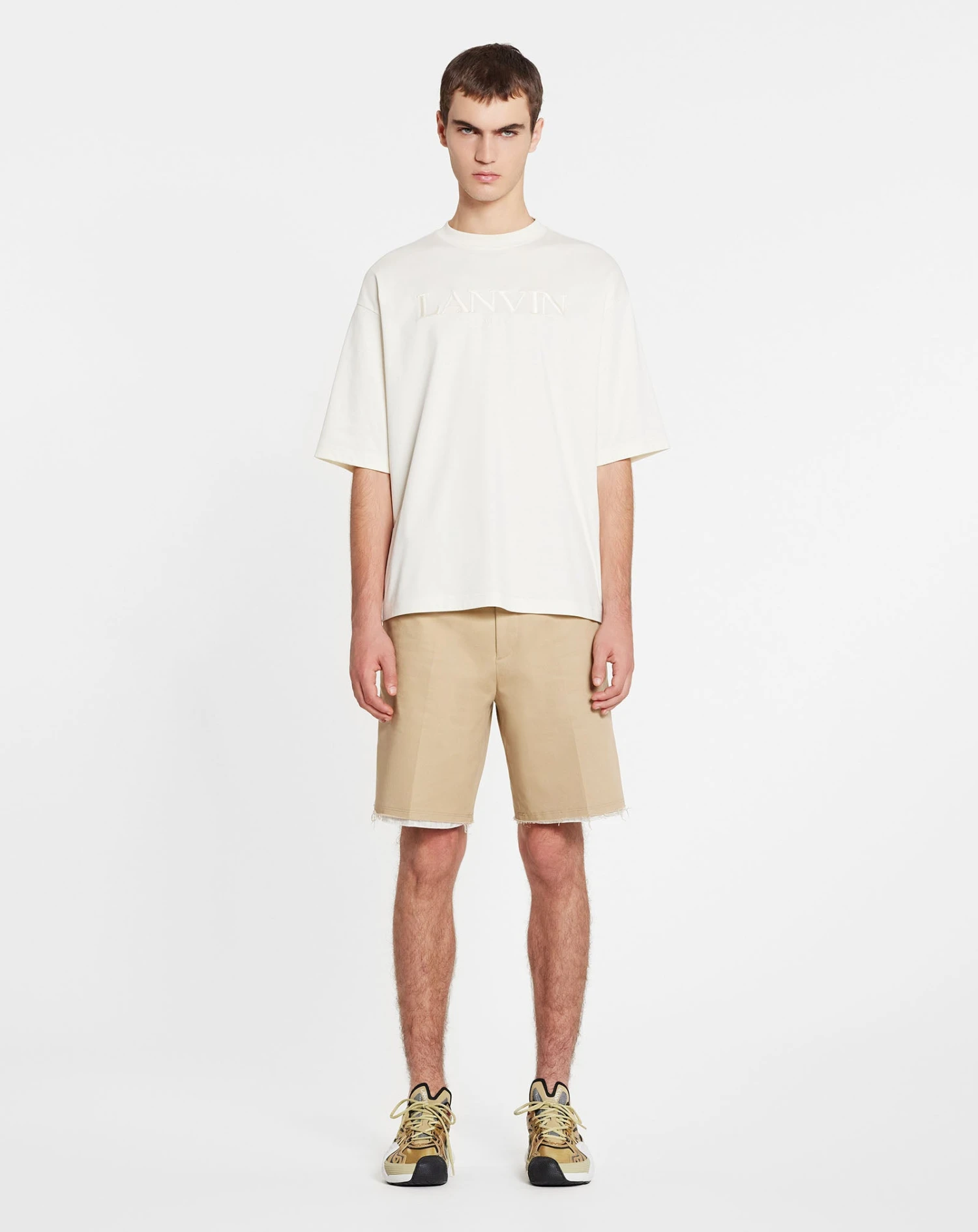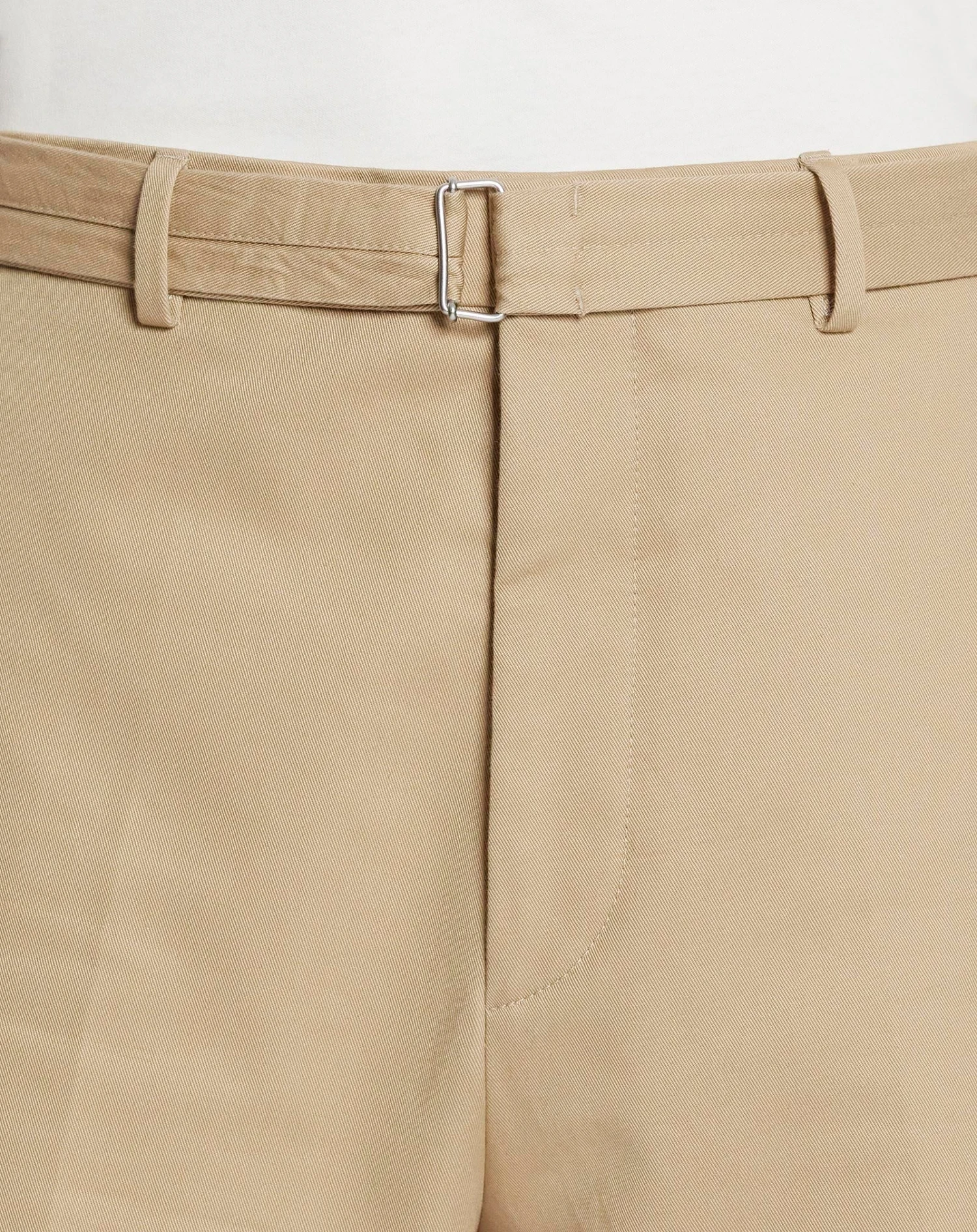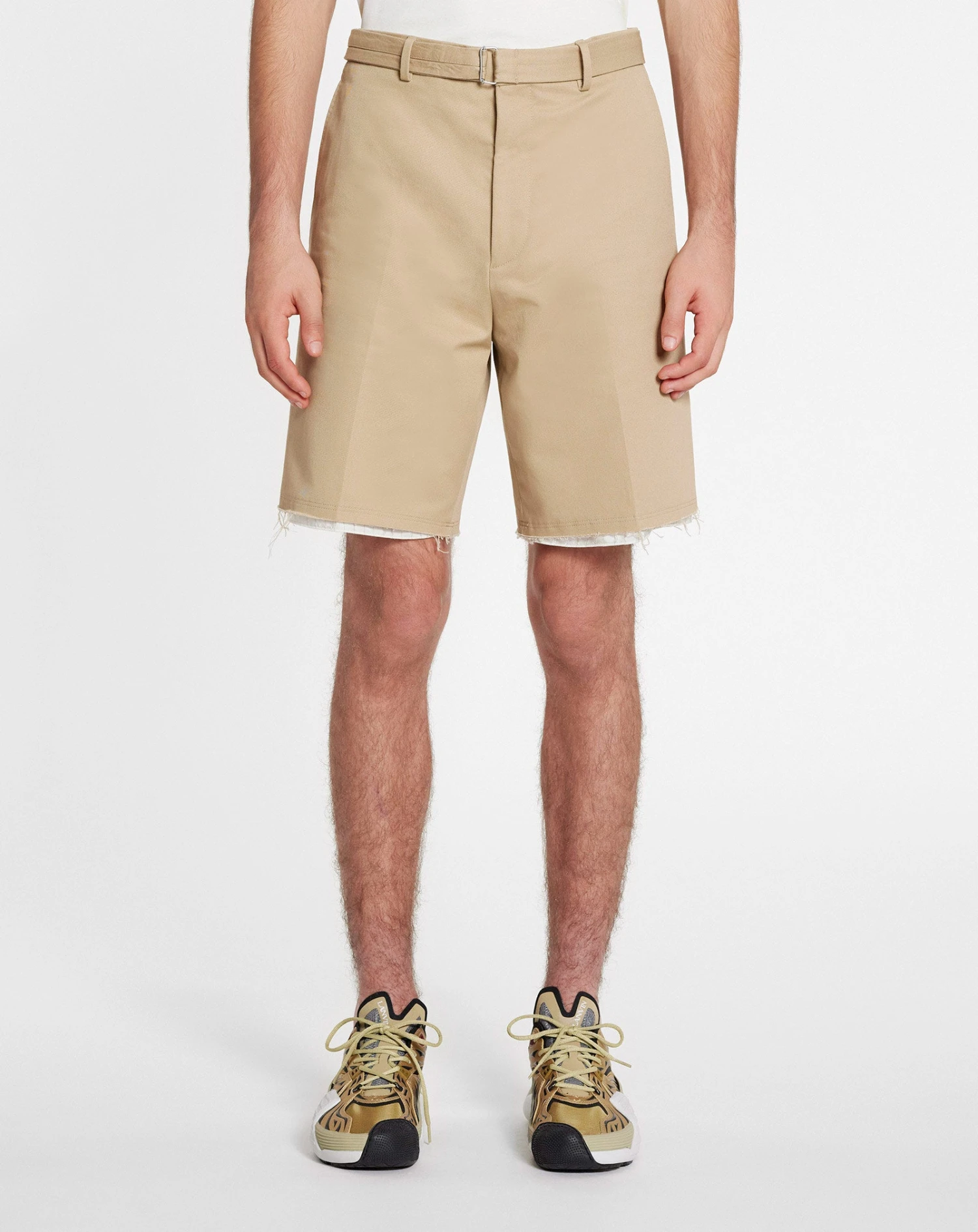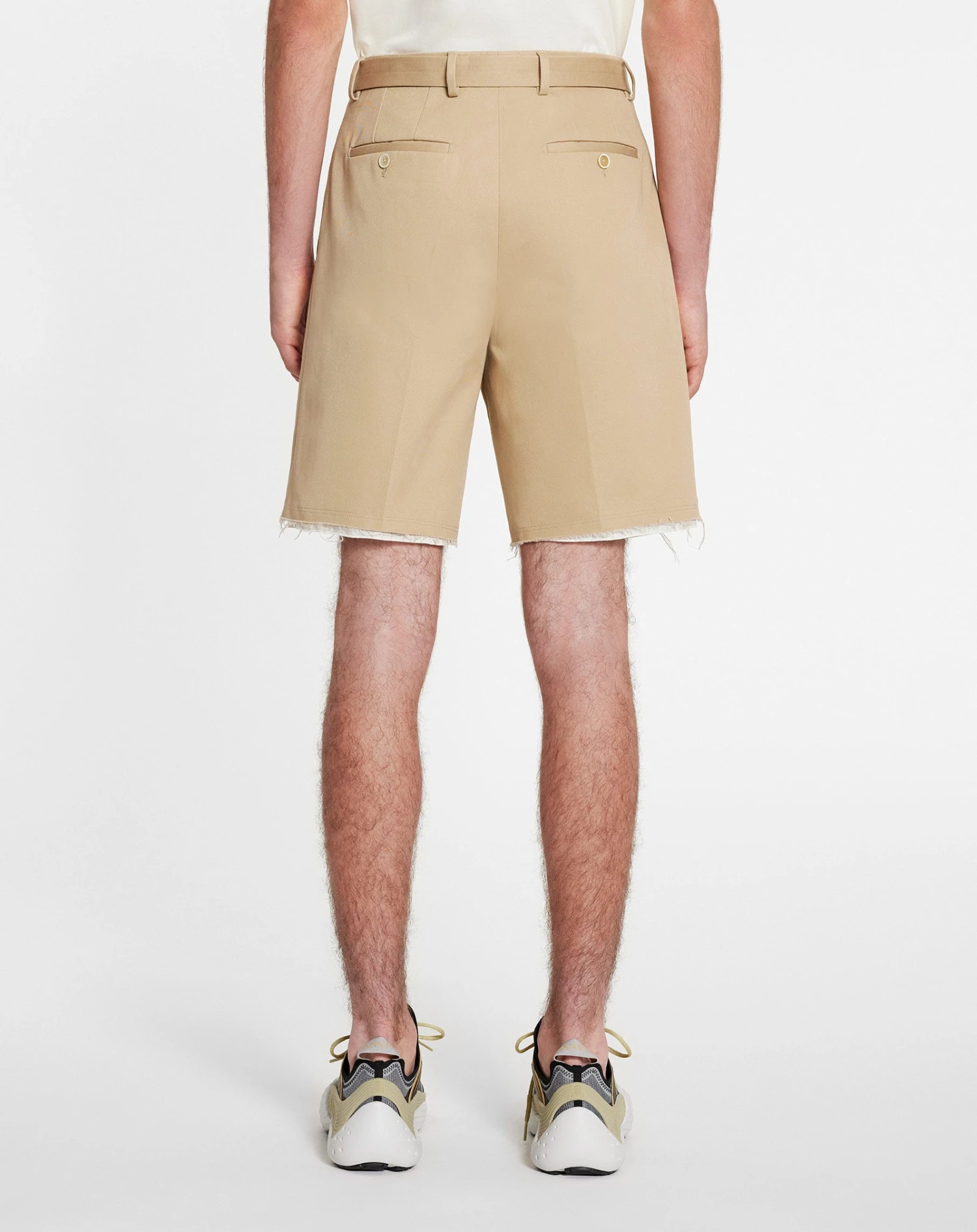 - Tailored shorts with raw hems, a full mulberry silk lining, a removable belt with brushed metal buckle, and slanted pockets