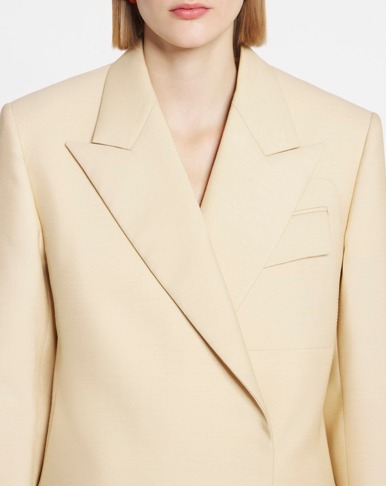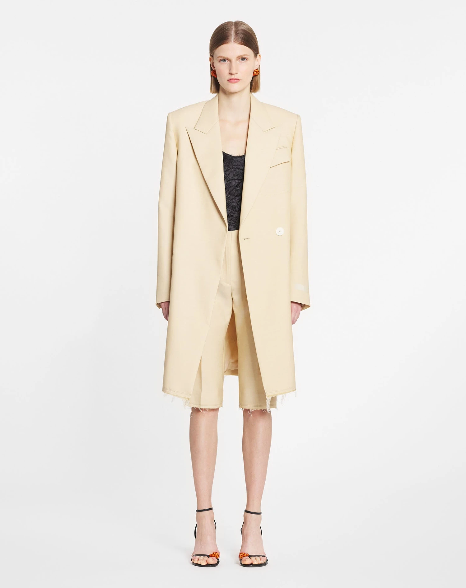 - Tailored straight-fit coat with peak lapels, flap pockets, and raw hems